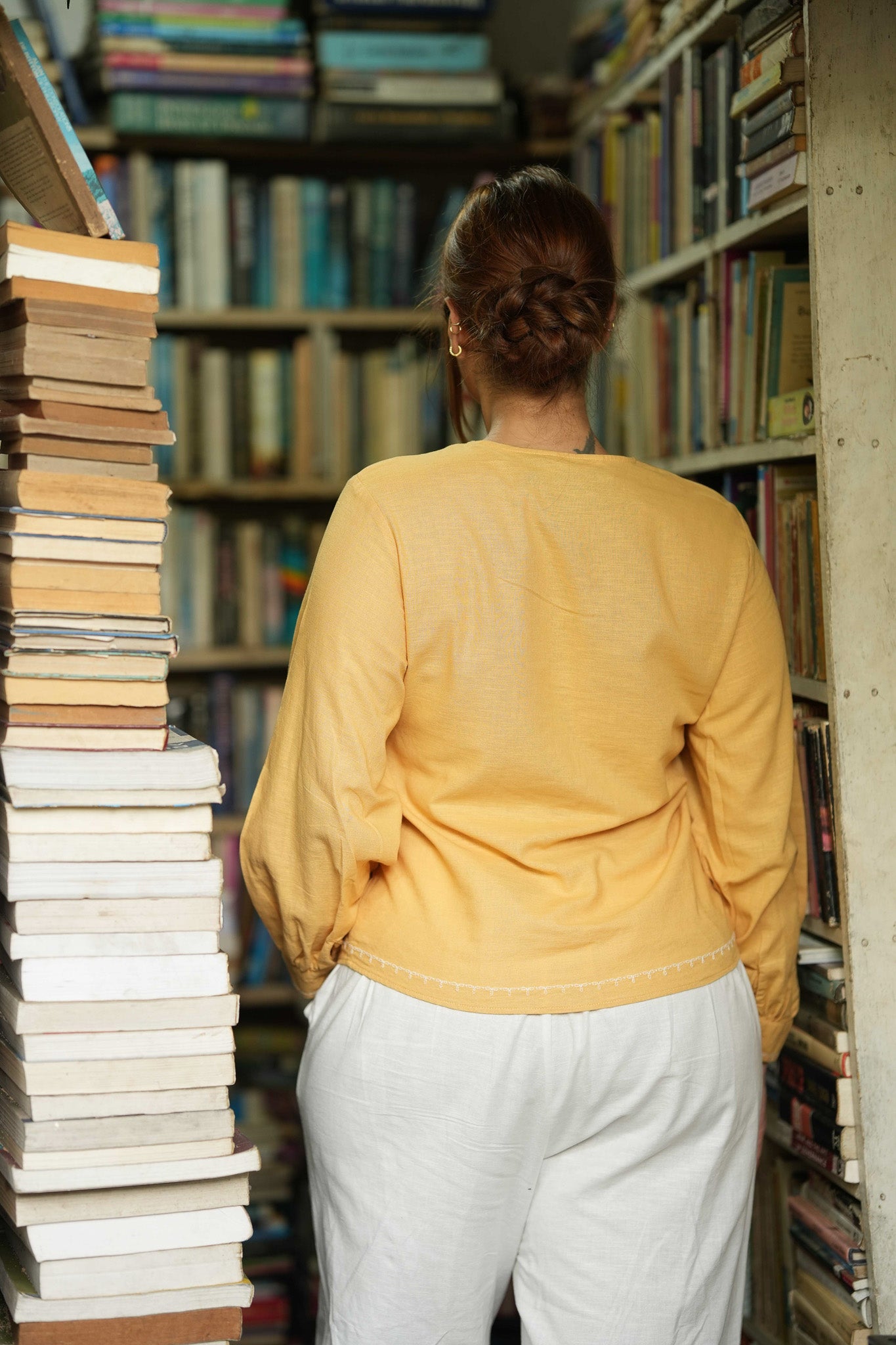 Made from breathable and comfortable linen-cotton fabric, this long sleeve button-down top features a gently curved neckline and subtle embroidery along the hem and sleeve cuffs. The delicate stitched detailing adds a touch of charm to its clean, classic silhouette—perfect for effortless styling, from workdays to weekend wear.