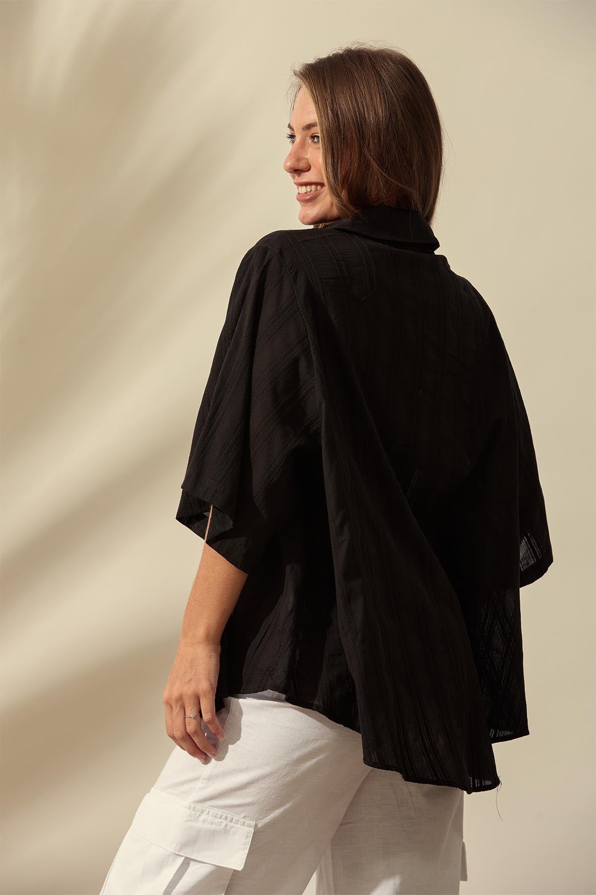 Crafted from breathable textured cotton fabric, this elbow-length sleeve top offers lightweight comfort with a relaxed, loose-fitted silhouette. The button-down front adds a classic finish, making it an easy, versatile piece for effortless everyday style.