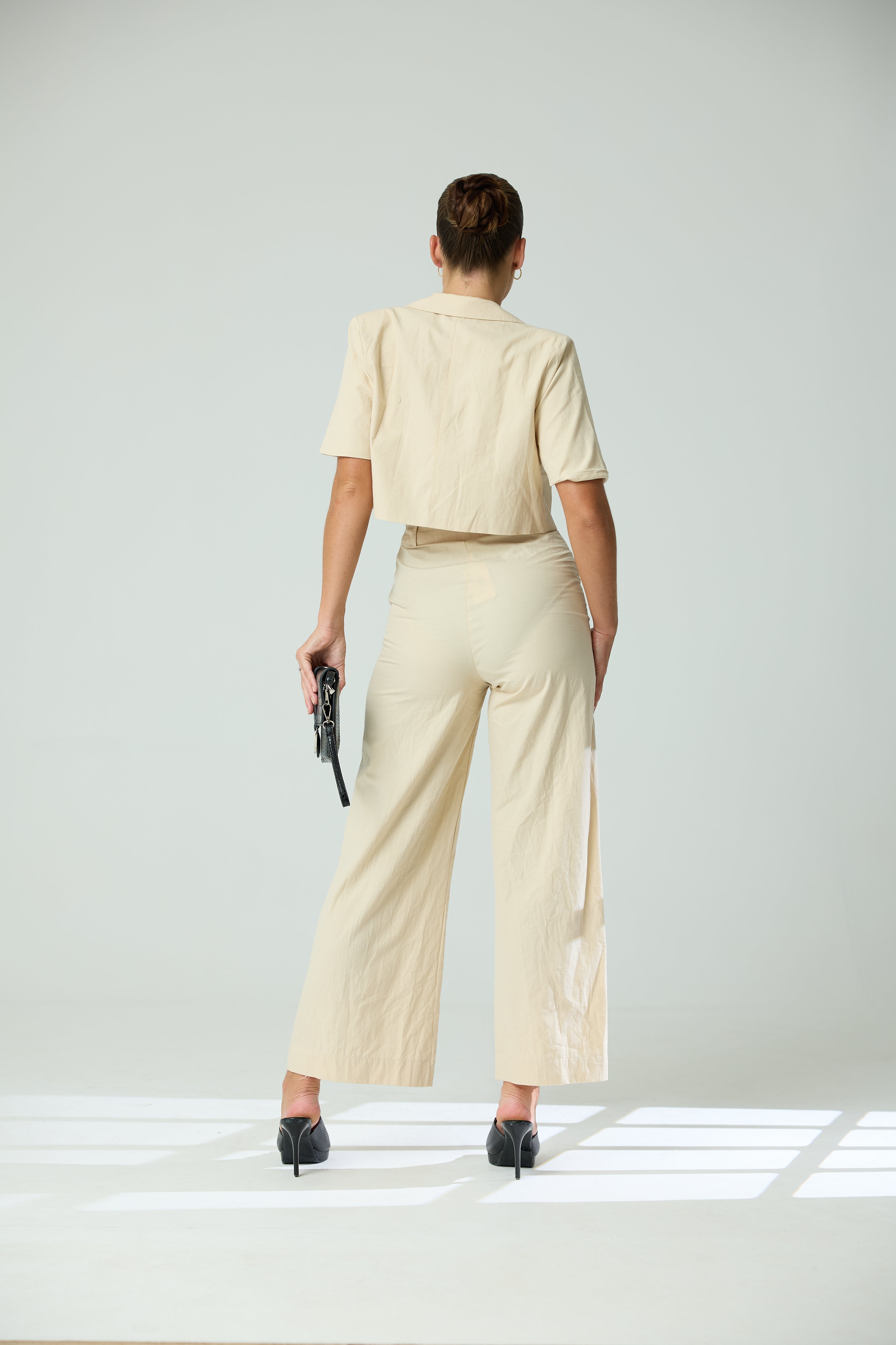 Step into timeless sophistication with this coordinated cotton ensemble. The solid wide-leg pants, crafted from breathable, soft cotton, offer a flattering high-rise silhouette and fluid drape for all-day comfort and movement. Paired with a tailored blazer featuring clean lines, a structured shoulder, and a single-button closure, this set brings a modern twist to classic tailoring. Whether you’re heading to the office or dressing up for a brunch date, this versatile duo balances comfort and polish with ease. Style it with a tucked-in blouse and heels for a refined finish, or keep it casual with sneakers and a tee.