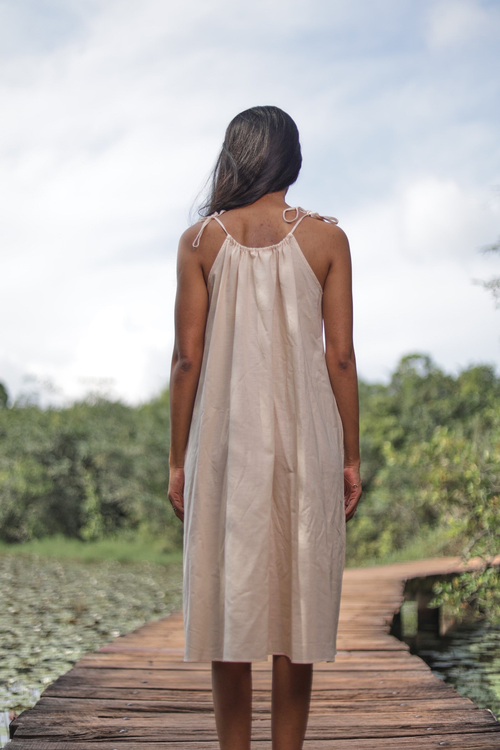 This solid midi-length dress is crafted from breathable linen-cotton fabric for all-day comfort. Designed with an oversized, relaxed silhouette, it features functional side pockets and adjustable tie straps for a customizable fit. Effortlessly stylish, this versatile piece is perfect for warm-weather days, casual outings, or laid-back weekends. Lightweight and easy to wear, it blends comfort, practicality, and understated elegance for a timeless wardrobe essential.