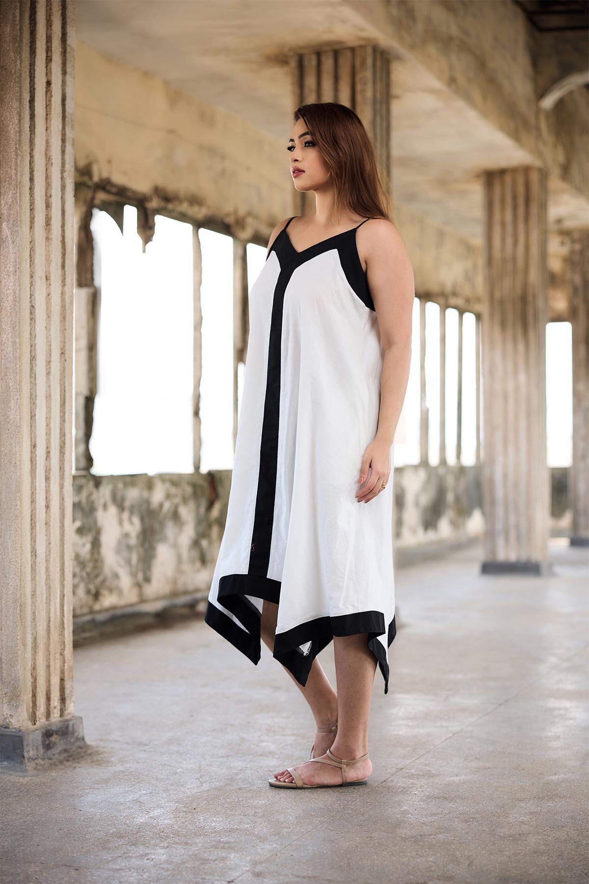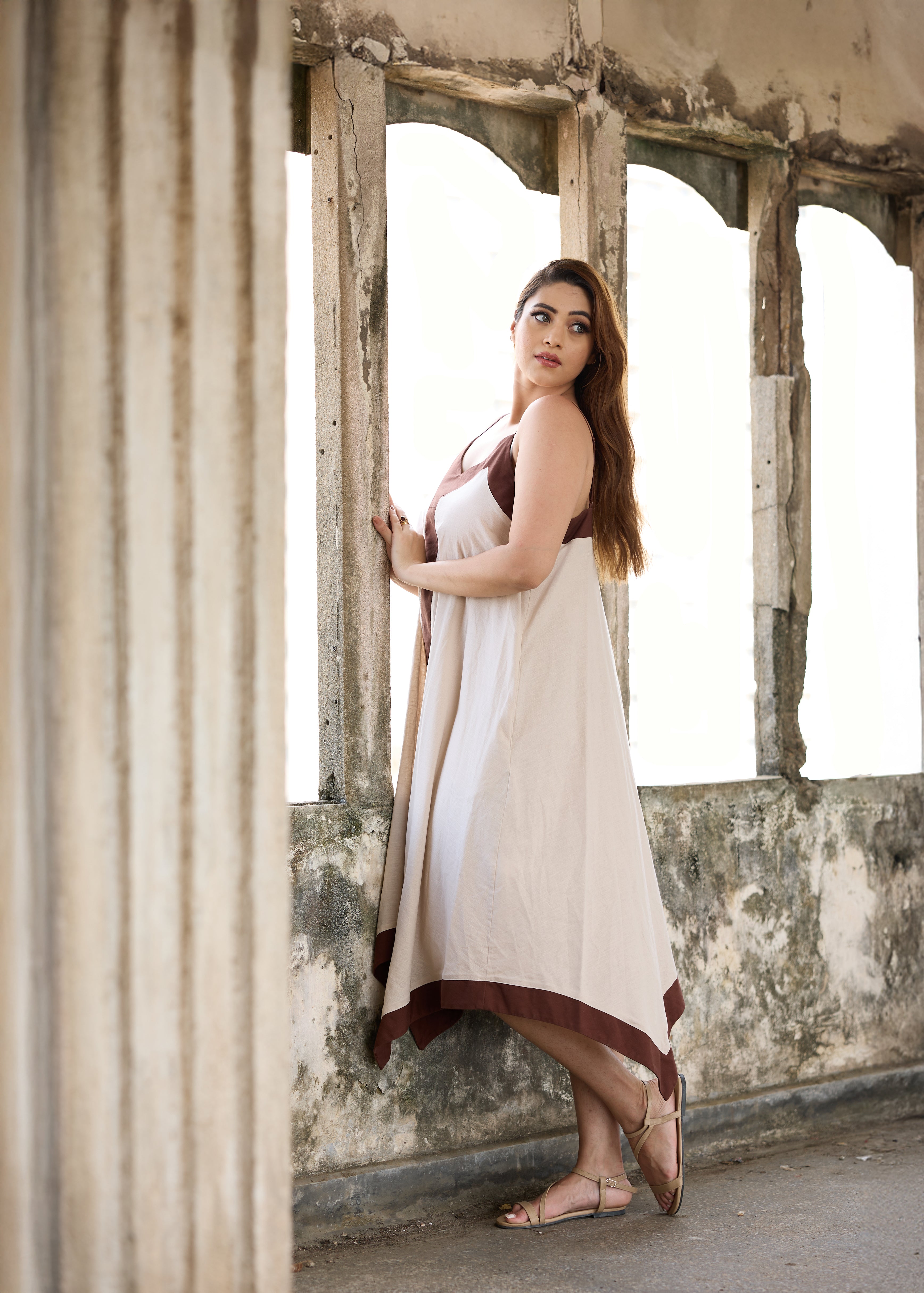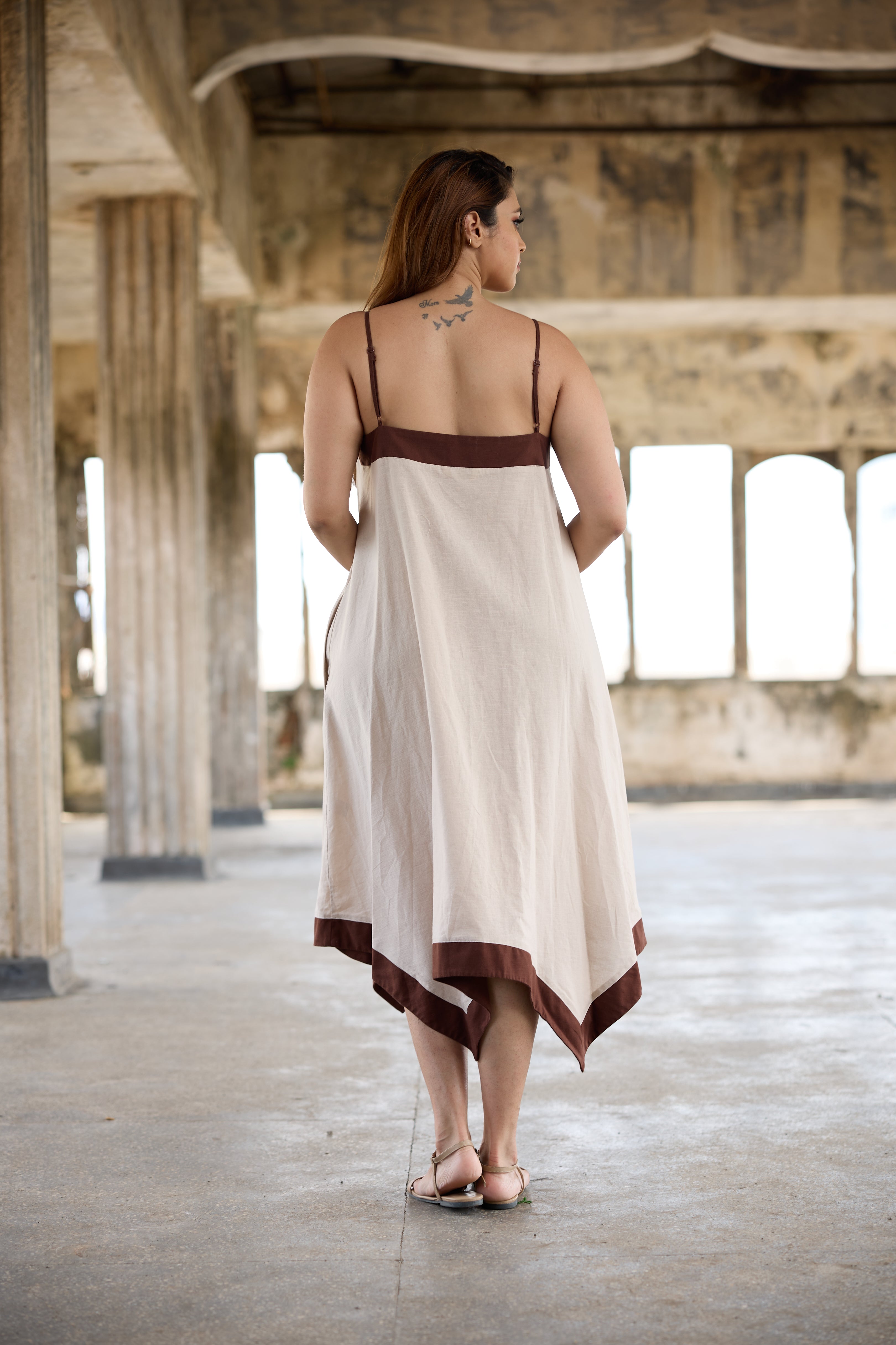 Effortlessly cool and easy to wear, this loose-fitted midi dress is crafted from breathable linen-cotton fabric for all-day comfort. Designed with adjustable straps and a deep V-neckline, it features subtle contrast detailing that adds a modern edge. Finished with side pockets for everyday ease, it's the perfect blend of relaxed charm and thoughtful design.
