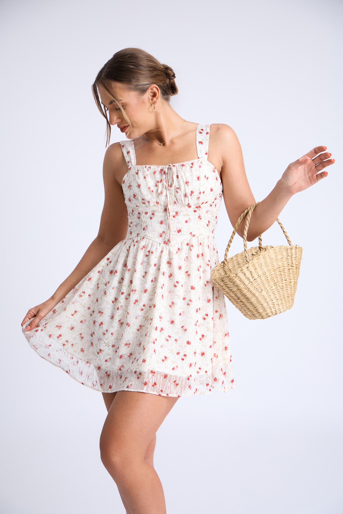 This dress is a charming and feminine piece, perfect for a sunny day. It features a fitted, corset-style bodice with delicate shirring and boning details, creating a flattering and structured silhouette. The square neckline is both classic and on-trend, framed by thin, adjustable straps for a customized fit. A dainty bow tie detail at the bust adds a playful and romantic touch. The fabric is a lightweight and airy material, likely cotton or a cotton blend, in a crisp white or cream color. It is adorned with a delicate all-over print of small, blush pink floral motifs, giving it a whimsical and cottagecore-inspired feel. The waist is cinched, flowing into a relaxed and breezy A-line skirt. The hemline of the mini-dress is tiered and finished with a subtle ruffle, adding movement and a soft, flirty detail to the overall design. The dress's construction and detailing suggest a blend of vintage-inspired romance with modern summer style.