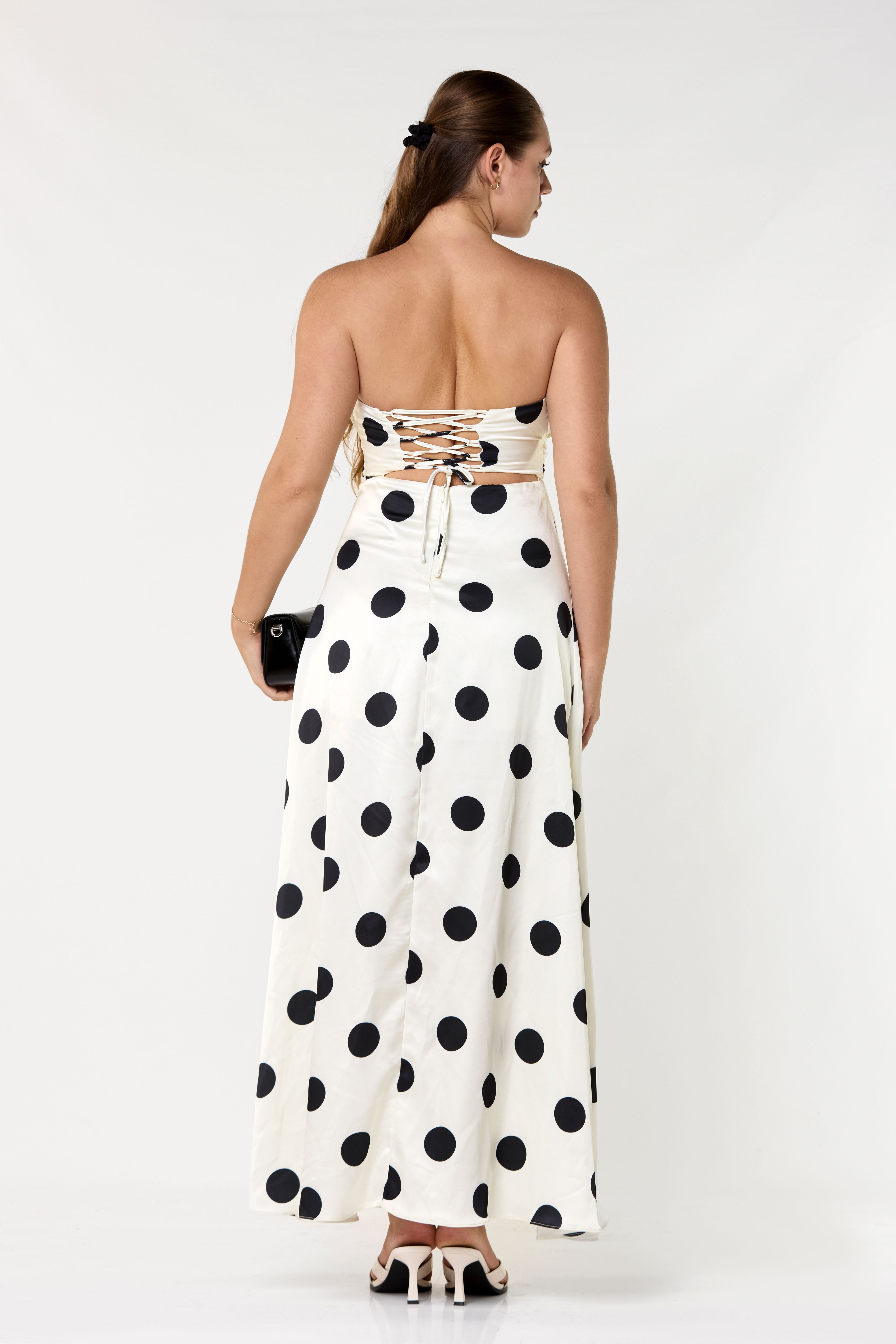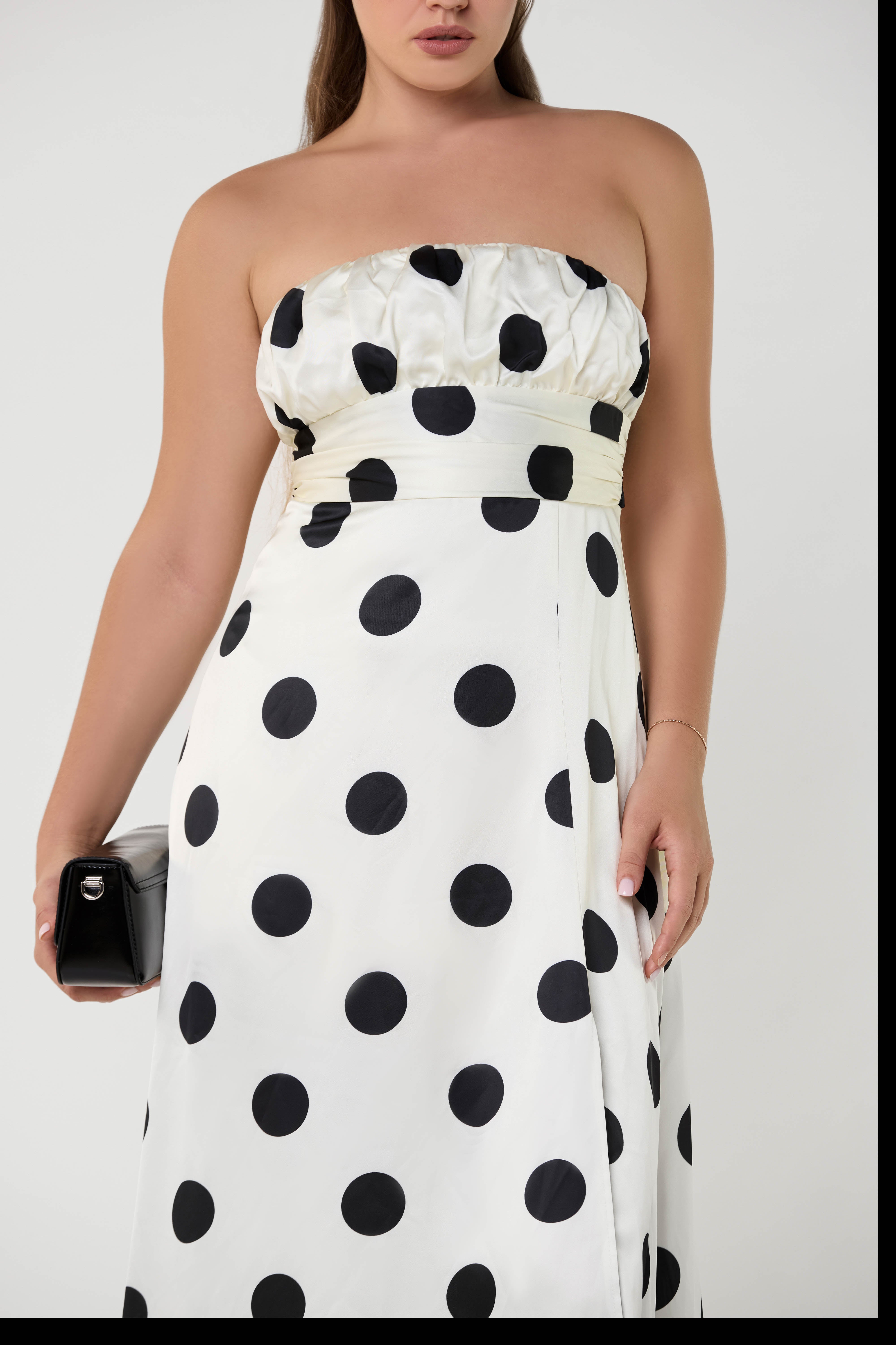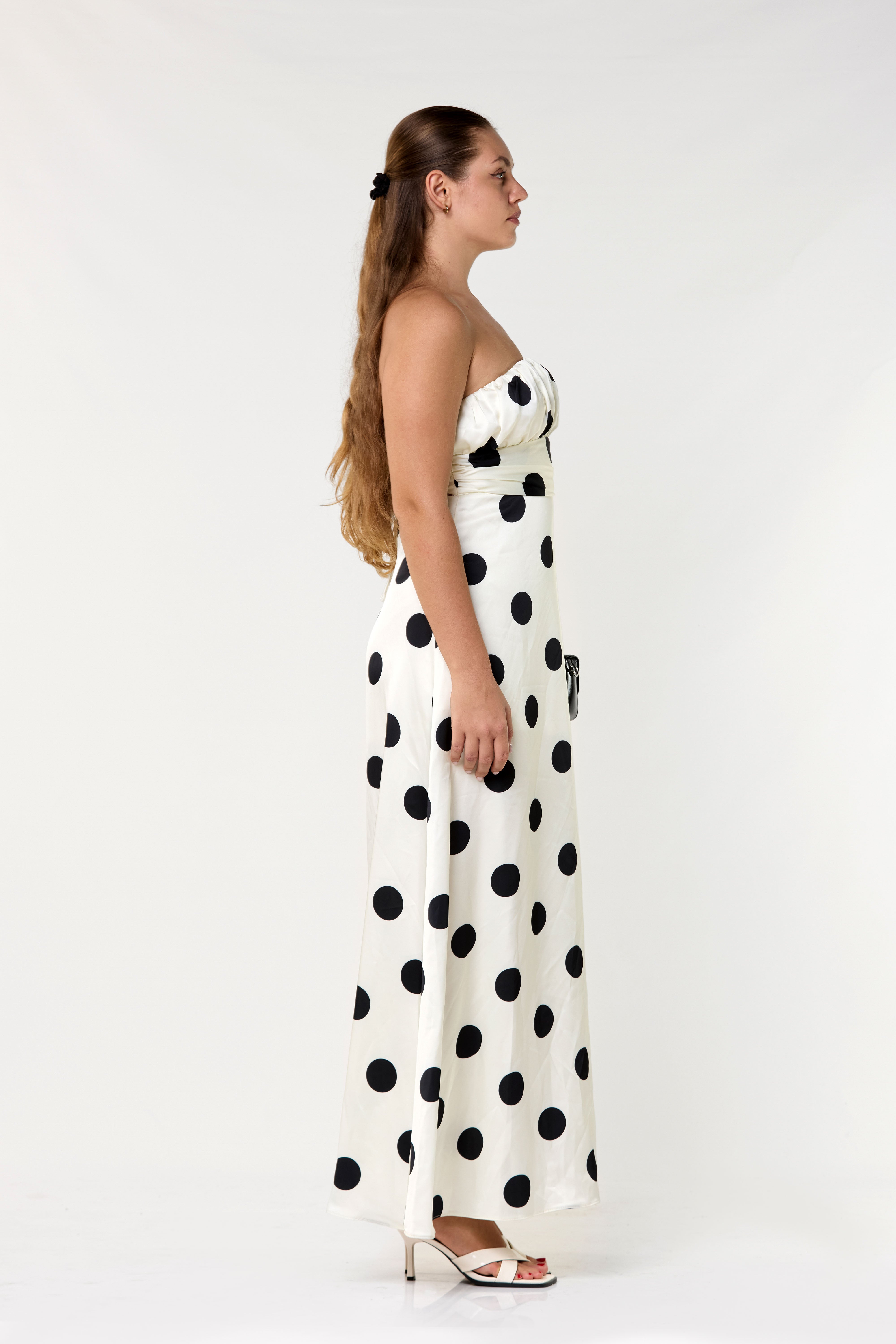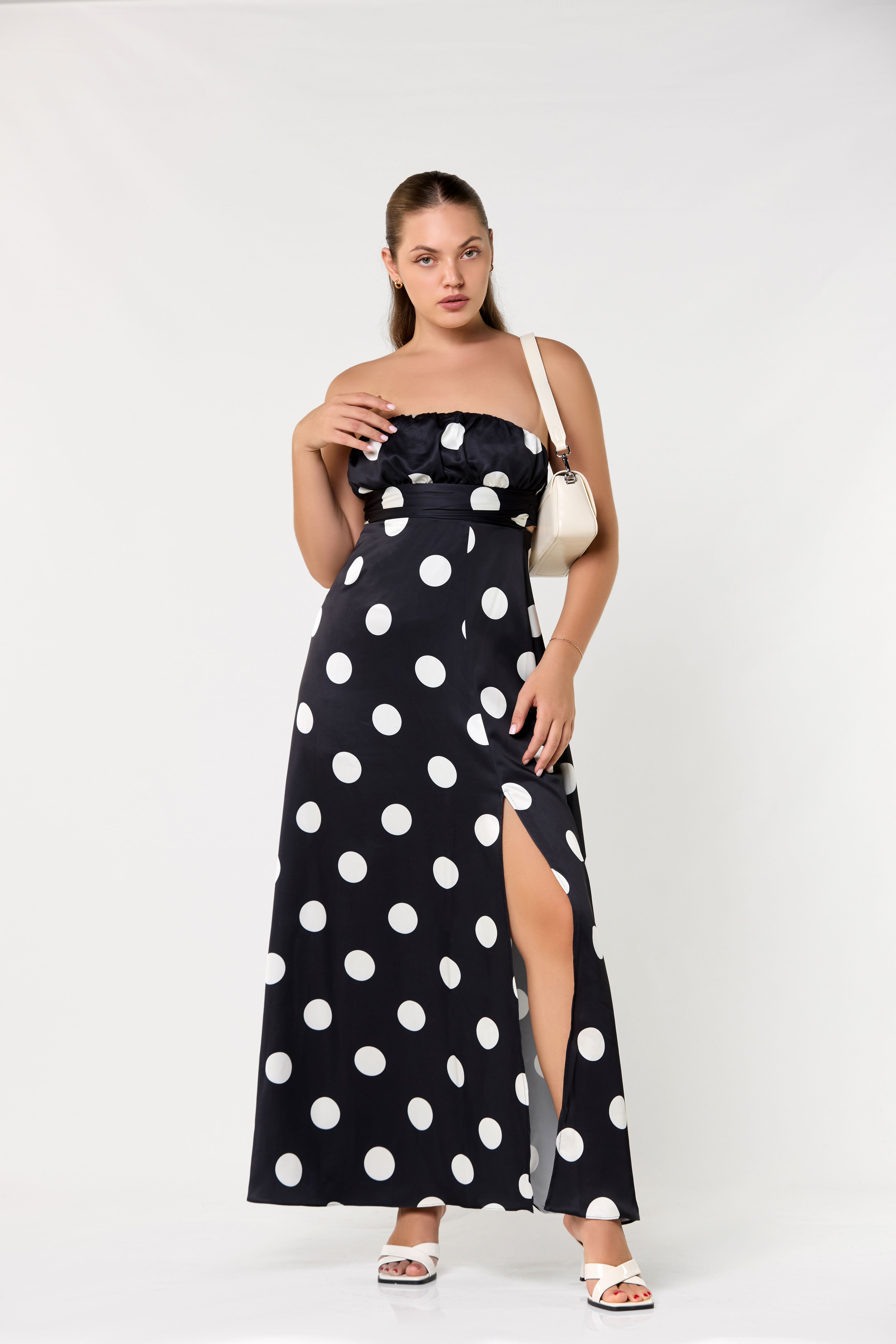 This striking strapless gown features a bold, oversized polka-dot print for a high-fashion, retro-inspired look. The design is defined by a sculptural, gathered bodice and a sleek empire waist that flows into a floor-length skirt. A daring thigh-high slit adds a modern, sophisticated edge to this timeless silhouette.