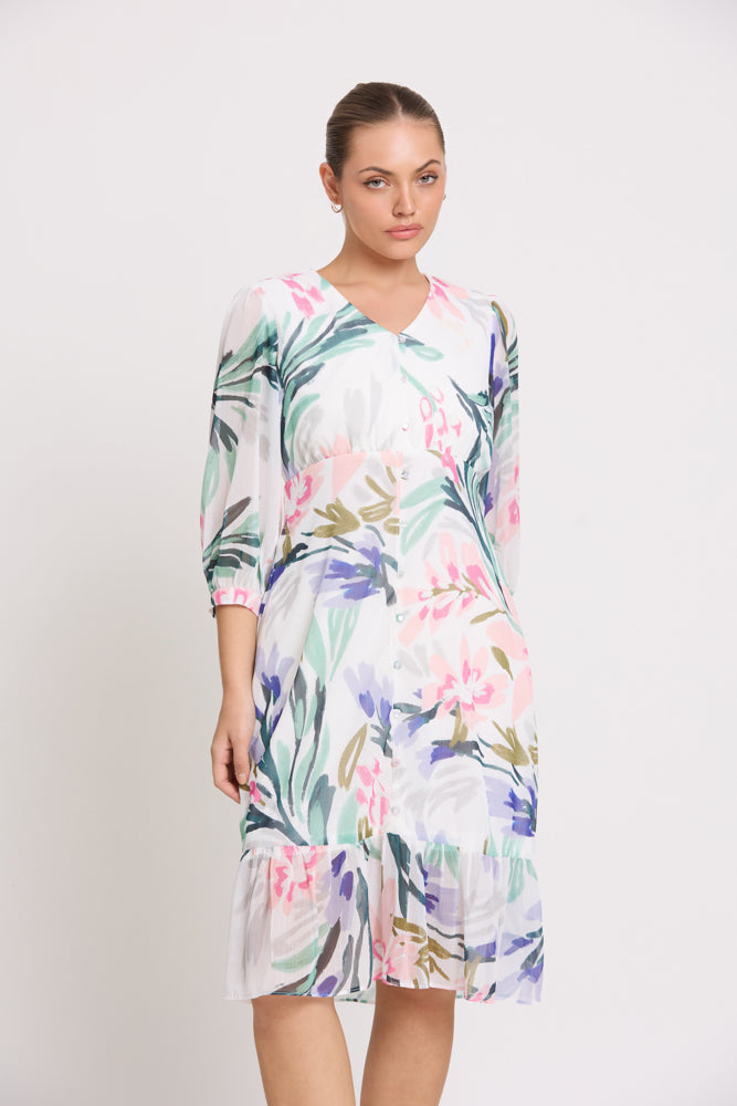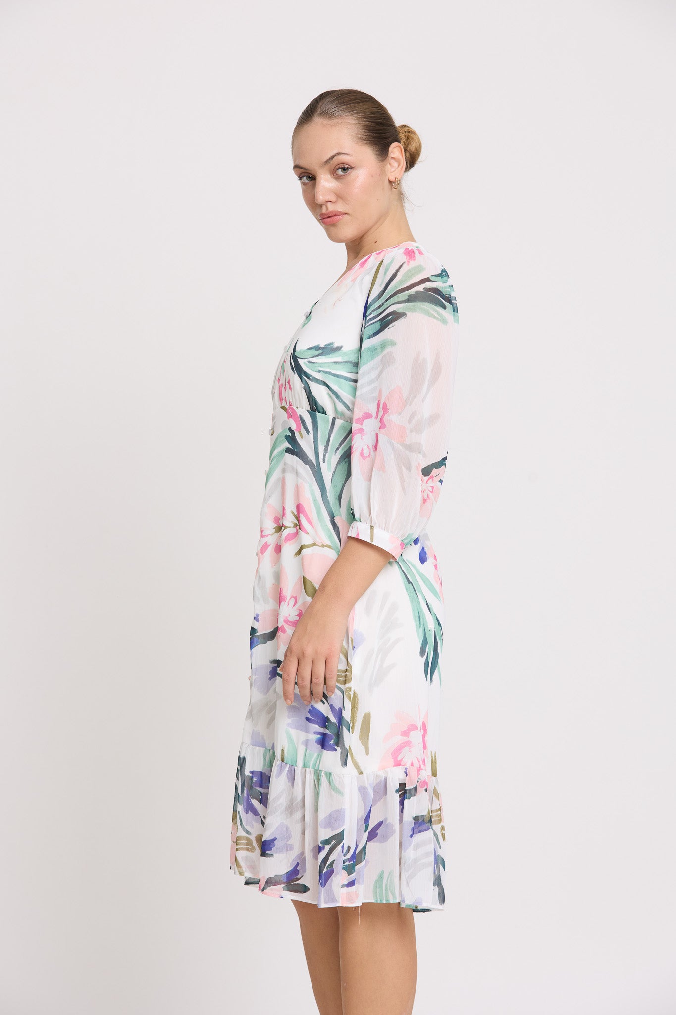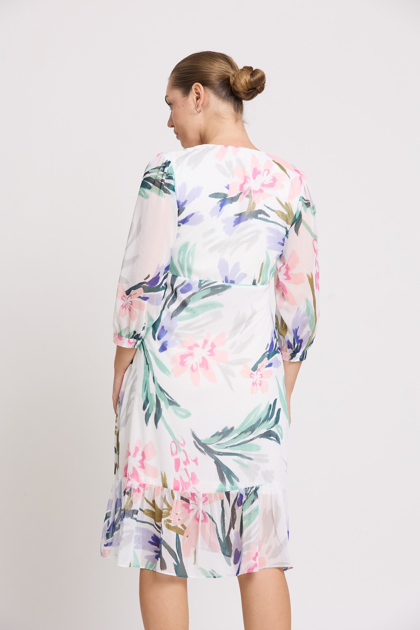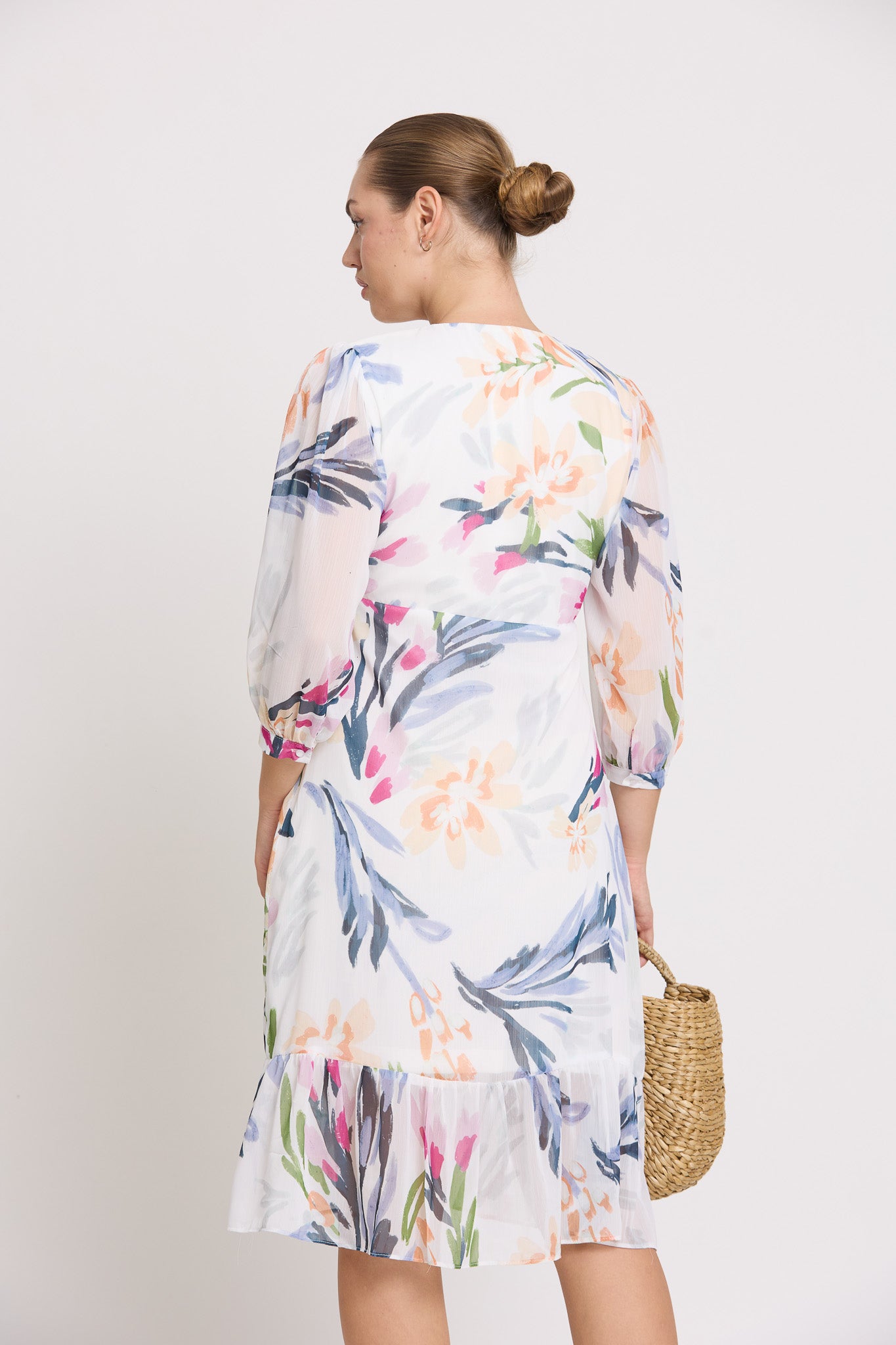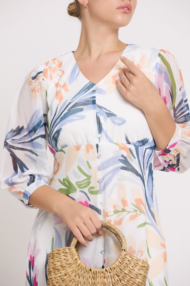 Gorgeous watercolor-inspired floral print in pastel pinks, lavenders, greens, and soft whites—evoking a hand-painted garden vibeA flattering V-neck that draws attention upward.