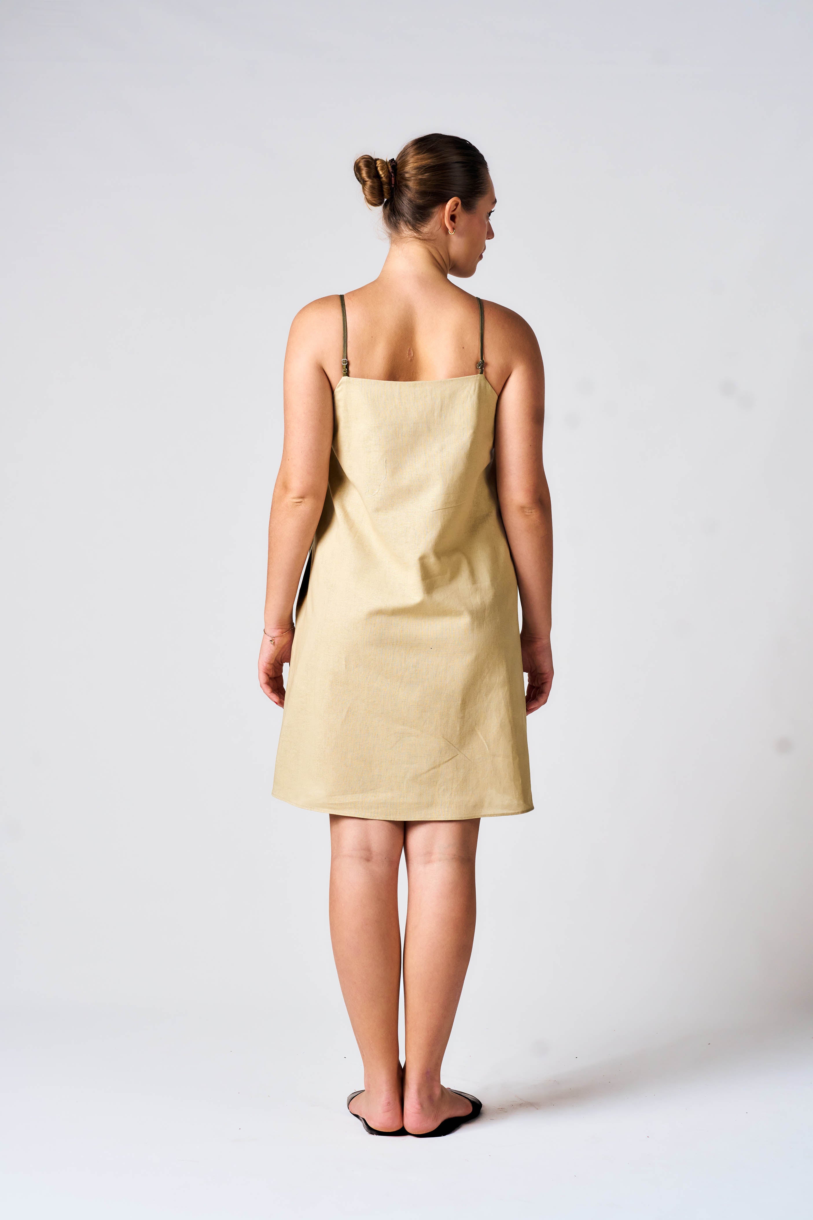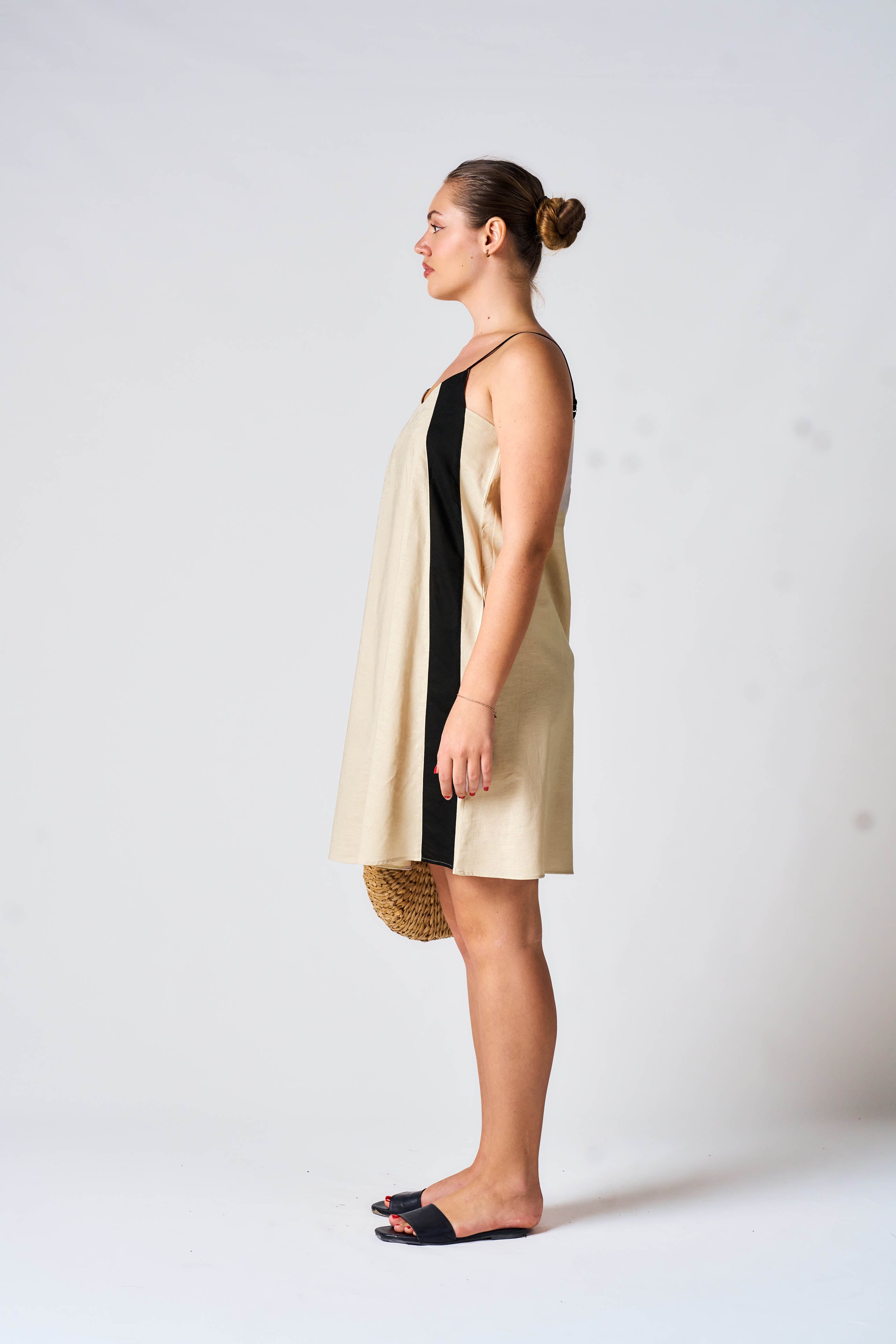 This knee-length dress features a flattering V-neckline with adjustable straps for a customizable fit. Designed with a side contrast panel, it adds a modern touch to a clean, relaxed silhouette. Crafted from comfortable, breathable fabric, the loose fit ensures all-day ease. Finished with practical side pockets, this versatile piece is perfect for warm-weather styling, casual days, and effortless everyday wear.