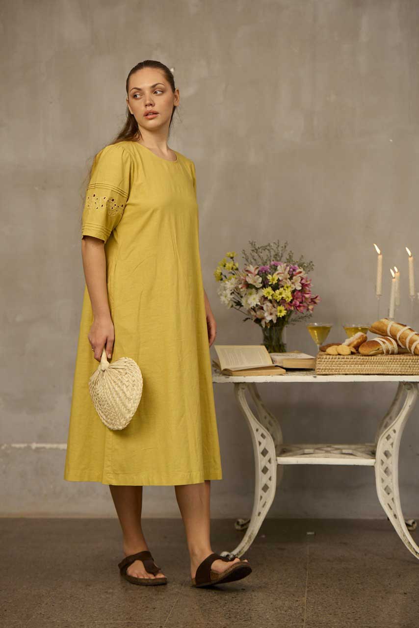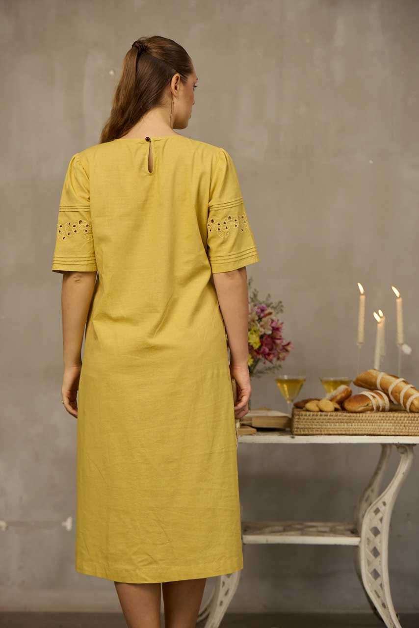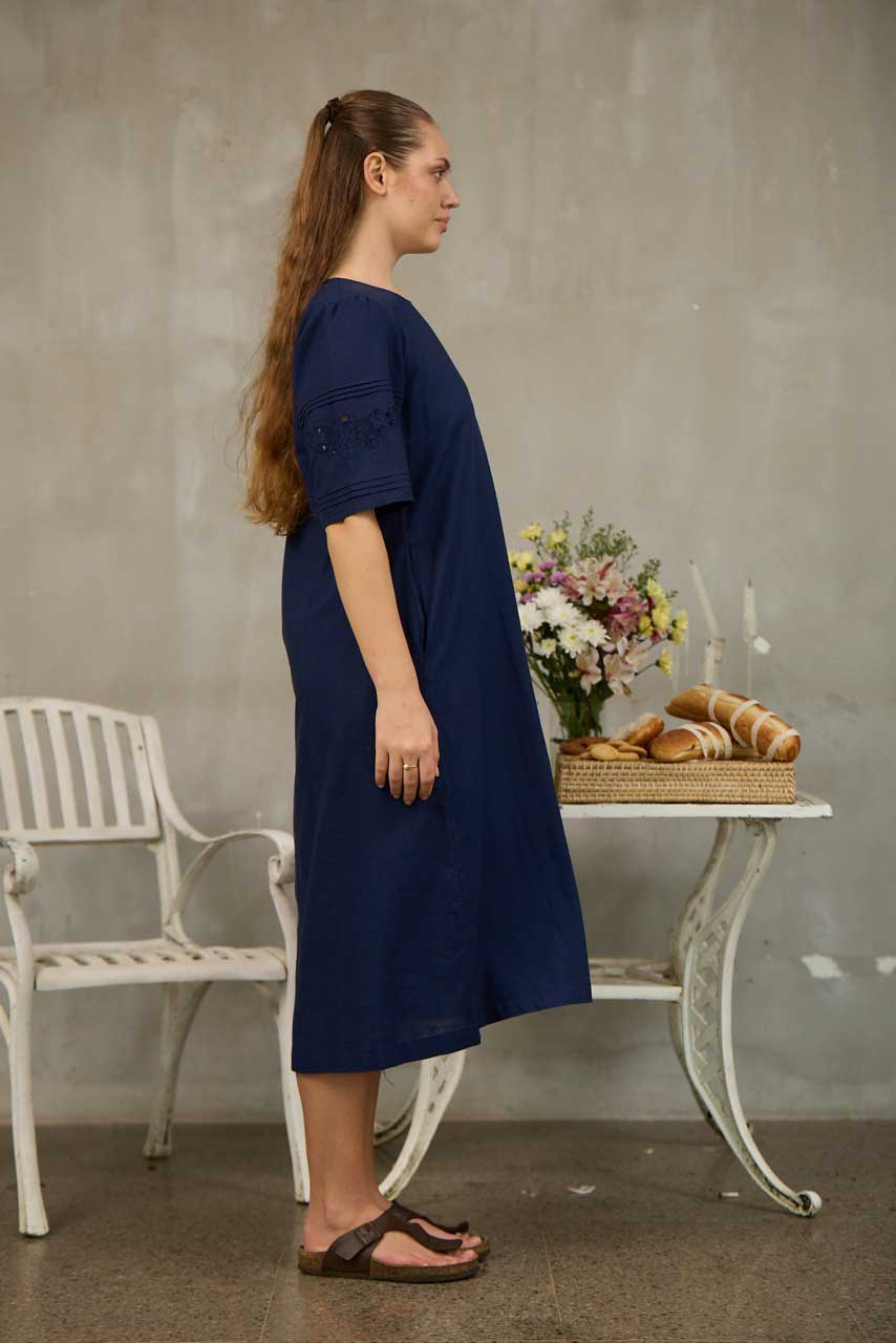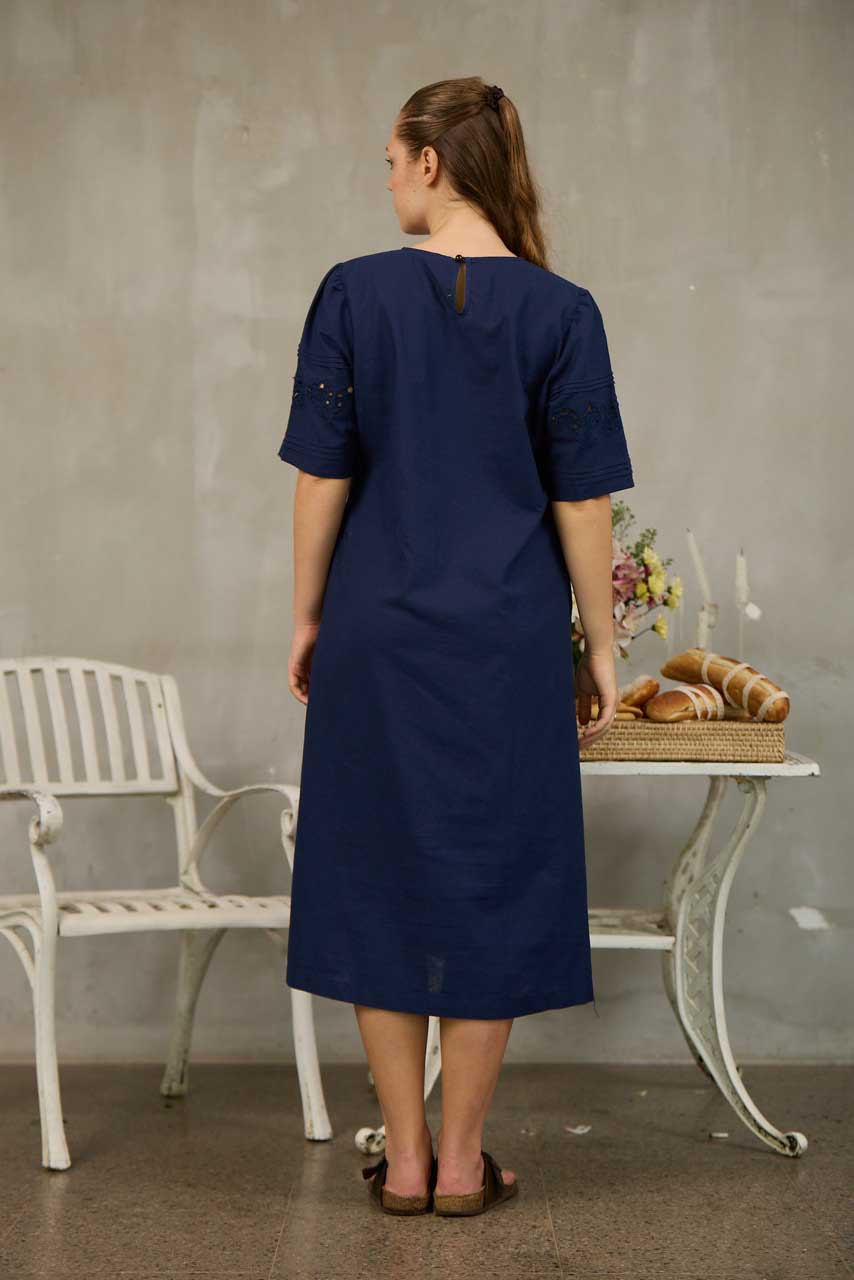 This midi-length dress is crafted from breathable, comfortable fabric for effortless everyday wear. Designed with a loose-fitted silhouette and a soft curved neckline, it offers relaxed elegance with thoughtful detailing. The elbow-length sleeves feature delicate cutwork embroidery and fine pintuck accents, adding a touch of artisanal charm. Functional side pockets provide practicality, making this dress perfect for casual outings, warm-weather days, or relaxed gatherings with timeless, feminine appeal.