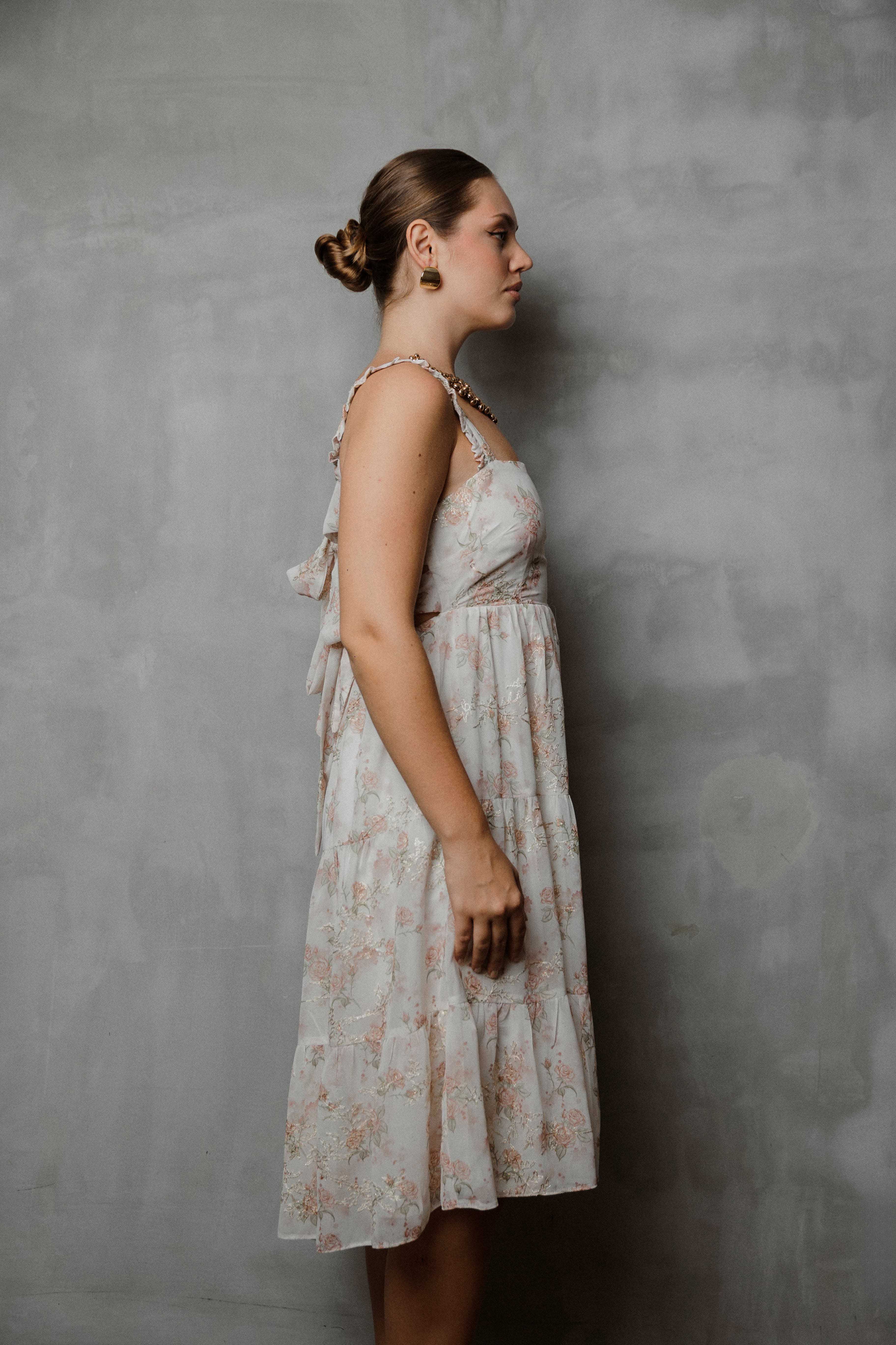 Step into refined romance with the Willow Tiered Mini Dress, a charming and delicate evening piece available in a soft white with subtle floral embroidery. This beautiful dress features wide, ruffled shoulder straps and a flattering square neckline, leading into a fitted, waist that releases into a flowing, tiered skirt with gentle ruffles at the hem. Crafted from a textured, semi-sheer fabric with exquisite floral detailing, this dress is perfect for a wedding night, a garden party, or a formal dinner. To complete this ethereal look, pair it with a statement necklace that rests just above the neckline, elegant block heels, and a bracelet cuff or subtle earrings, allowing the feminine details of the dress to truly captivate.