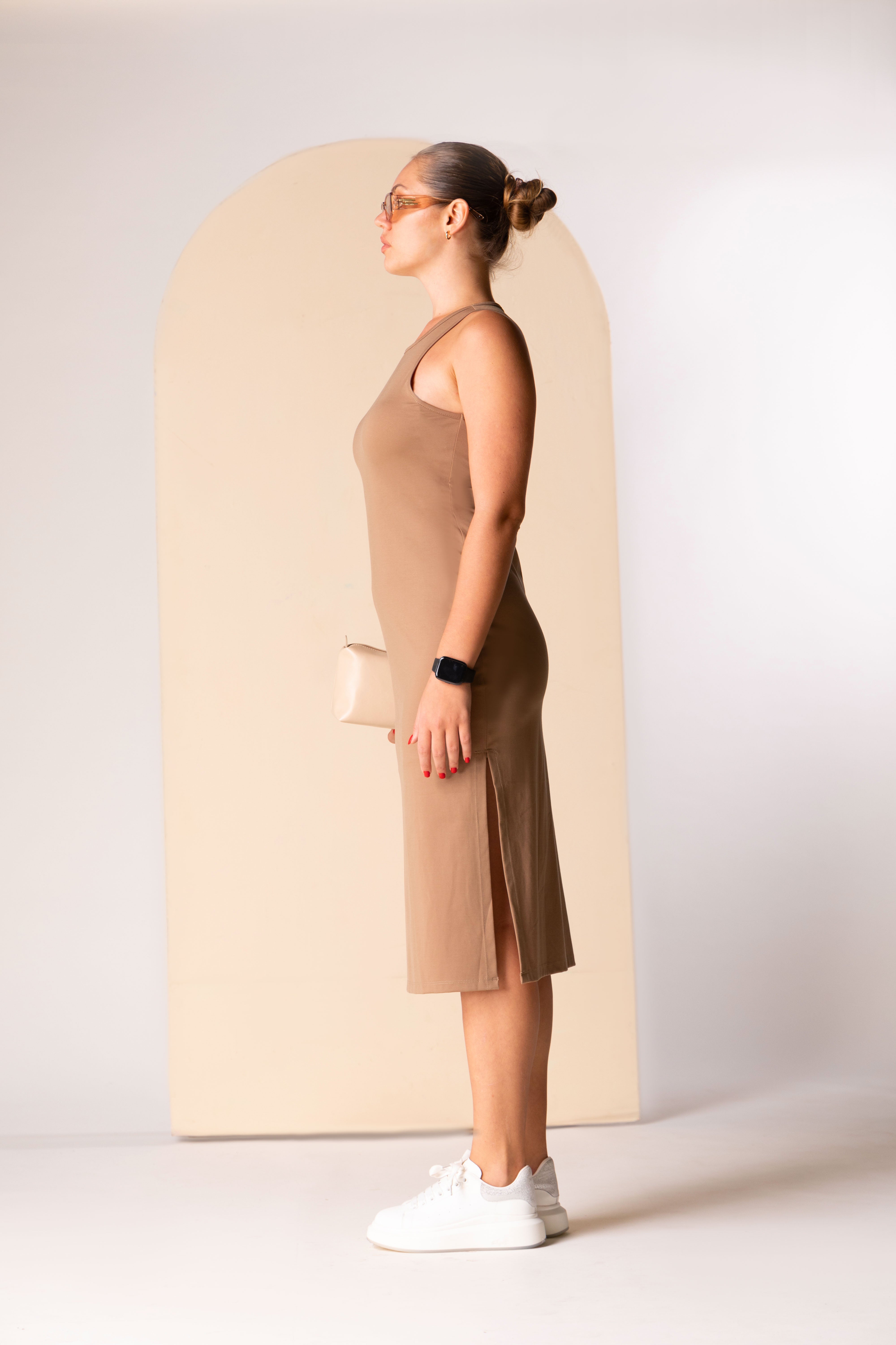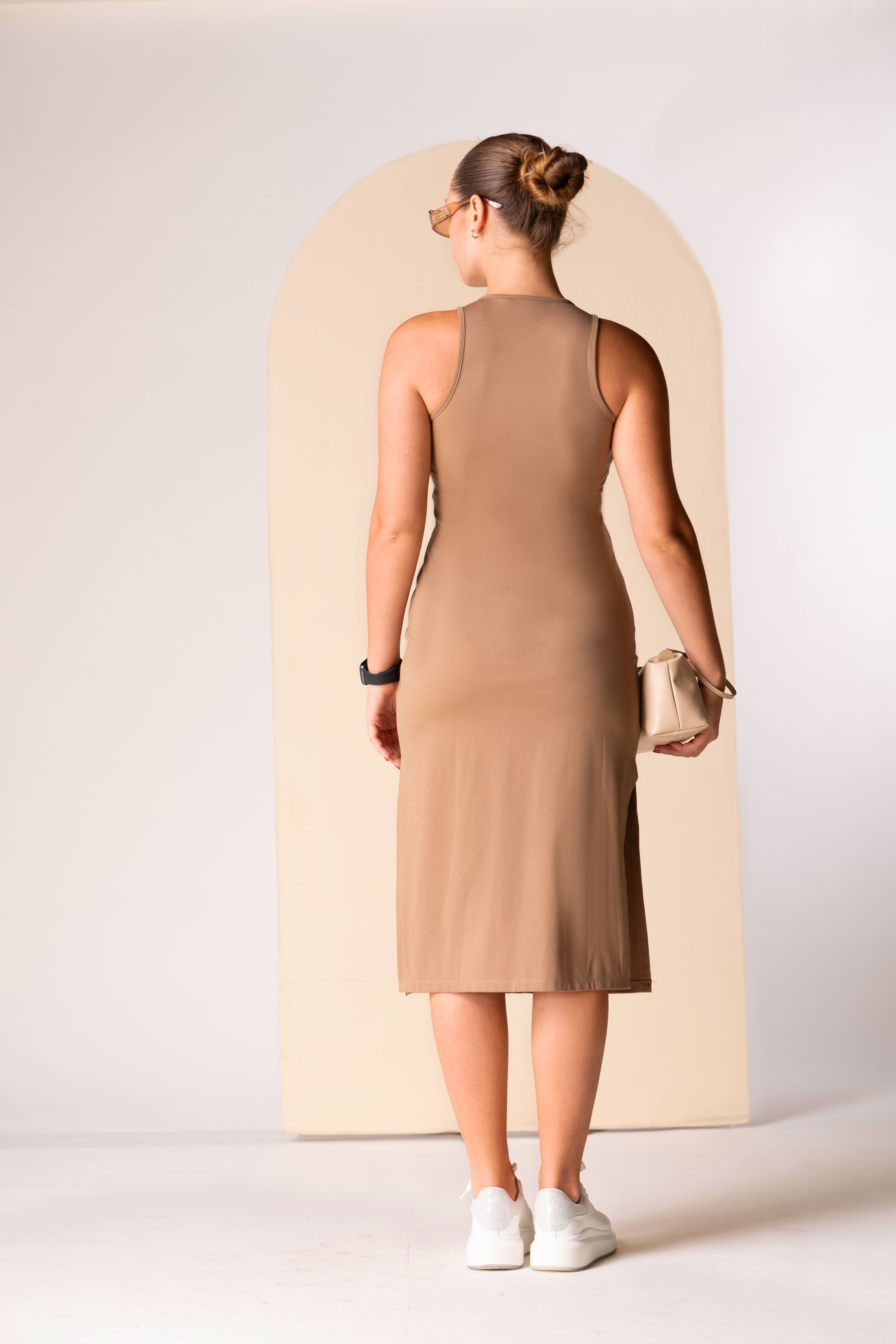 This ensemble embodies "Active-Formalism," a concept that integrates sleek, performance-inspired base layers with refined silhouettes to create a high-functioning executive wardrobe. The look centers on a technical knit midi dress in a muted clay tone, designed to provide the streamlined comfort of professional athletic gear while maintaining a polished, office-ready appearance. This dress features a clean-lined, body-conforming shape that mimics the aerodynamic efficiency of performance wear, yet is lengthened to a midi-cut to ensure it remains grounded in a formal context. A subtle side-slit at the hem adds essential mobility, allowing for unrestricted movement throughout a dynamic workday. The sleeveless, high-neck design functions as a versatile "performance base," appearing both as a standalone piece and layered under a matching cropped technical jacket for a structured, multi-dimensional look. By grounding the monochromatic neutral palette with pristine white platform sneakers and a structured cream clutch, the outfit balances the agility of a commuter uniform with the intentionality of modern tailoring.