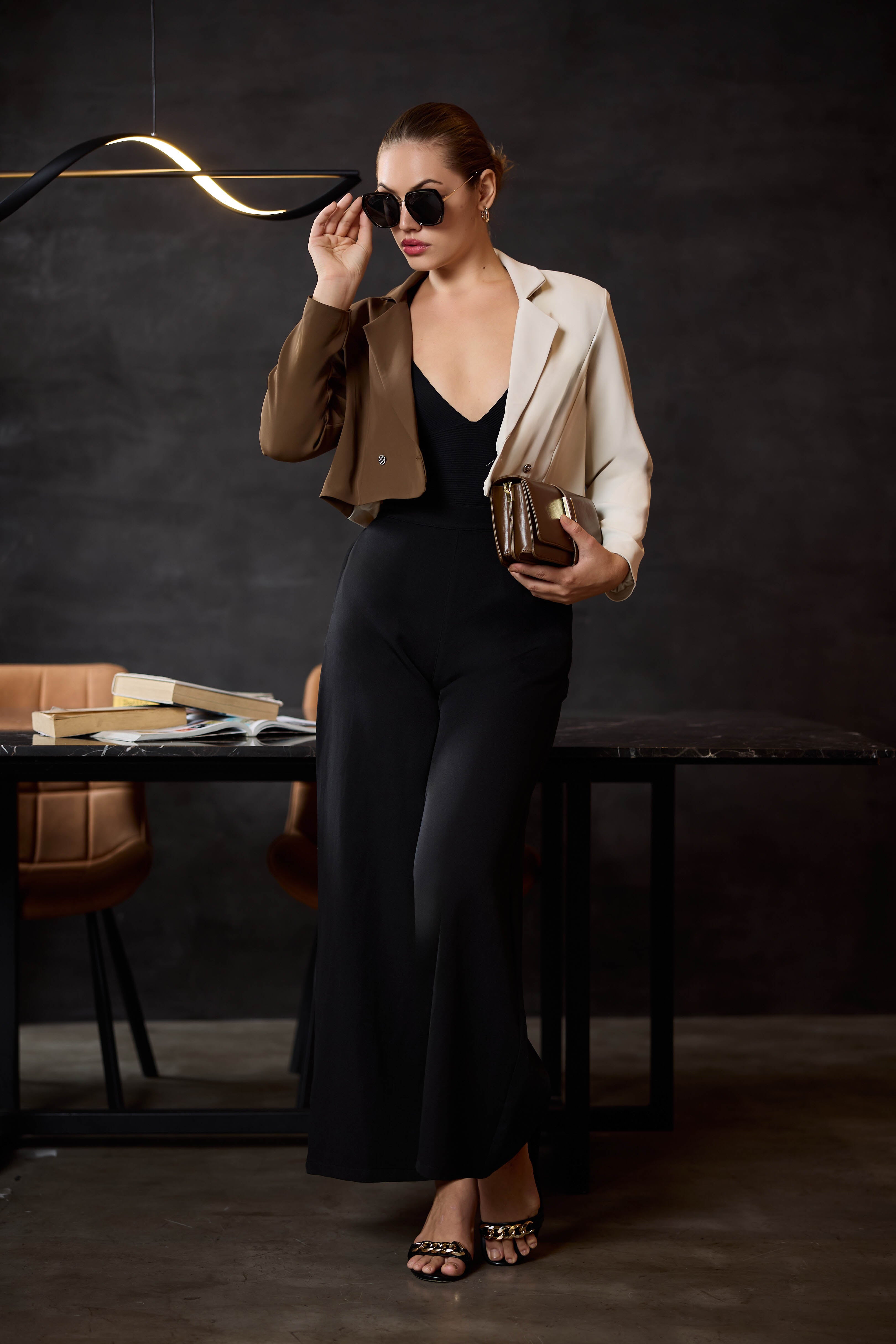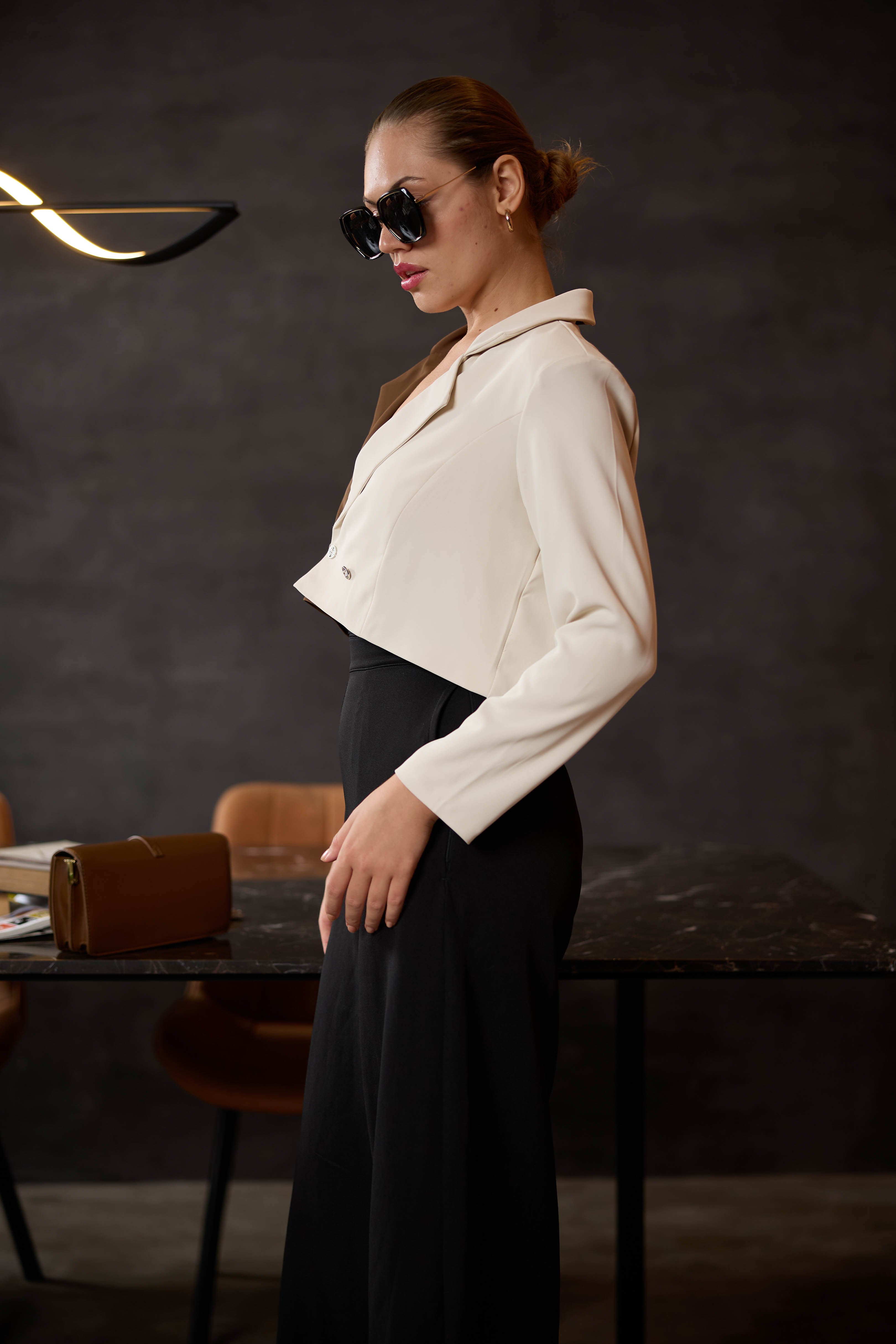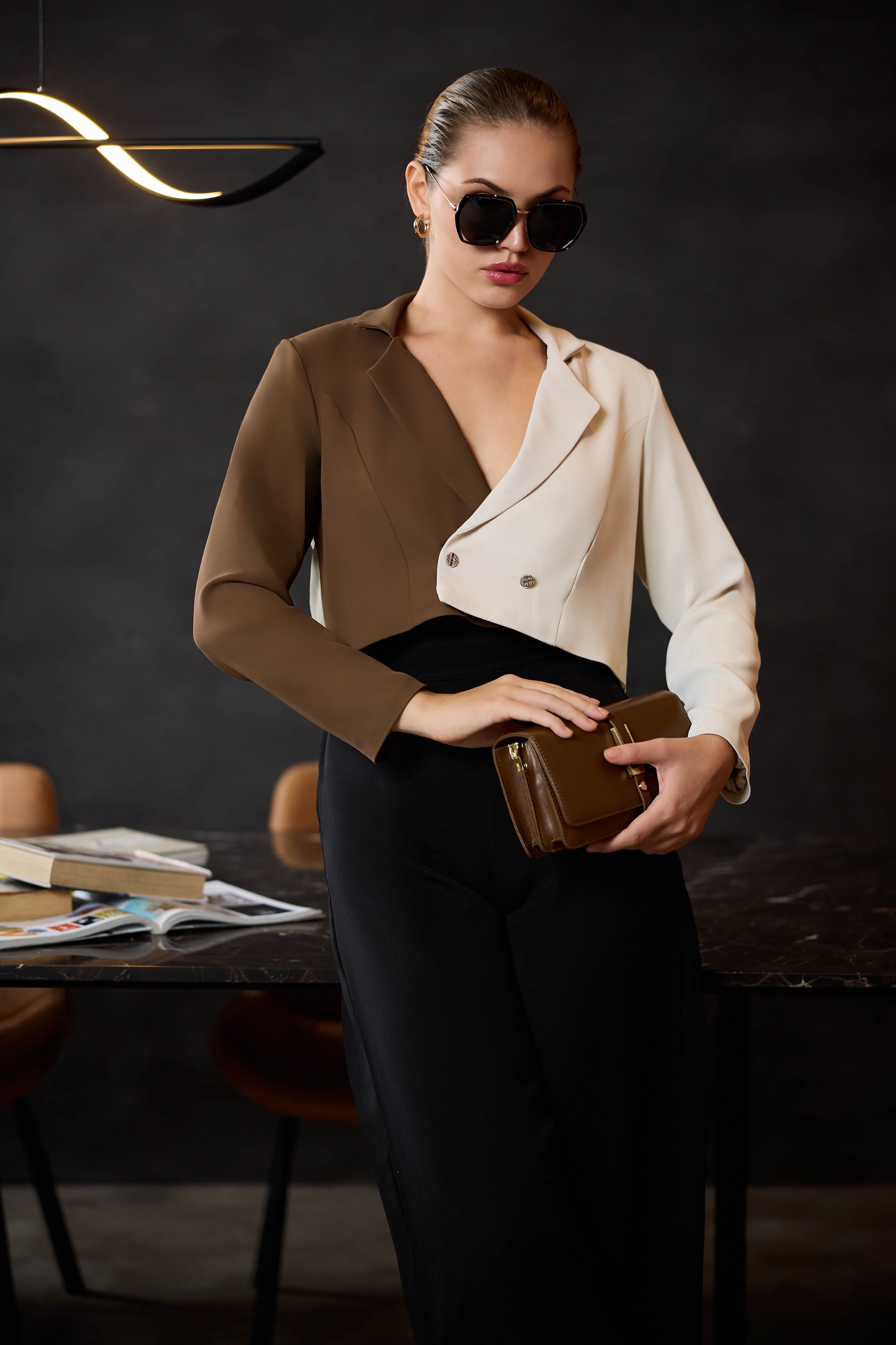 This color-block crop blazer is a modern twist on classic elegance. Designed with contrasting panels in sophisticated hues, the blazer features a semi-fitted cut that enhances the figure while maintaining a tailored look. The highlight of the piece is its two-way silver decorative buttons, adding a touch of refinement and versatility. Perfect for formal occasions, it offers a stylish yet professional appearance, balancing structure with comfort. The cropped length brings a contemporary edge, making it a chic choice for office wear seamlessly blending classic and modern design elements.