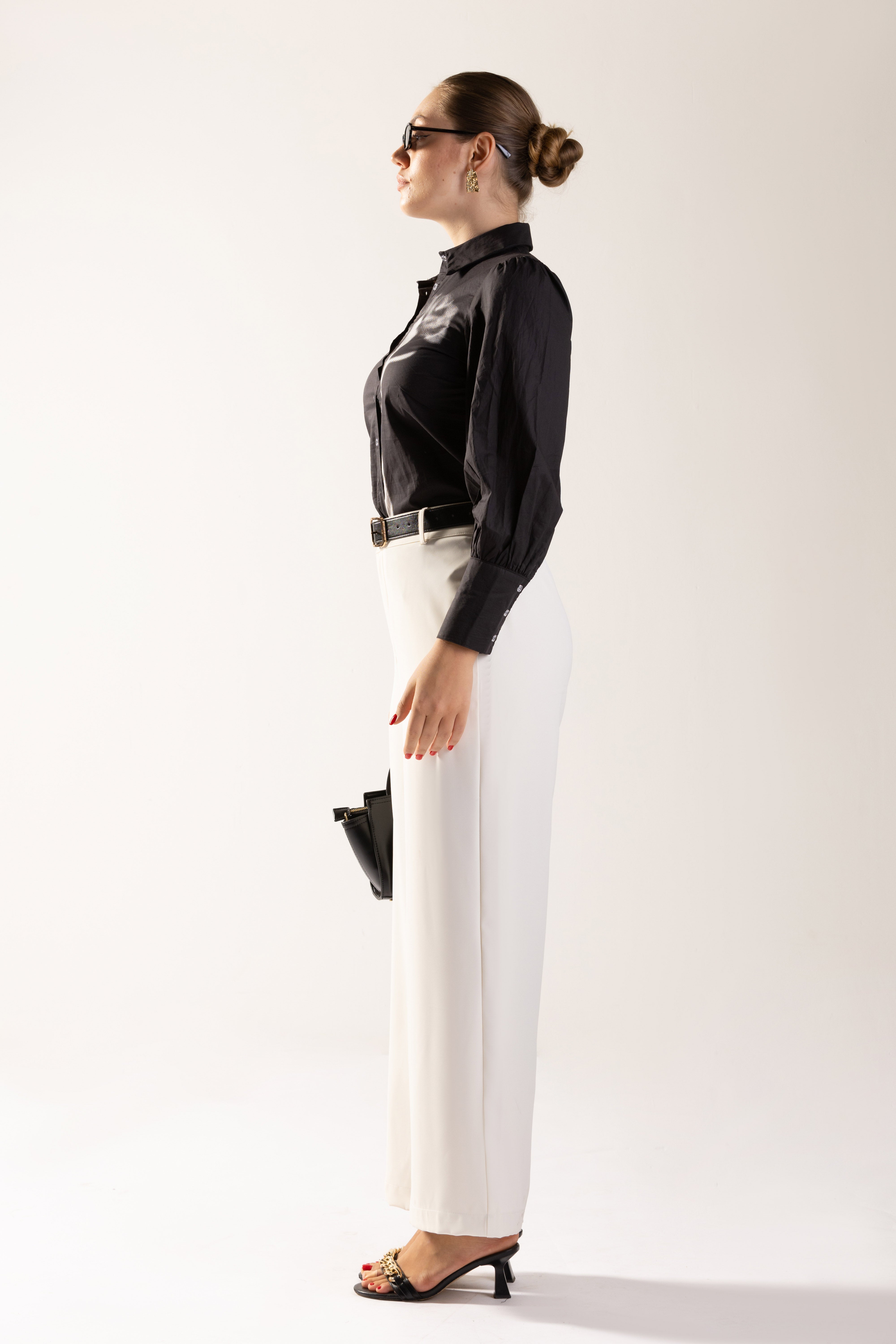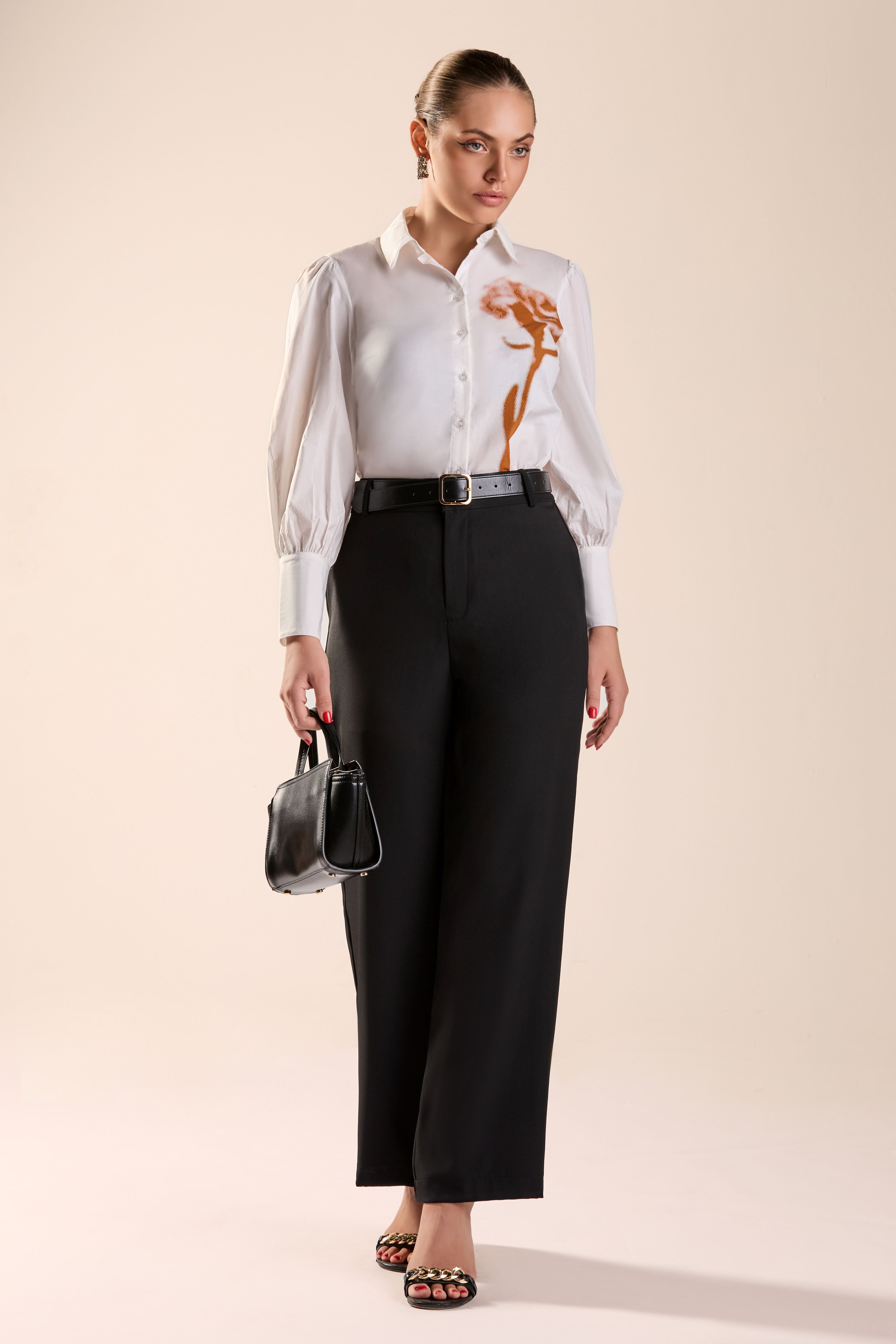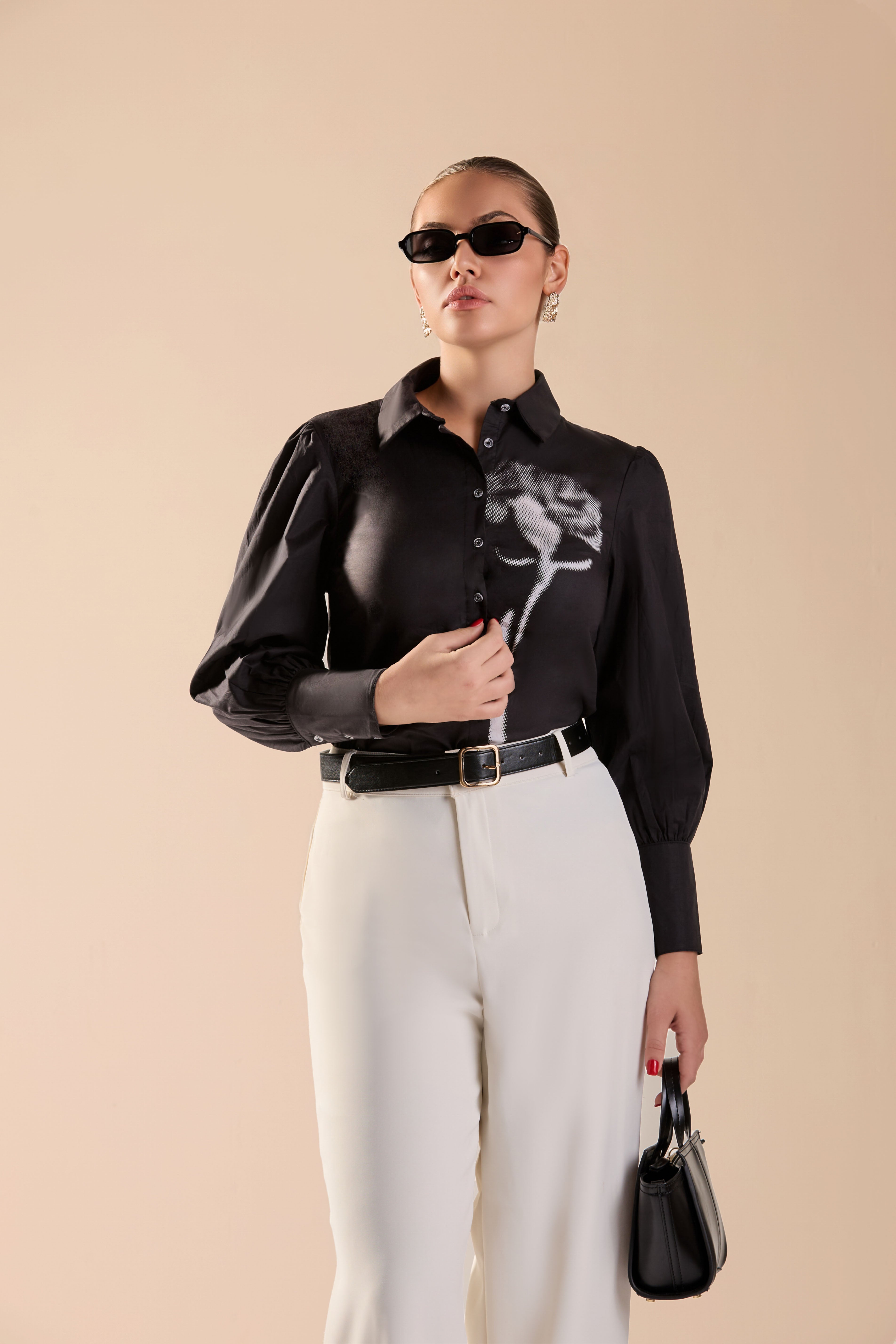 A statement long-sleeve shirt designed to elevate modern wardrobes. Featuring a classic collar, button-down front, and softly gathered sleeves, it balances structure with fluid elegance. The artistic print detail adds a contemporary edge, making it perfect for both work and after-hours styling. Easy to tuck into tailored pants or wear loose for a relaxed look, this versatile top brings individuality and refined confidence to everyday dressing.