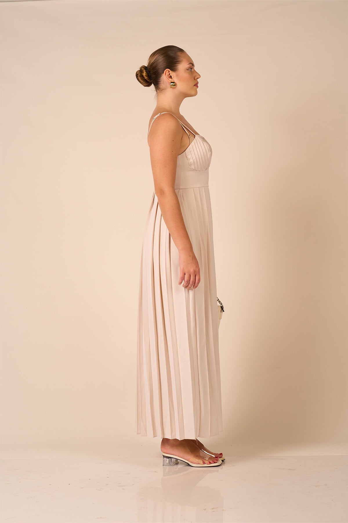 Elegant maxi-length evening dress crafted in luxurious sateen fabric, featuring a strappy pintuck-detail bodice that adds delicate texture and sophistication. The flowing pleated skirt creates graceful movement, making it a perfect choice for formal occasions and refined evening events