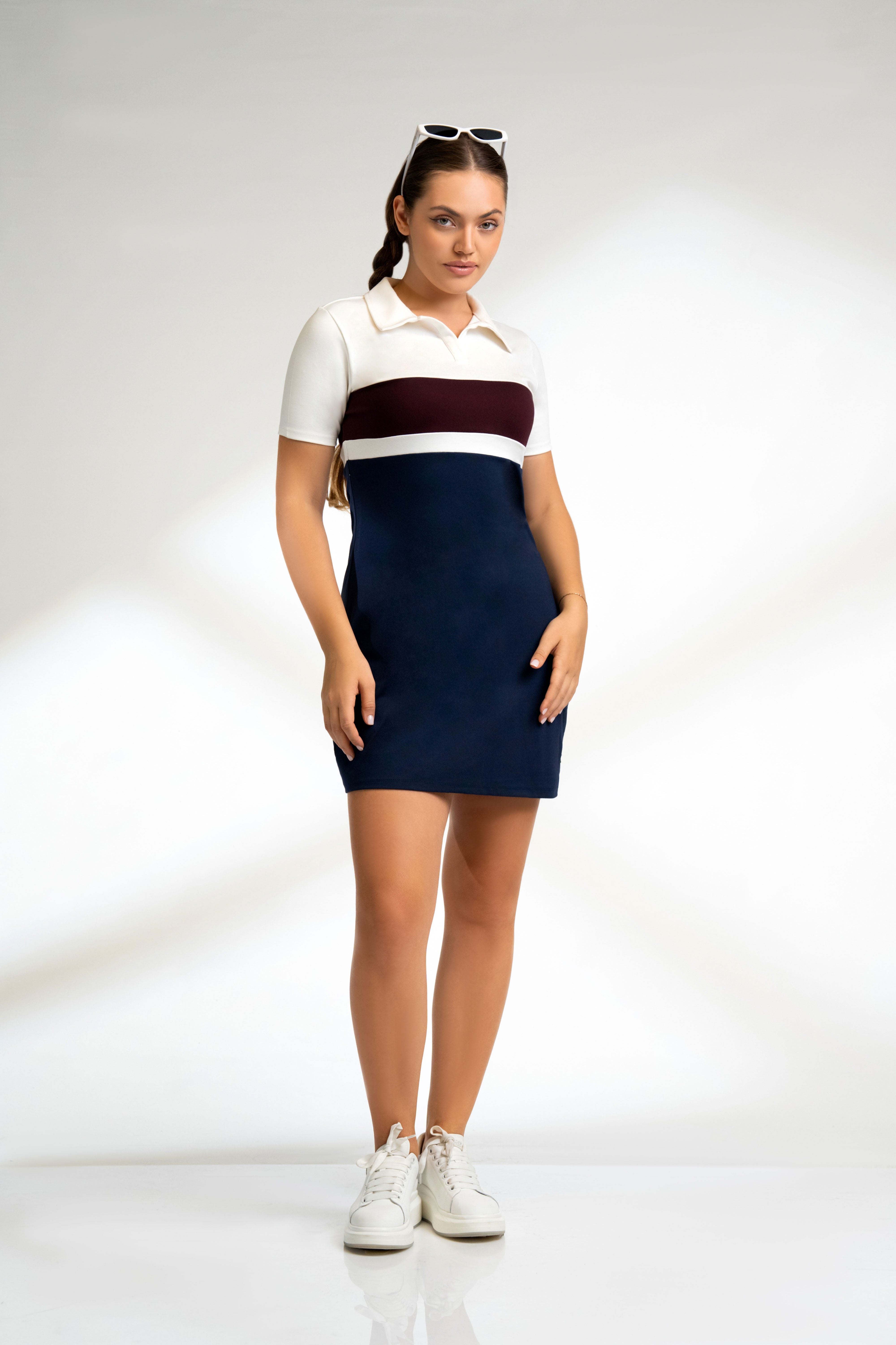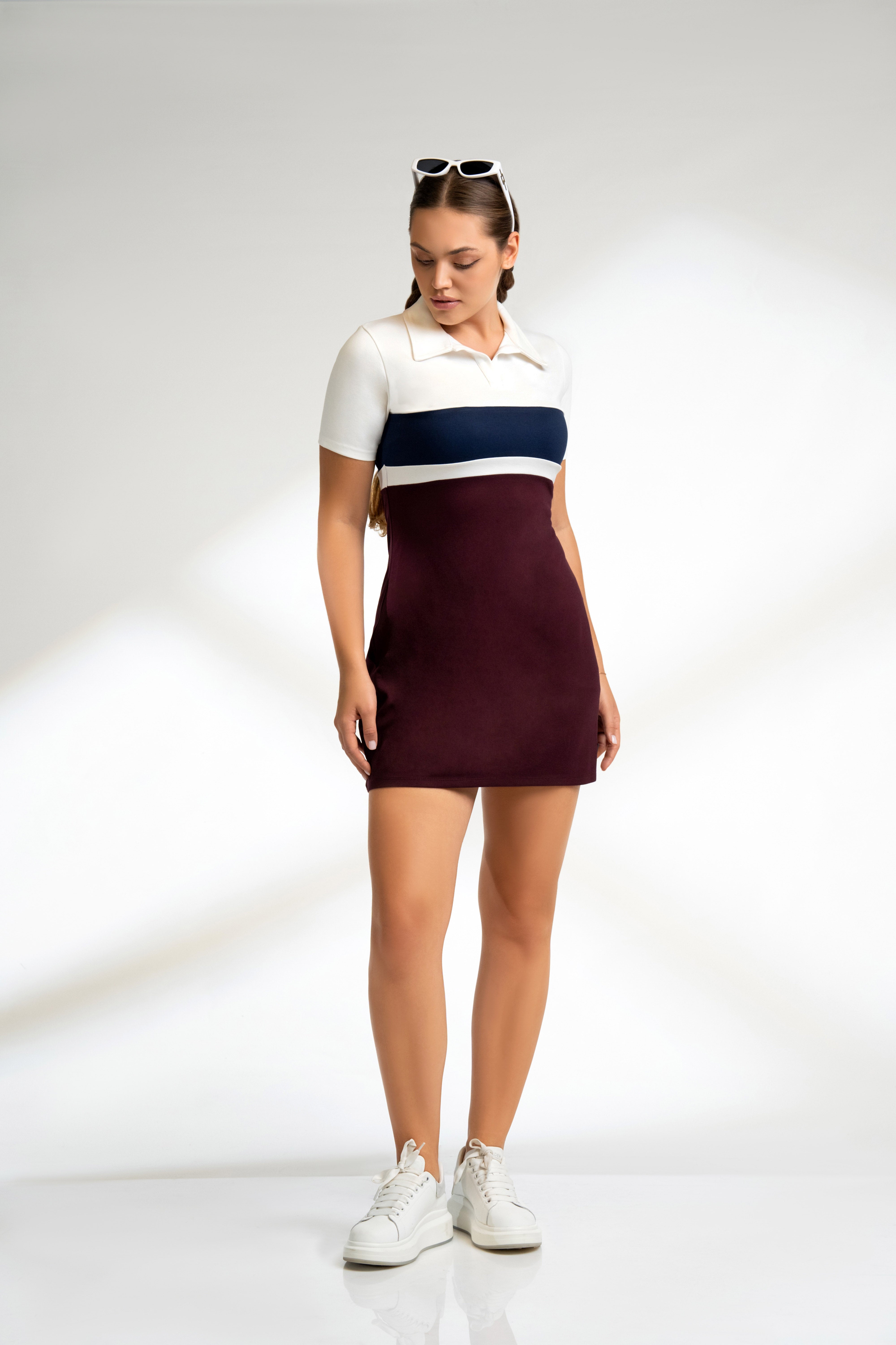 This dress combines a sporty athletic heritage with a sharp, 60s-inspired silhouette, making it an effortless standout for modern street style. Crafted from a structured jersey blend with a hint of stretch, it offers a flattering, tailored fit through the torso that holds its shape throughout the day. The design features a classic crisp-white polo collar and a short-sleeve bodice, grounded by a bold, tri-color horizontal block pattern in navy and deep burgundy. The clean lines and minimalist mini-length hem create a youthful, high-energy look that bridges the gap between preppy and edgy. Pair it with retro-style platform sneakers and slim sunglasses for a daytime city look, or style it with lug-sole boots to add a contemporary grit.