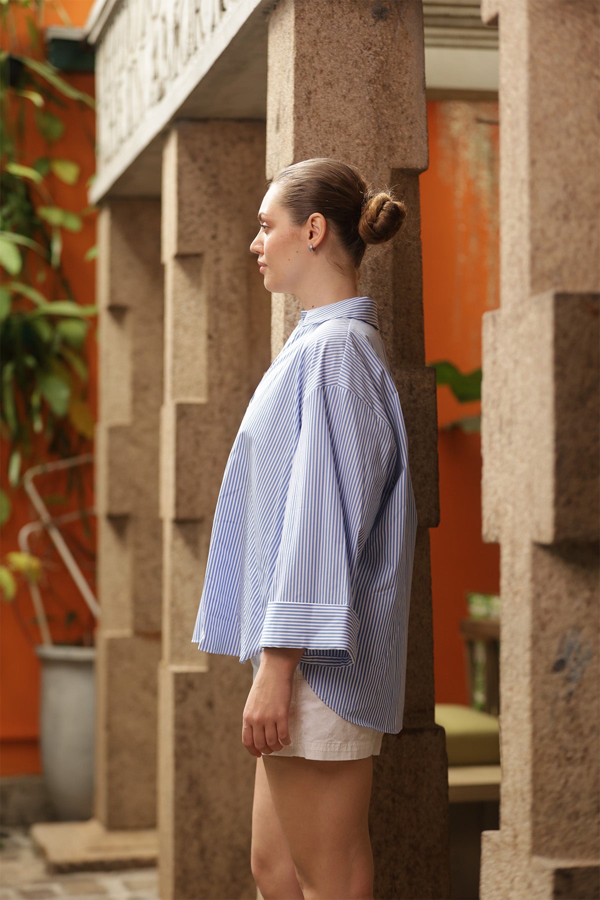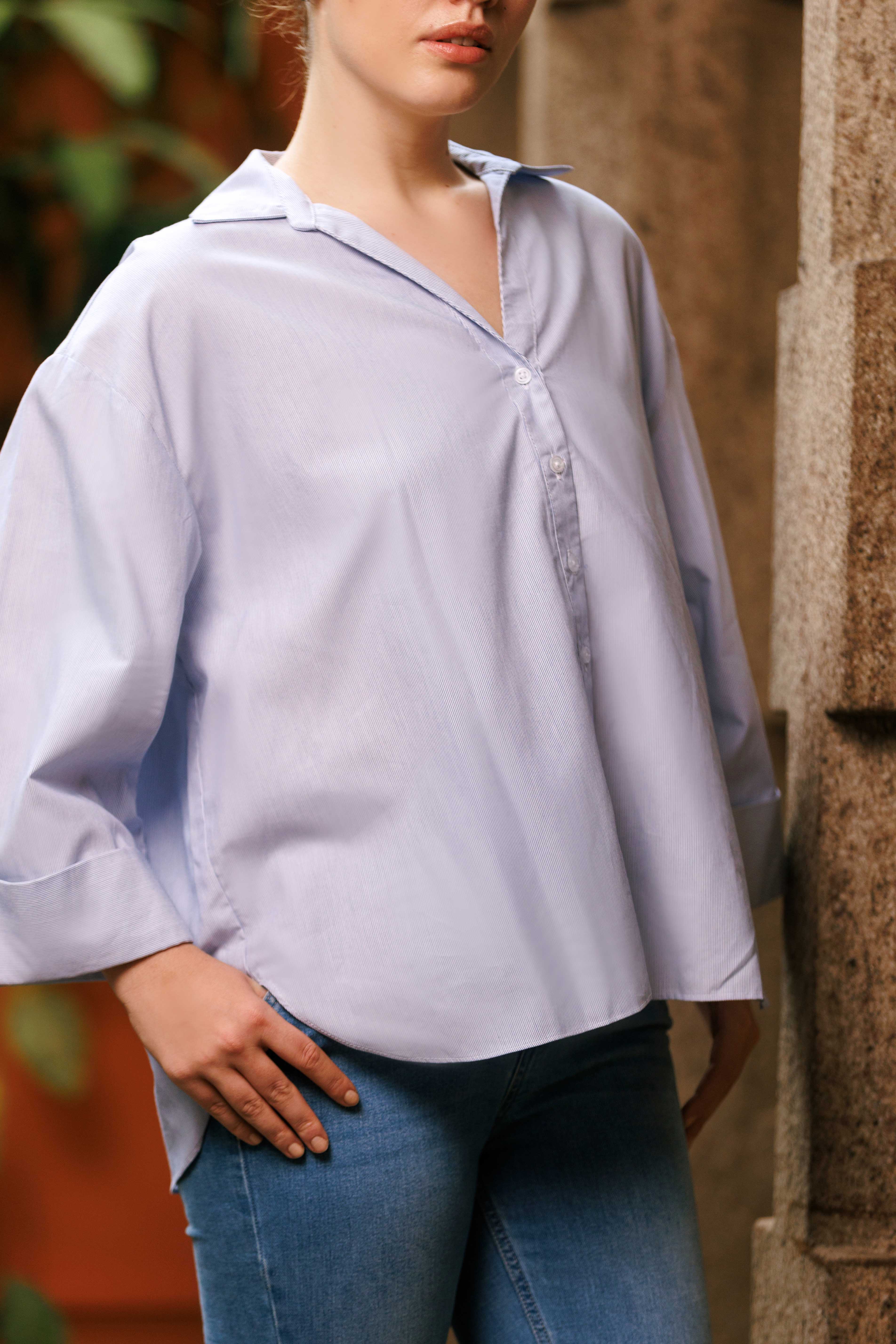 Embrace effortless style and comfort with this oversized light blue shirt, a modern take on a timeless wardrobe staple. Designed for a comfortable, relaxed fit, this piece perfectly balances classic tailoring with a fashion-forward silhouette.The shirt features a soft, appealing light blue base subtly detailed with fine white pinstripes. This delicate stripe pattern adds a refined visual texture while maintaining a clean, minimalist aesthetic. It's likely crafted from a crisp yet soft cotton or cotton-blend fabric, ensuring it's breathable for all-day wear and has the perfect amount of structure to maintain its beautiful drape.