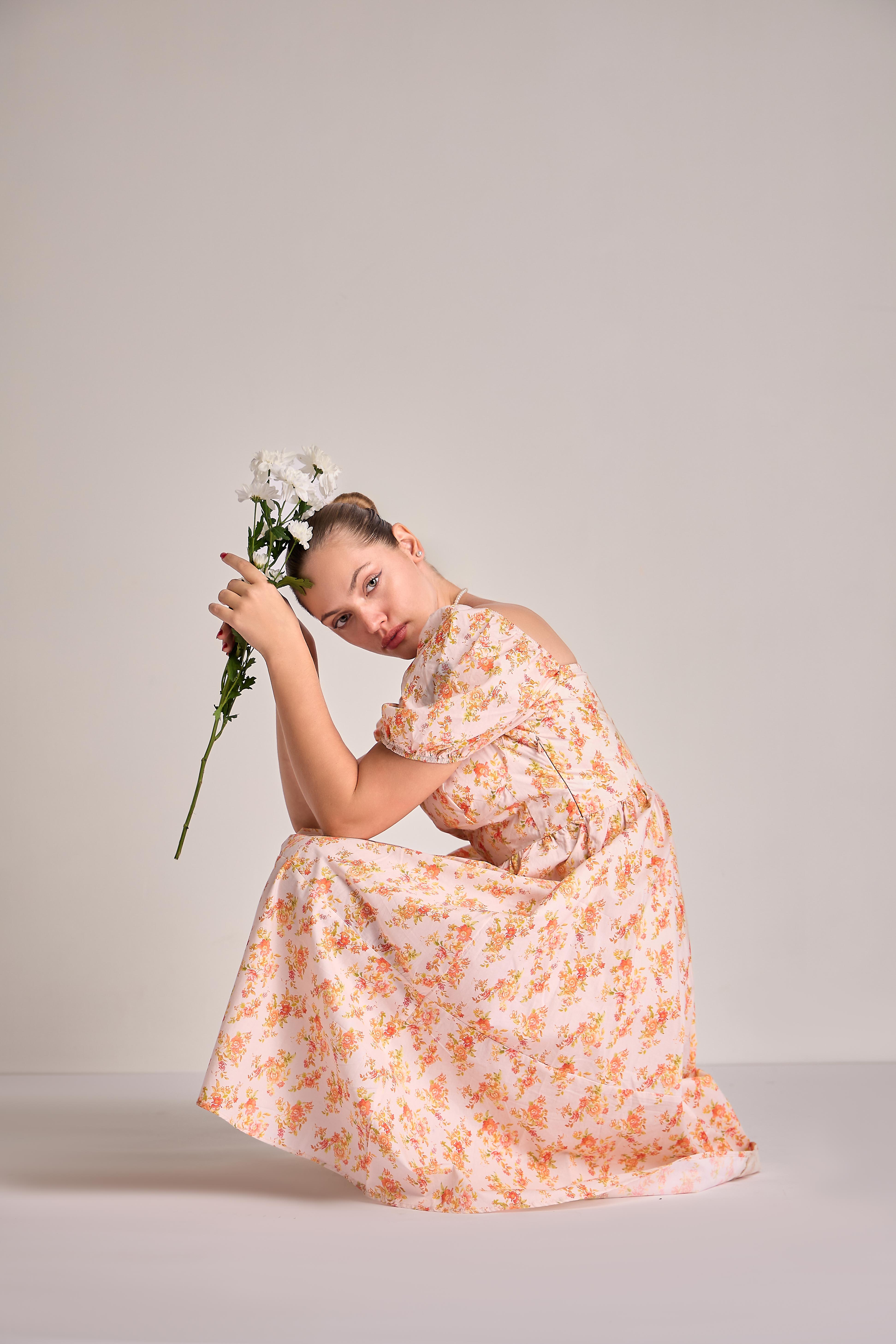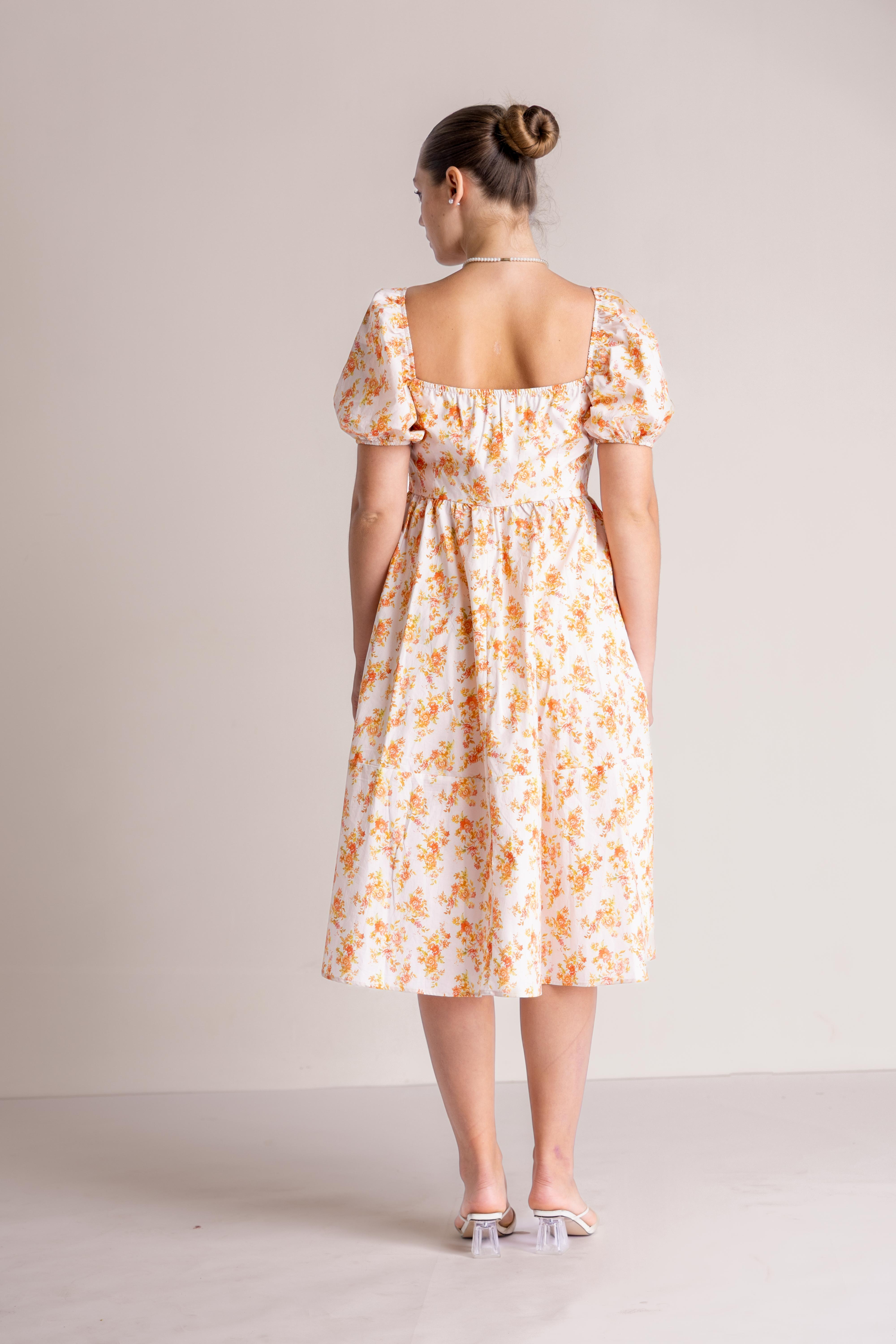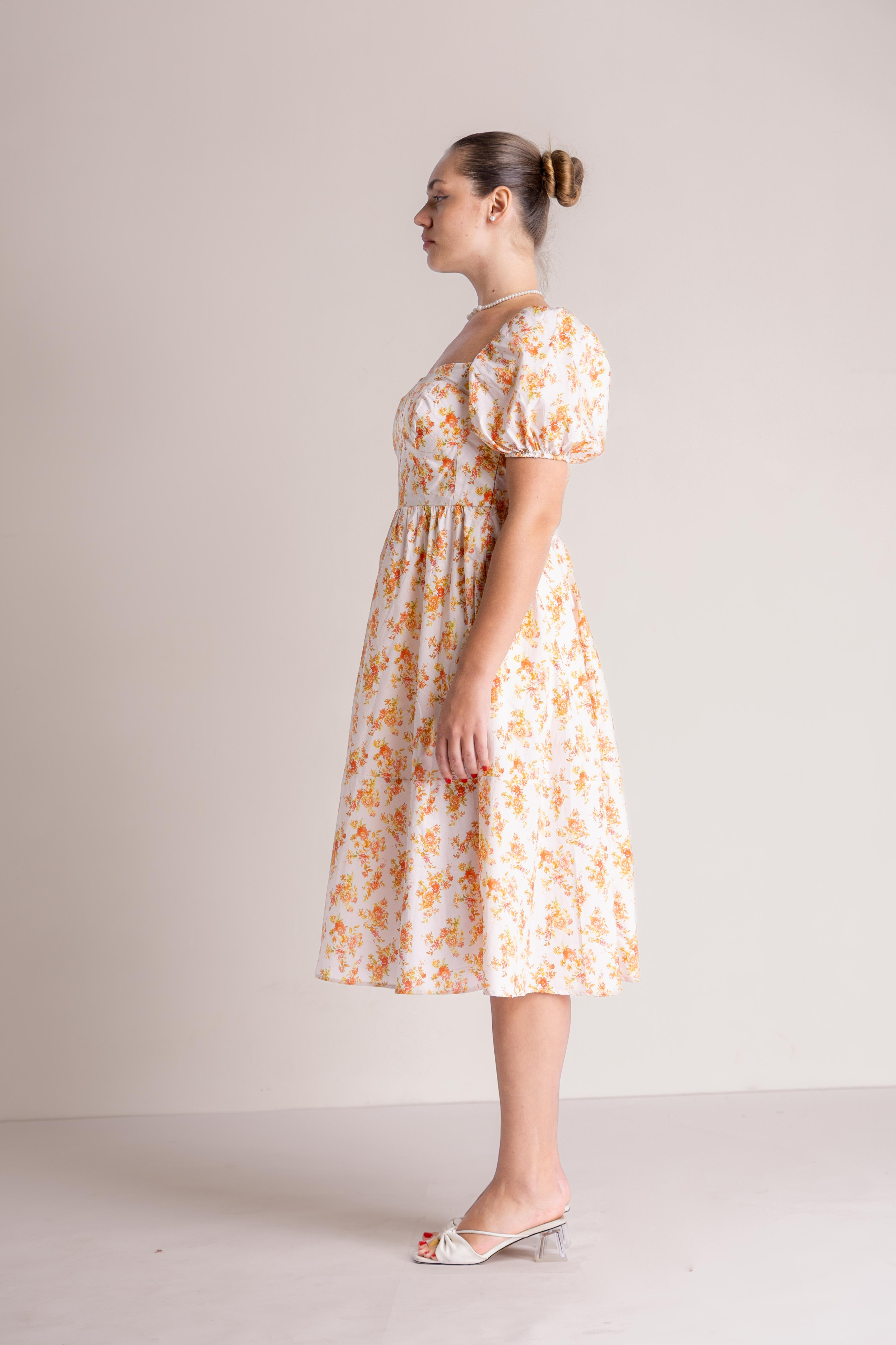 The Clara Blossom Midi is a vision of timeless grace, featuring a beautifully structured bodice with a romantic sweetheart neckline and charming puff sleeves that add a touch of vintage flair. This elegant garment is defined by its flattering high-waist silhouette, which transitions seamlessly into a voluminous, tea-length skirt that moves with effortless fluidity. Adorned with a delicate, all-over botanical print, the dress is crafted from a crisp and lightweight material that maintains its sophisticated shape while offering a breathable and comfortable feel. It is a perfect ensemble for a sunlit garden party or a refined afternoon gathering.