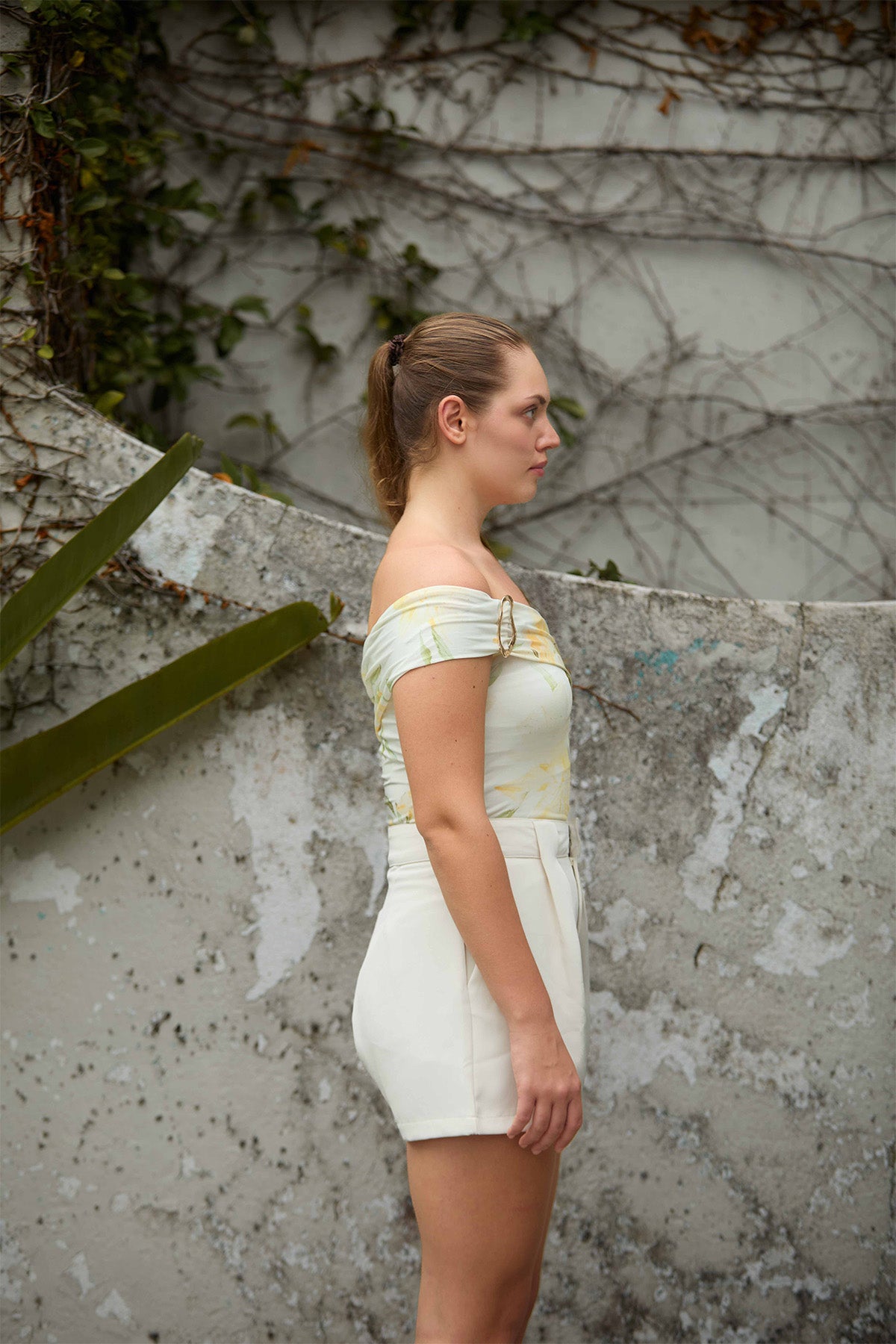The material feels structured and sturdy, giving the garment a tailored, premium look while still being comfortable for warm weather. The design features a high-rise waist and a generous length, hitting mid-thigh. They include key functional details like front pleats for a great drape and side utility pockets. A small, contrasting dark logo patch is visible near the waistband, adding a modern, branded touch to the classic silhouette.