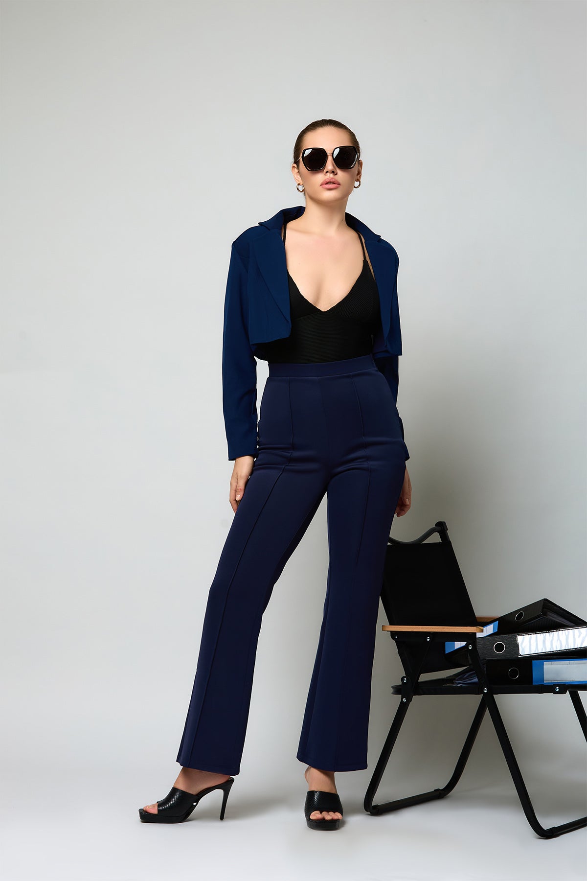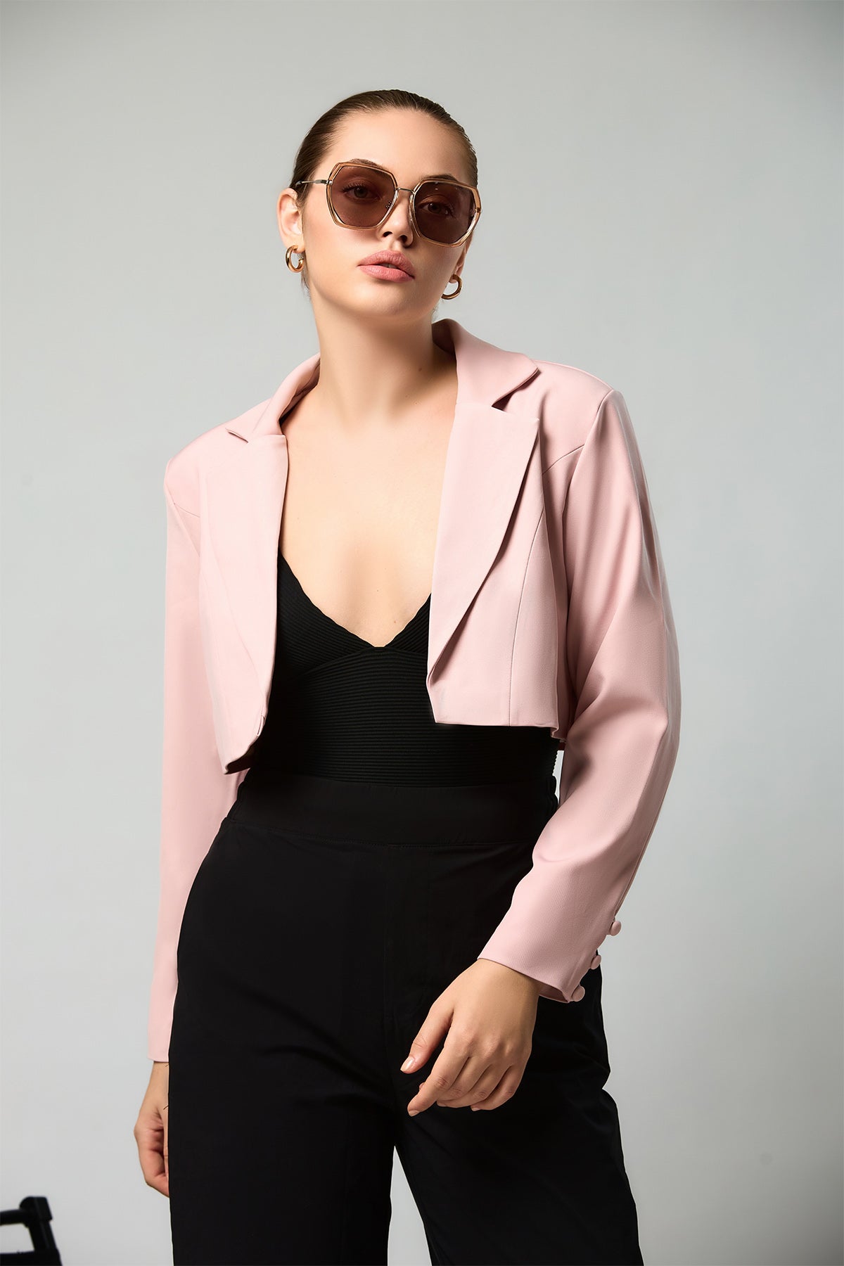 It features a classic notched lapel and long sleeves, cut dramatically short for a modern silhouette that hits right at the waistline. Perfect for layering over dresses or high-waisted separates, this blazer instantly gives your look a sophisticated, fashion-forward edge.