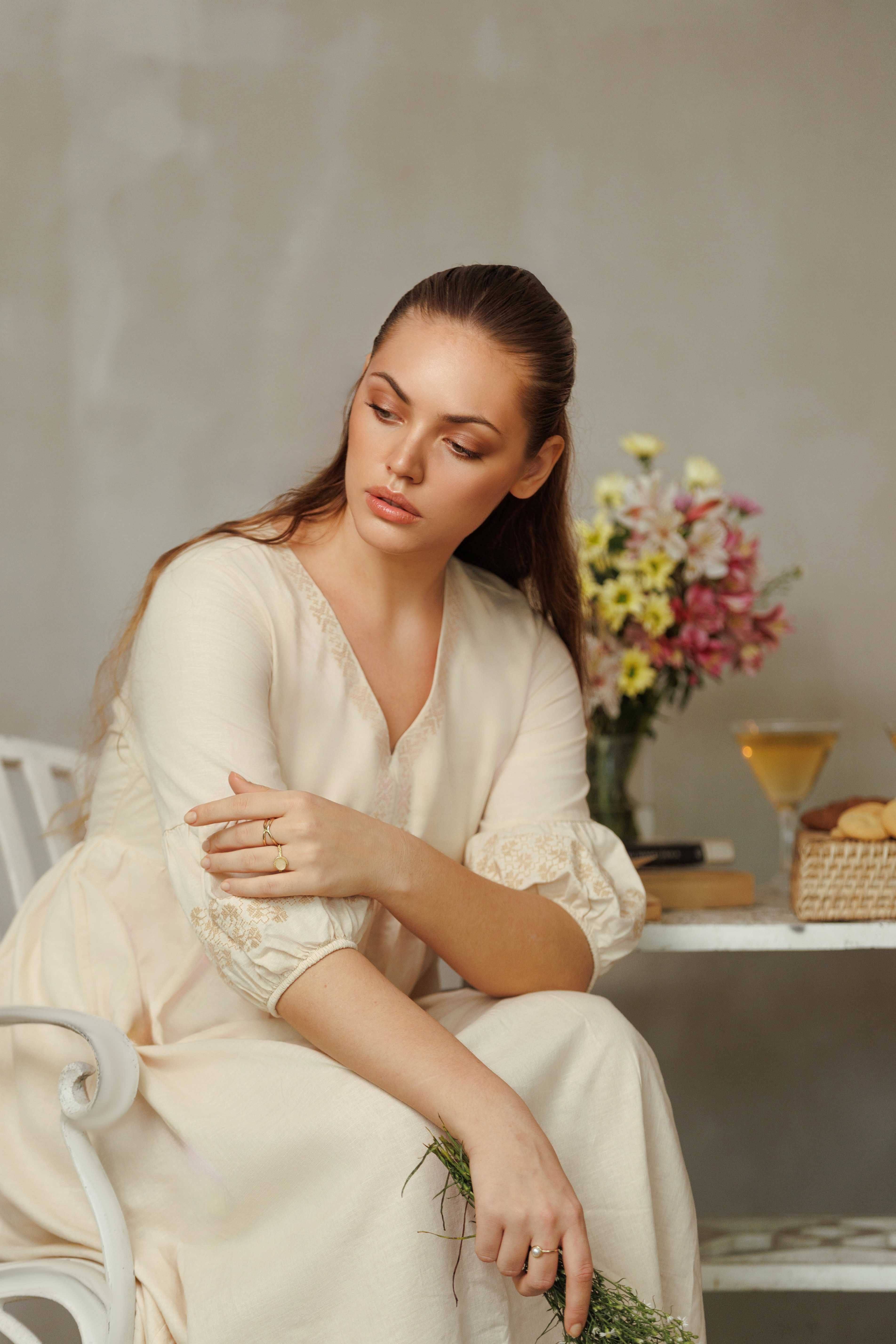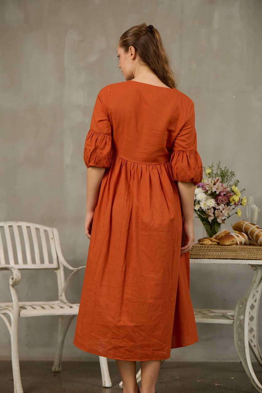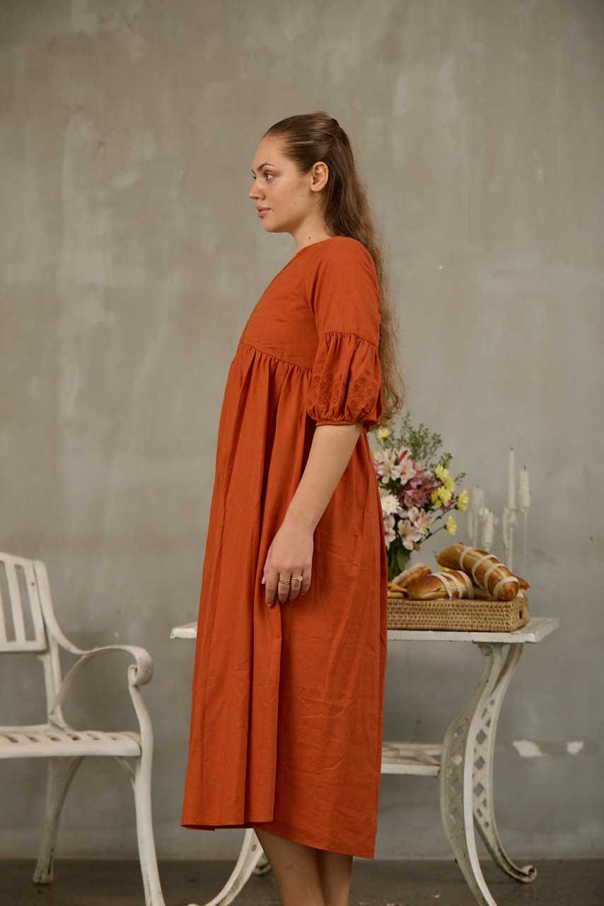 Crafted from breathable linen-cotton fabric, this midi-length dress offers all-day comfort with a relaxed, loose-fitted silhouette. Designed with a flattering V-neckline, it features delicate embroidery along the sleeves and neckline for a touch of artisanal charm. The 3/4 length sleeves provide graceful coverage, making it perfect for warm days or transitional seasons. Effortlessly elegant and versatile, this dress blends natural comfort with timeless detailing for everyday wear.