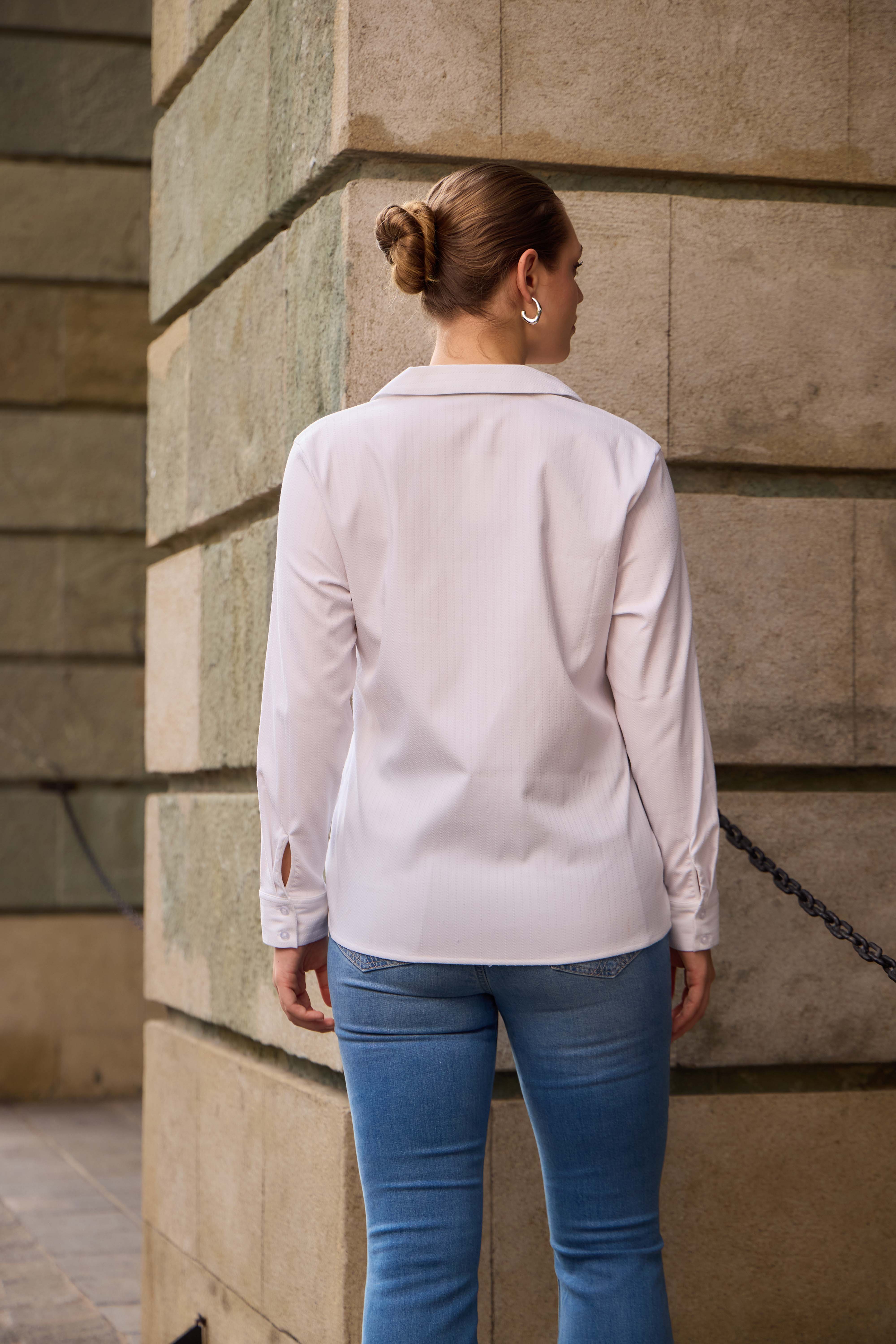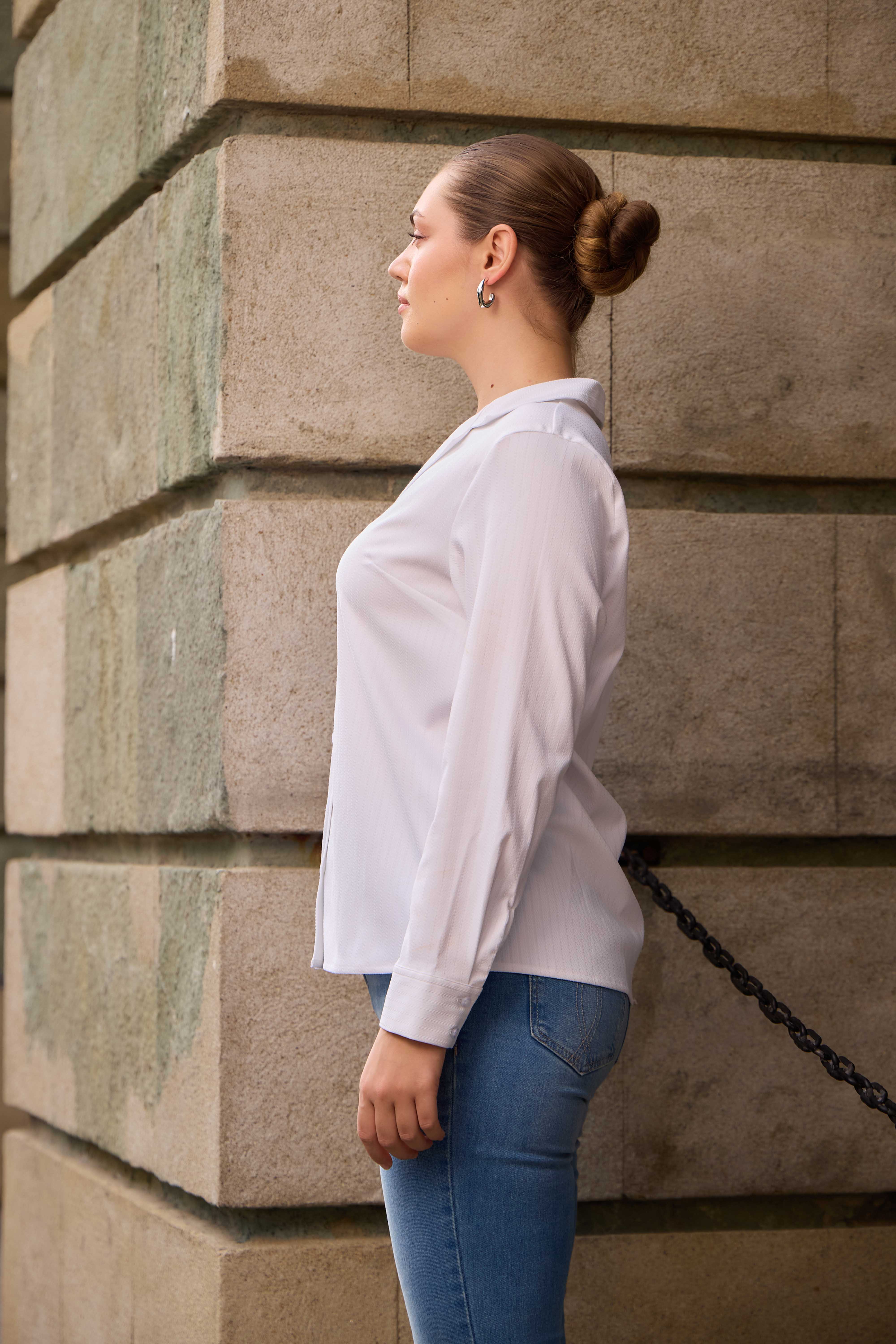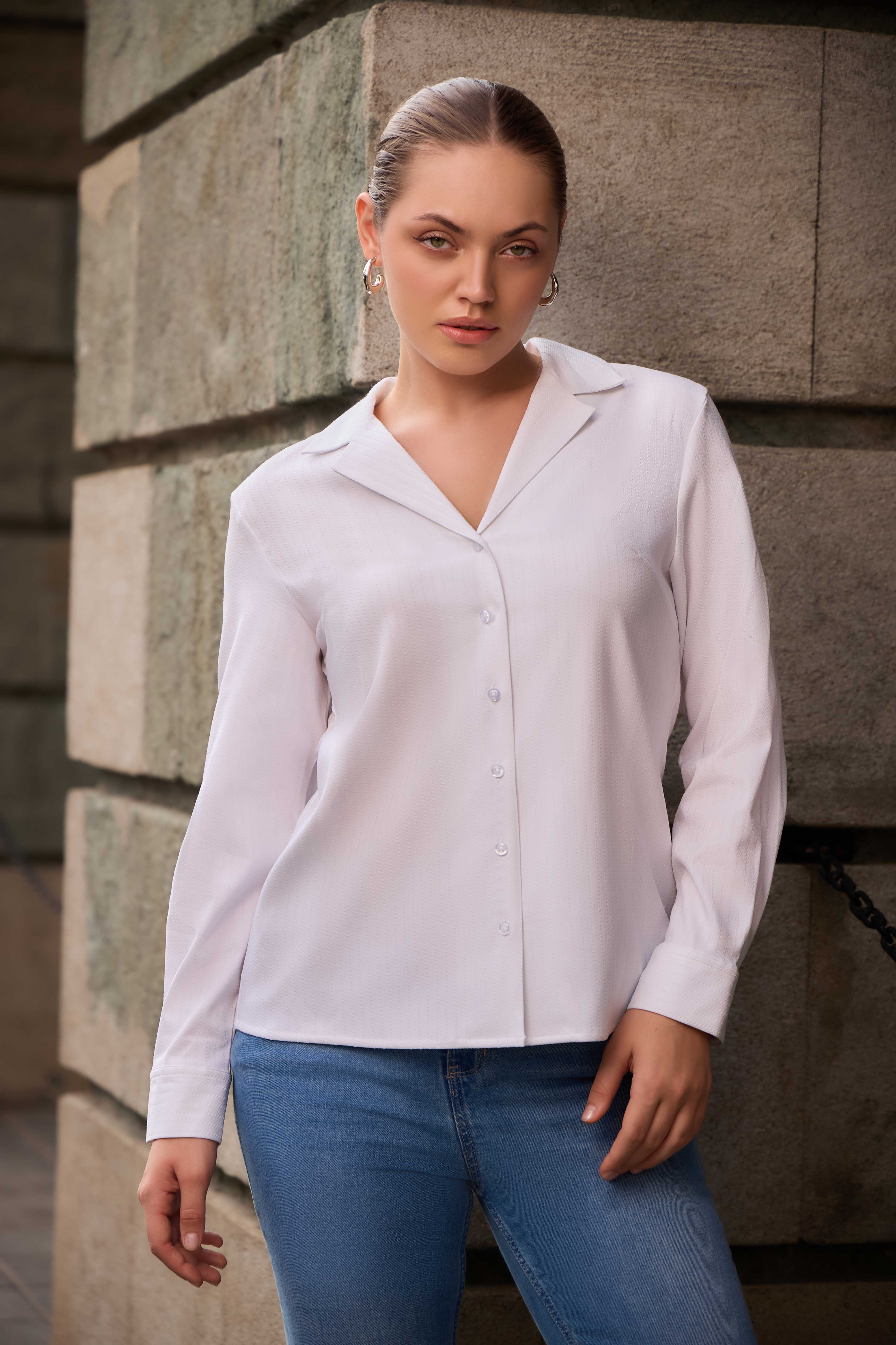 This is a Notch Collar Button-Down Shirt, also commonly referred to as a Camp Collar Blouse. It is a modern professional staple that borrows elements from classic menswear to create a relaxed yet structured look.