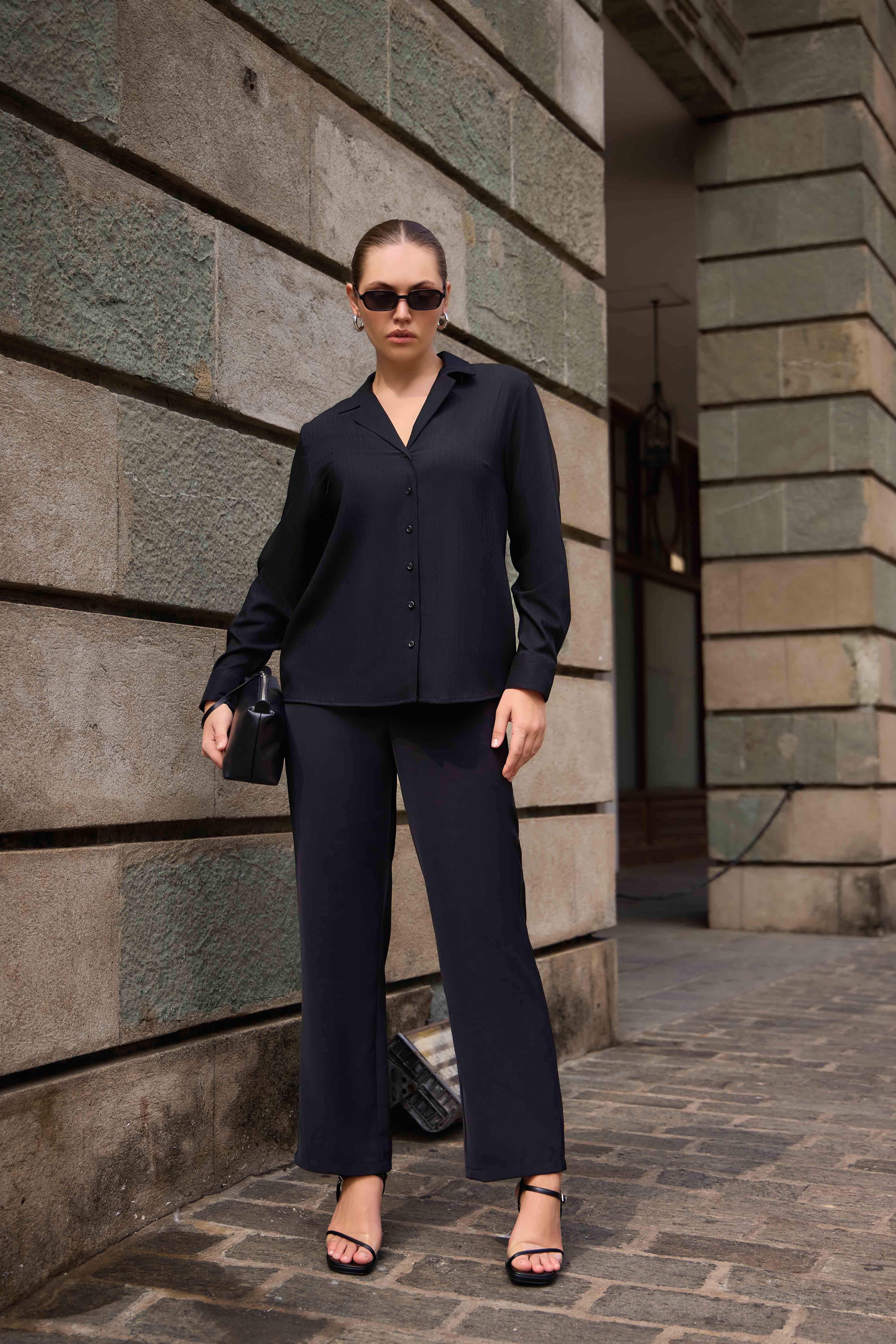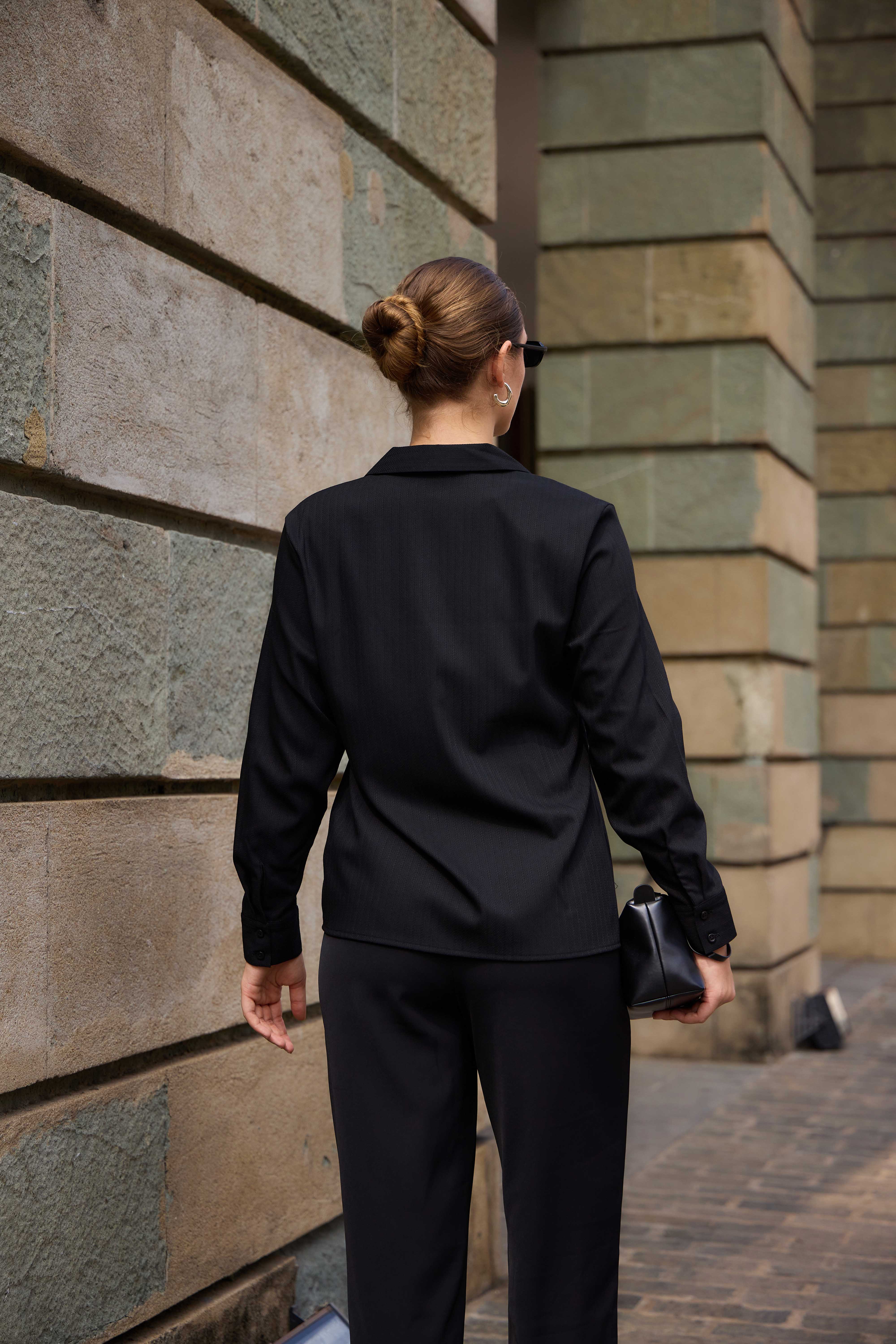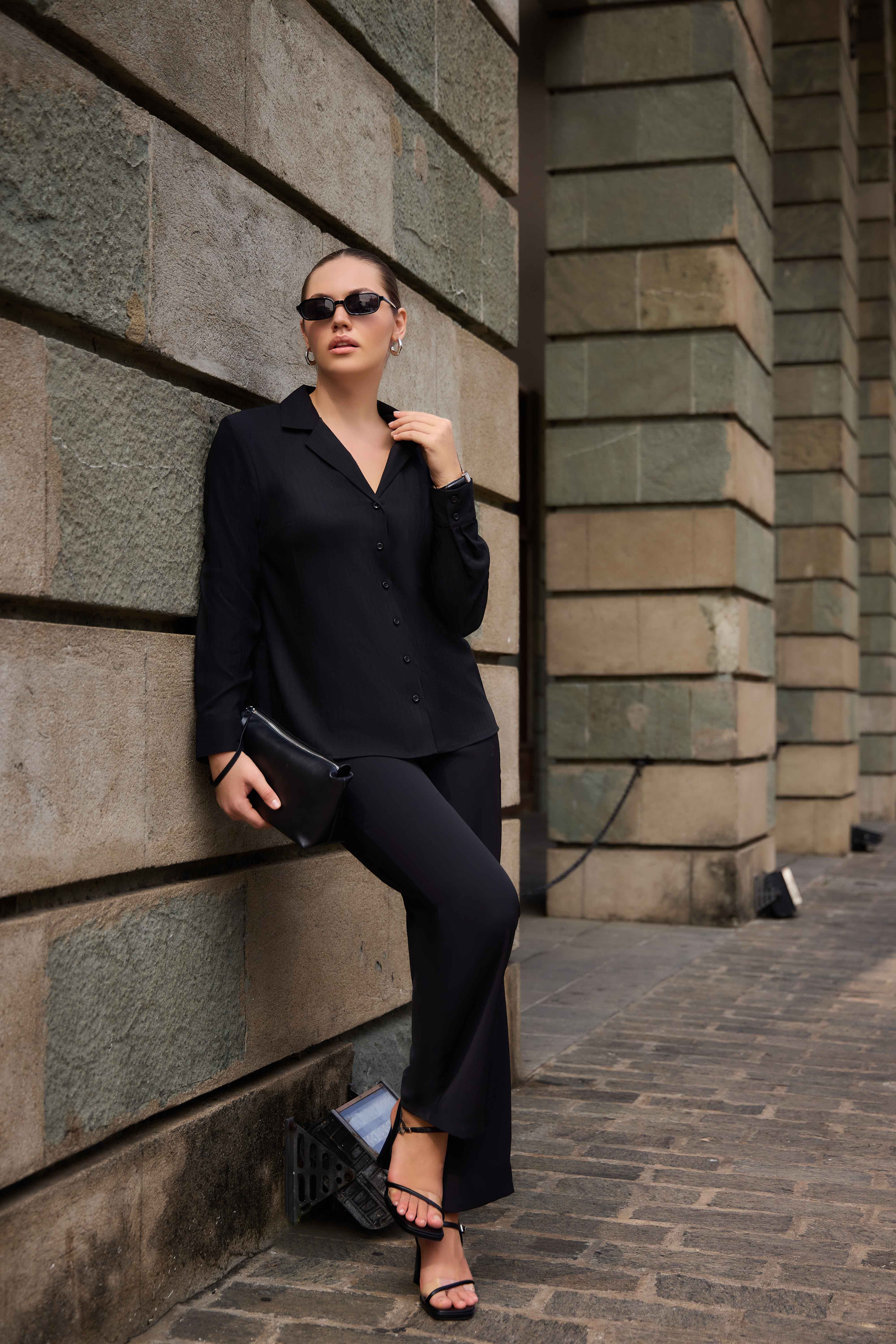 This is a Notch Collar Button-Down Shirt, also commonly referred to as a Camp Collar Blouse. It is a modern professional staple that borrows elements from classic menswear to create a relaxed yet structured look.