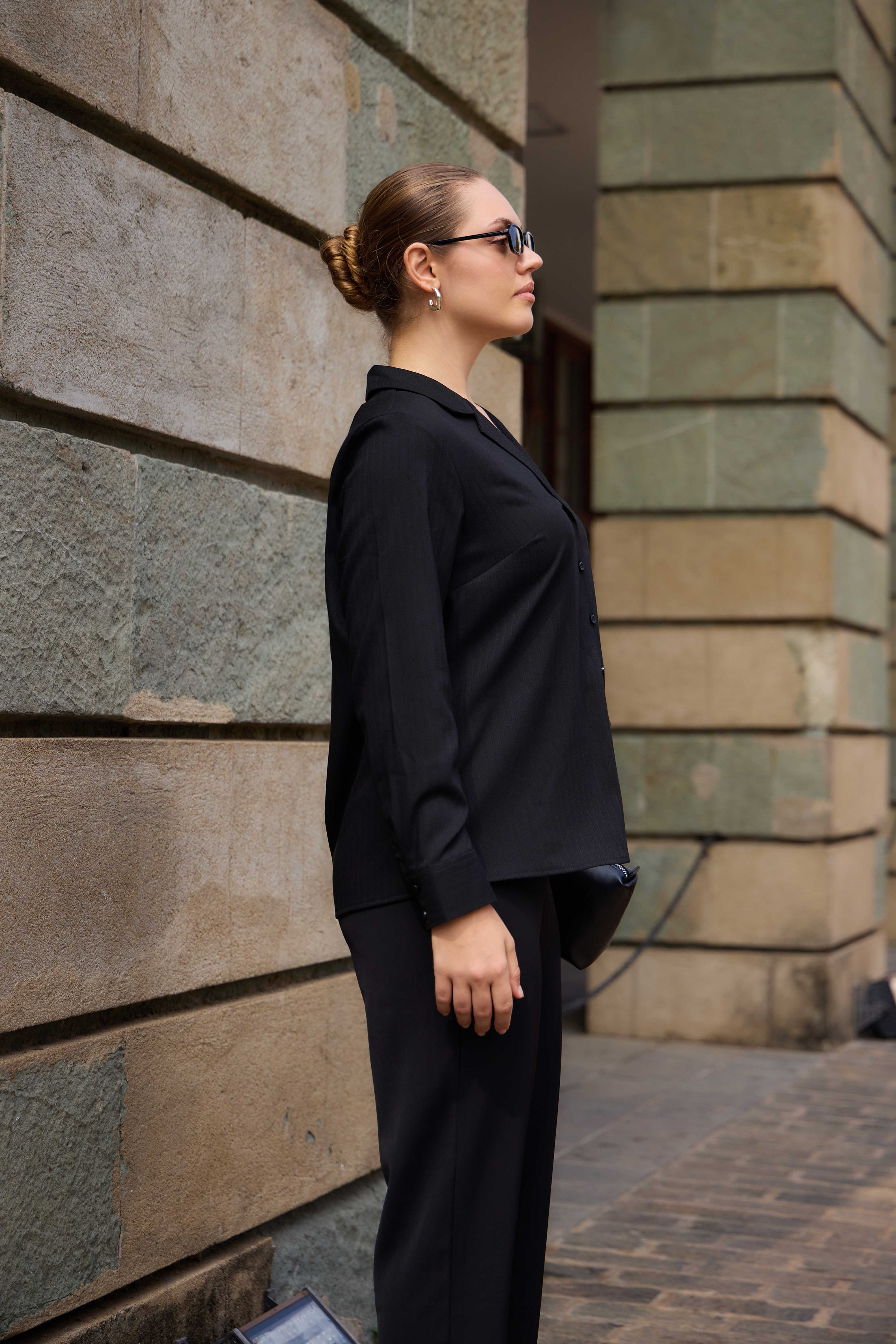 The shirt is characterized by its flat, open notch lapel and a clean button-front placket. It features three-quarter length sleeves finished with wide, exaggerated cuffs that add a tailored touch. The fabric has a subtle vertical pinstripe texture and a straight-cut hem, allowing it to be worn comfortably untucked as a boxy silhouette or tucked in for a more defined waistline.