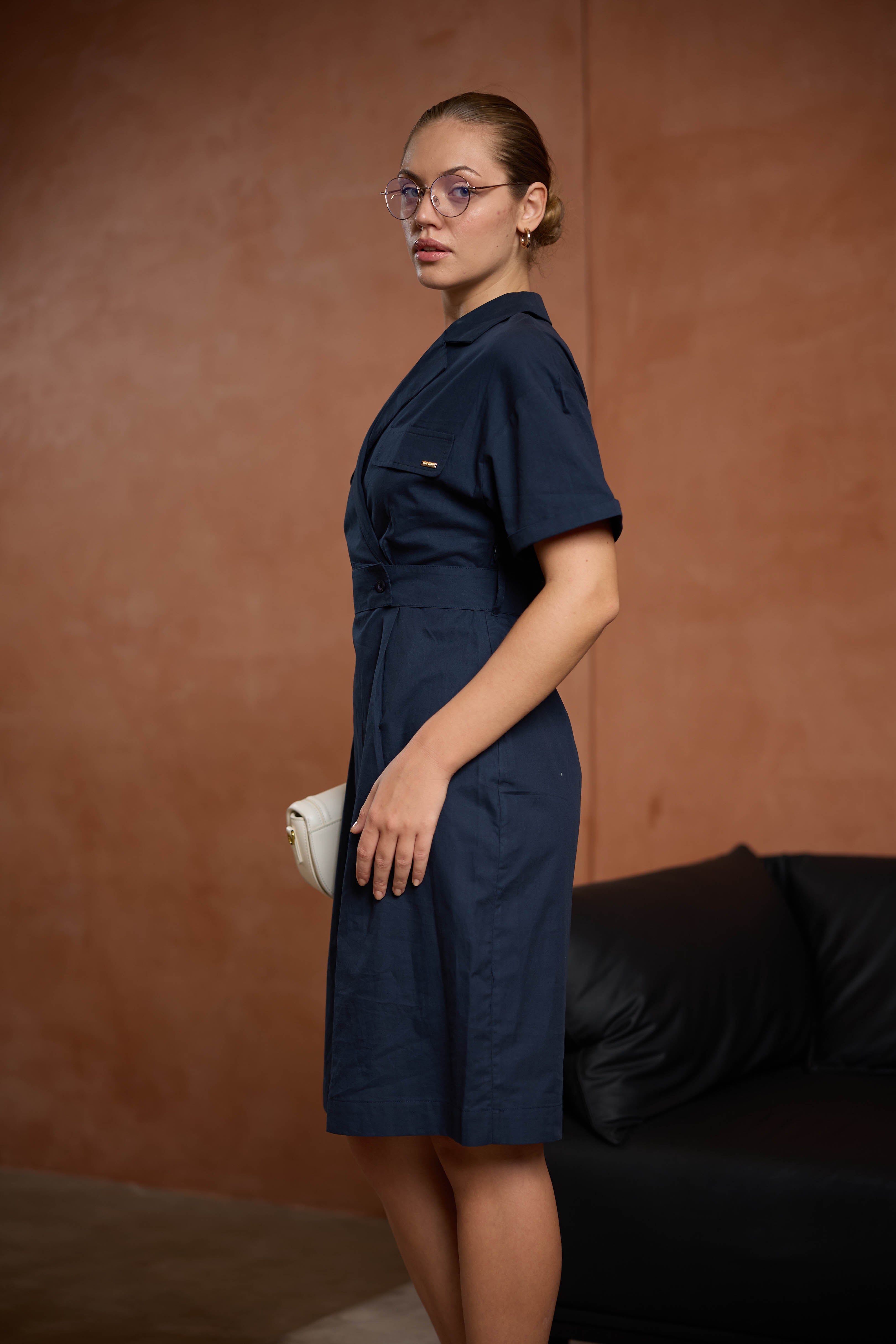 A sleek, minimalistic dress featuring turn-up short sleeves with drop shoulder and an overlapping blazer-style collar. The design includes front flap detailing and an adjustable fabric belt at the waist, creating a sophisticated yet simple silhouette. Perfect for a polished, contemporary look with a touch of elegance.