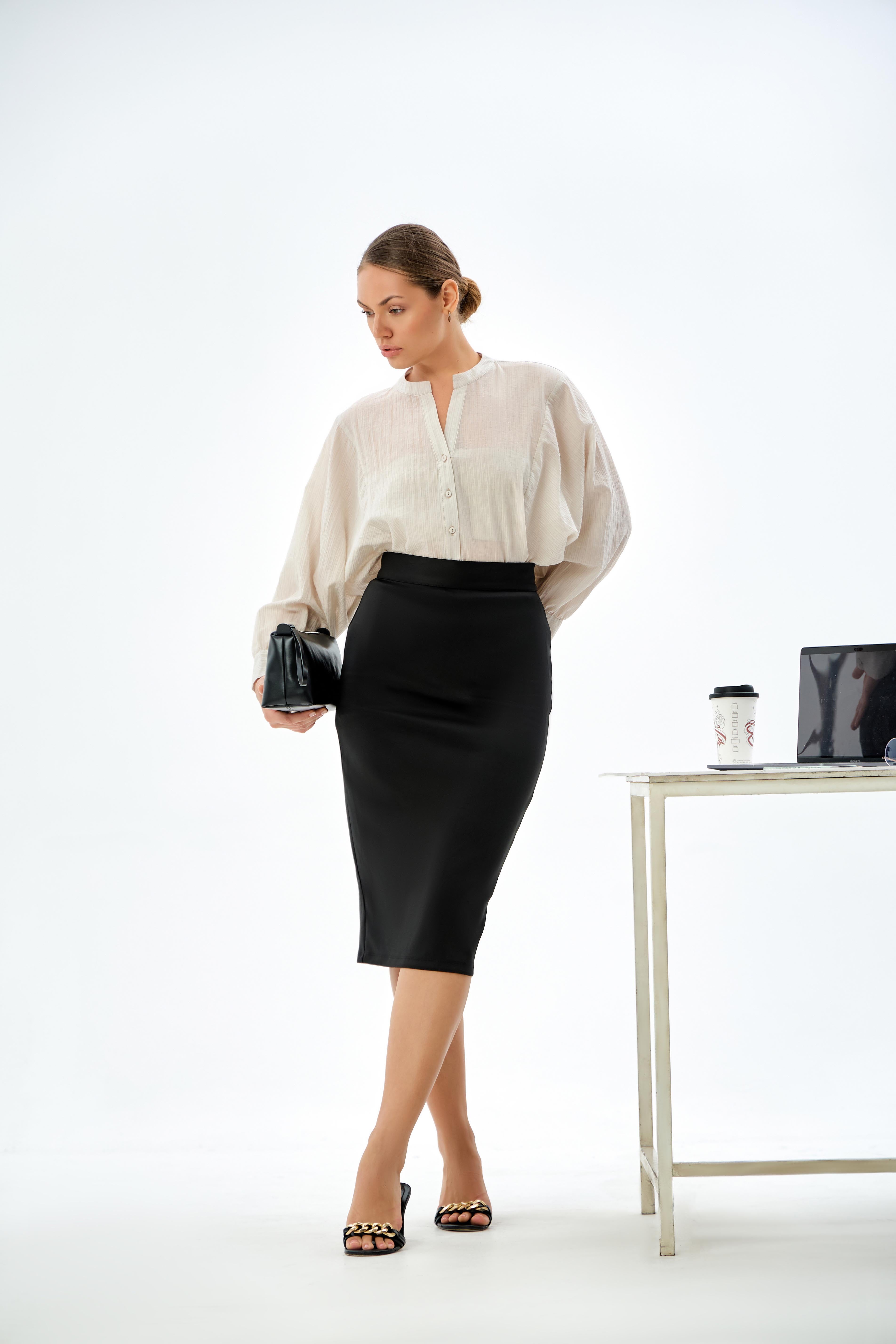 This is an oversized, flowing blouse that masterfully blends light structure with soft, feminine volume, ideal for an elevated casual aesthetic.The top is a serene, translucent pale blue . The fabric appears to be an ultra-lightweight, silk blend with a subtle textured stripe, giving it a delicate, ethereal quality and soft dimension.The overall fit is relaxed and deliberately oversized, with a curved shirttail hem that is slightly longer in the back, adding to the garment's casual elegance.