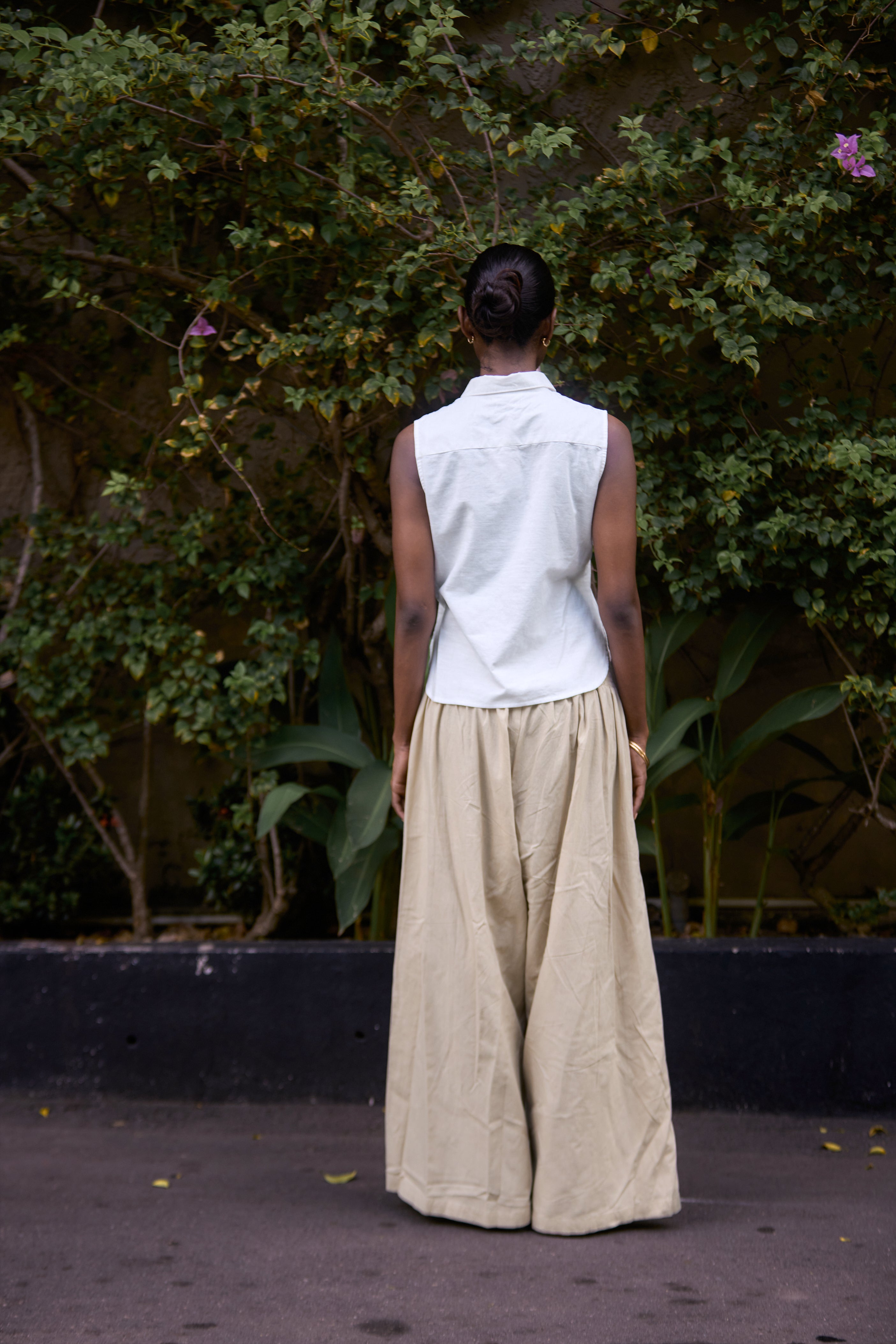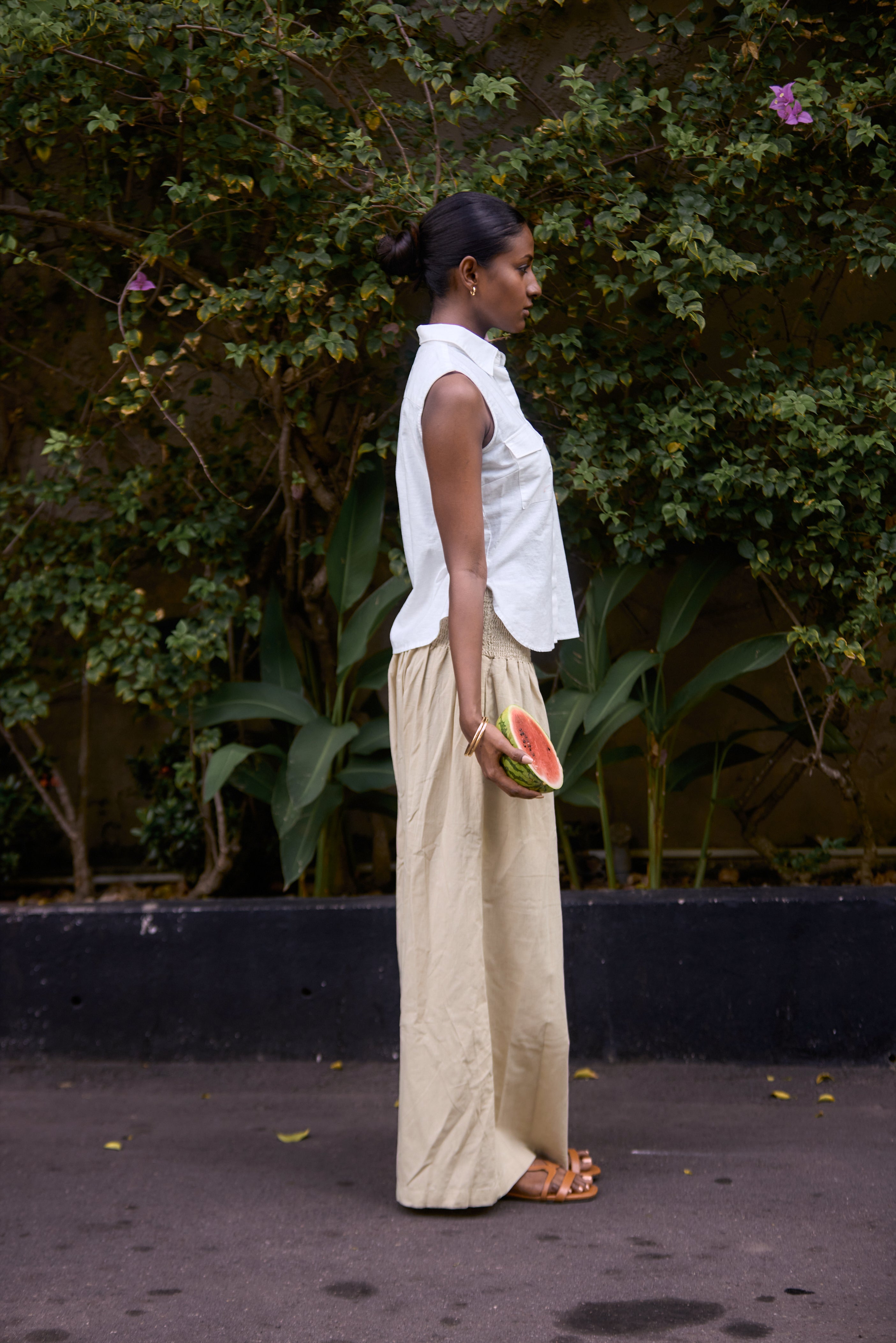 This sleeveless top is crafted from breathable linen-cotton fabric, offering all-day comfort with a clean, refined look. Designed in a solid color, it features a hidden placket for a sleek button-down finish. Front flap pockets add a subtle utility touch, while the curved hem enhances the silhouette with a modern edge. Lightweight and versatile, this top is perfect for effortless everyday styling.