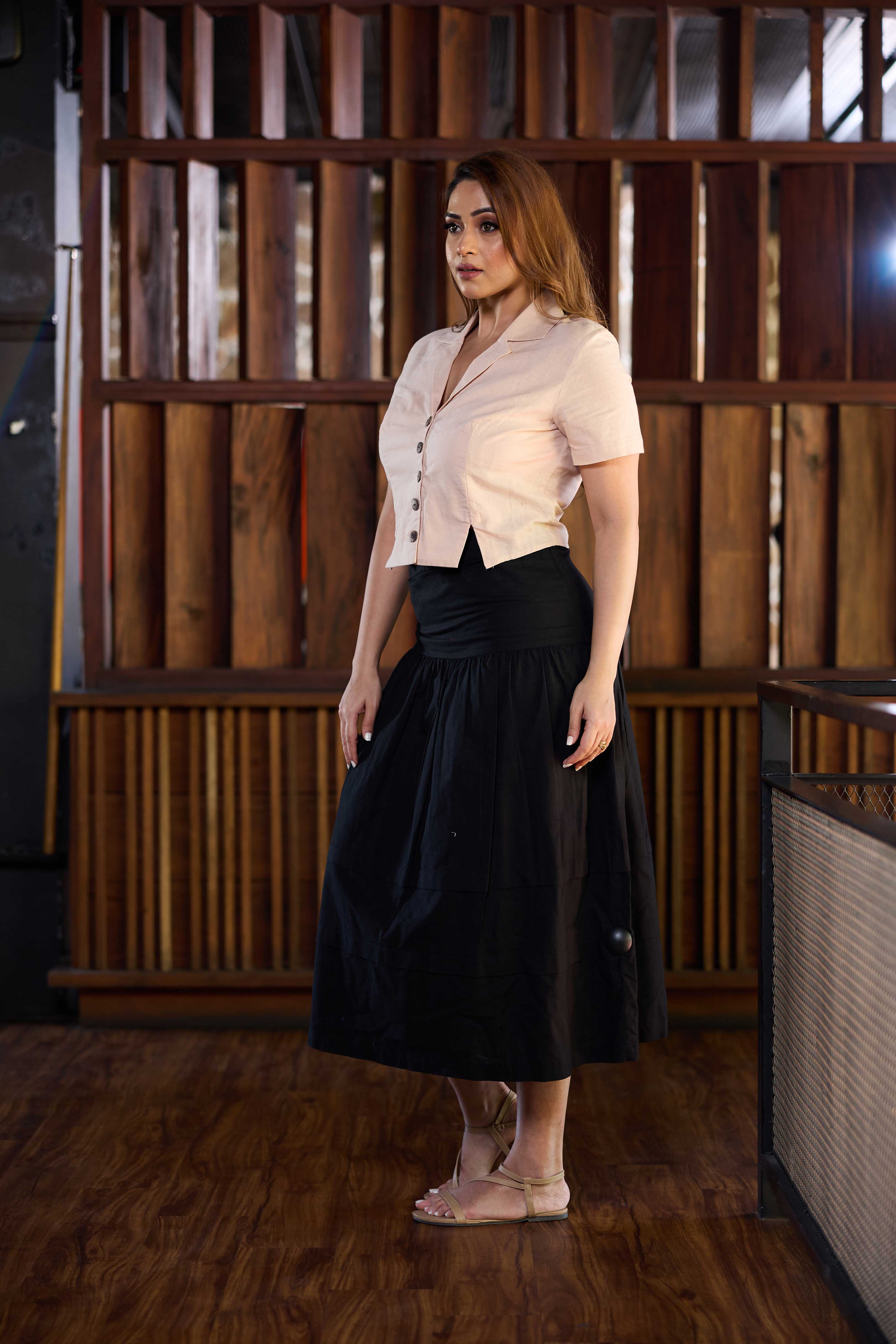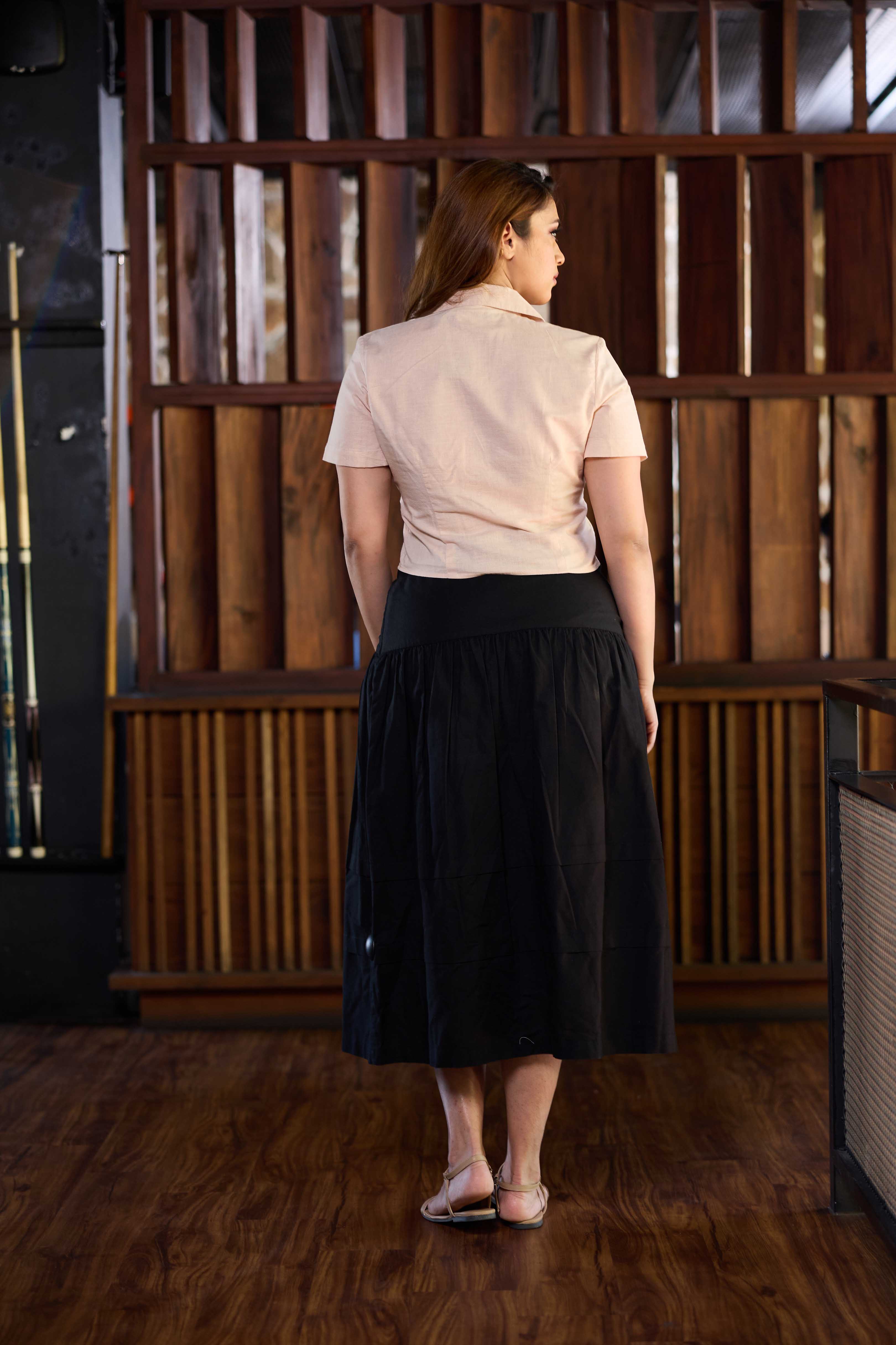 Elevate your everyday style with this midi-length skirt, crafted from breathable linen-cotton fabric for a light, airy feel. Delicate pintuck detailing adds texture and movement, bringing a touch of refinement to its relaxed silhouette. Whether paired with a tucked-in blouse or a casual tee, it’s a timeless piece made for effortless dressing.