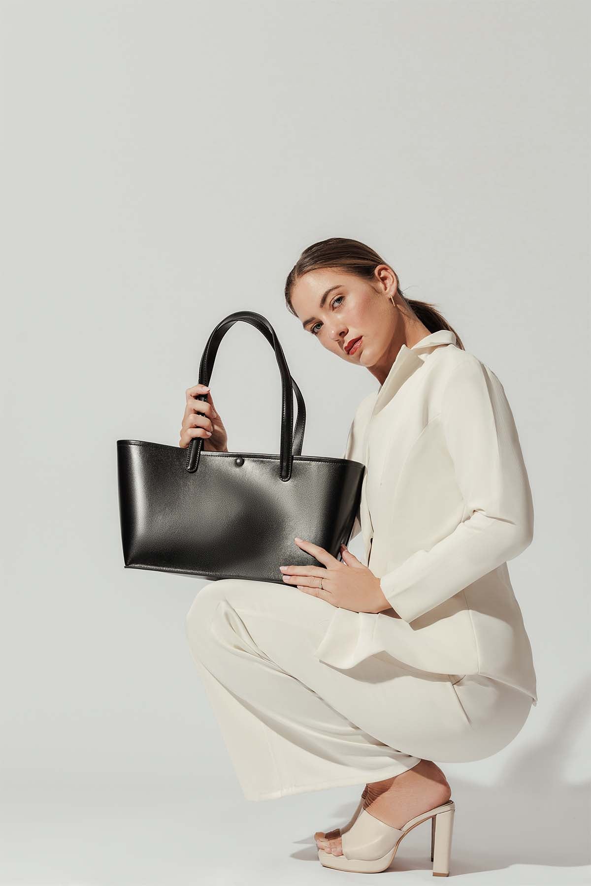 Refined lines meet everyday versatility. Crafted in smooth cowhide, The Berth Quarter Tote includes an extra pouch and comes in bold black or soft cream — a design that holds its shape and its sophistication, wherever you dock.
