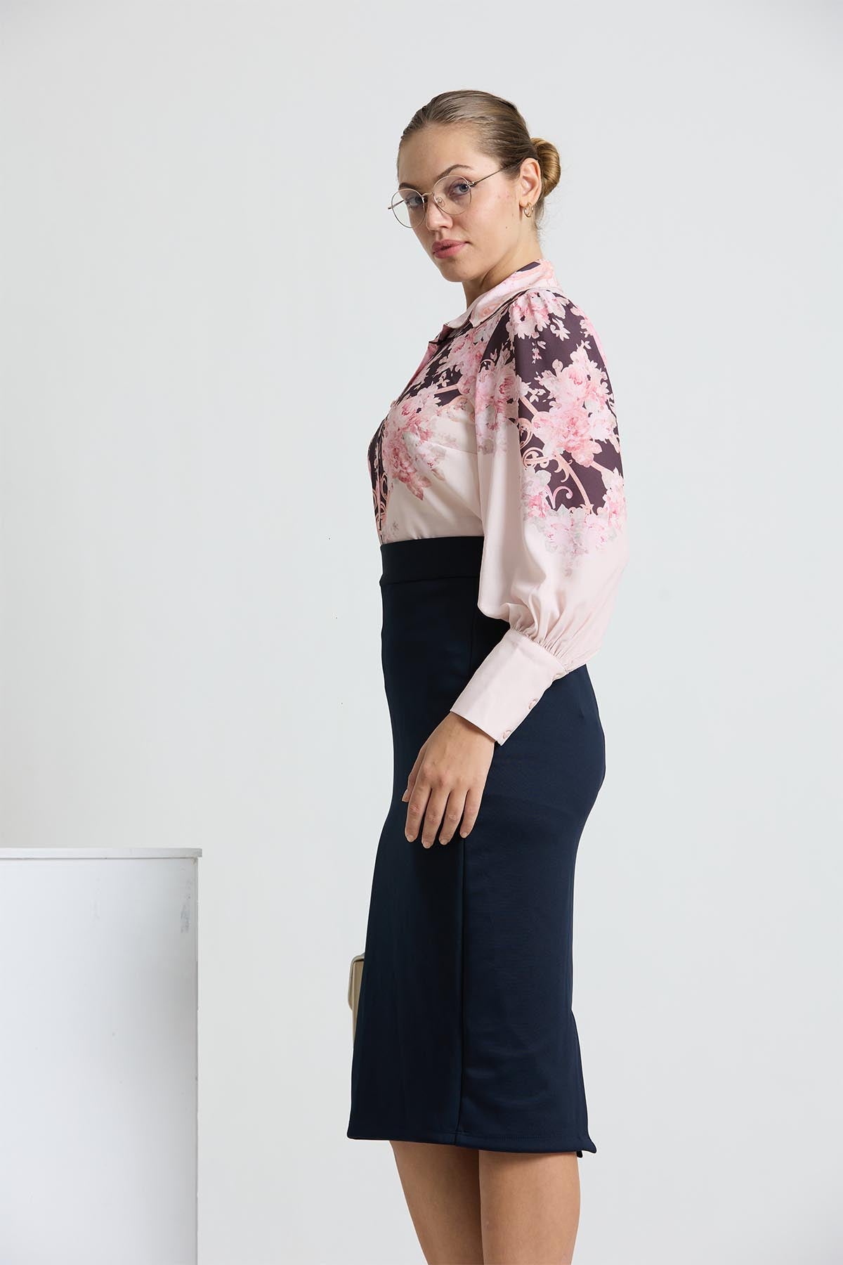 This sophisticated formal wear top showcases long sleeves and a classic shirt collar, lending it a timeless, professional appeal. The front features an eye-catching floral placement print that adds a touch of femininity and visual interest without overpowering the look. Crafted in a smooth, semi-fitted silhouette, the top offers a flattering shape that skims the body comfortably. Ideal for office wear, business meetings, or any polished occasion, it pairs beautifully with tailored trousers or skirts for an elegant ensemble.