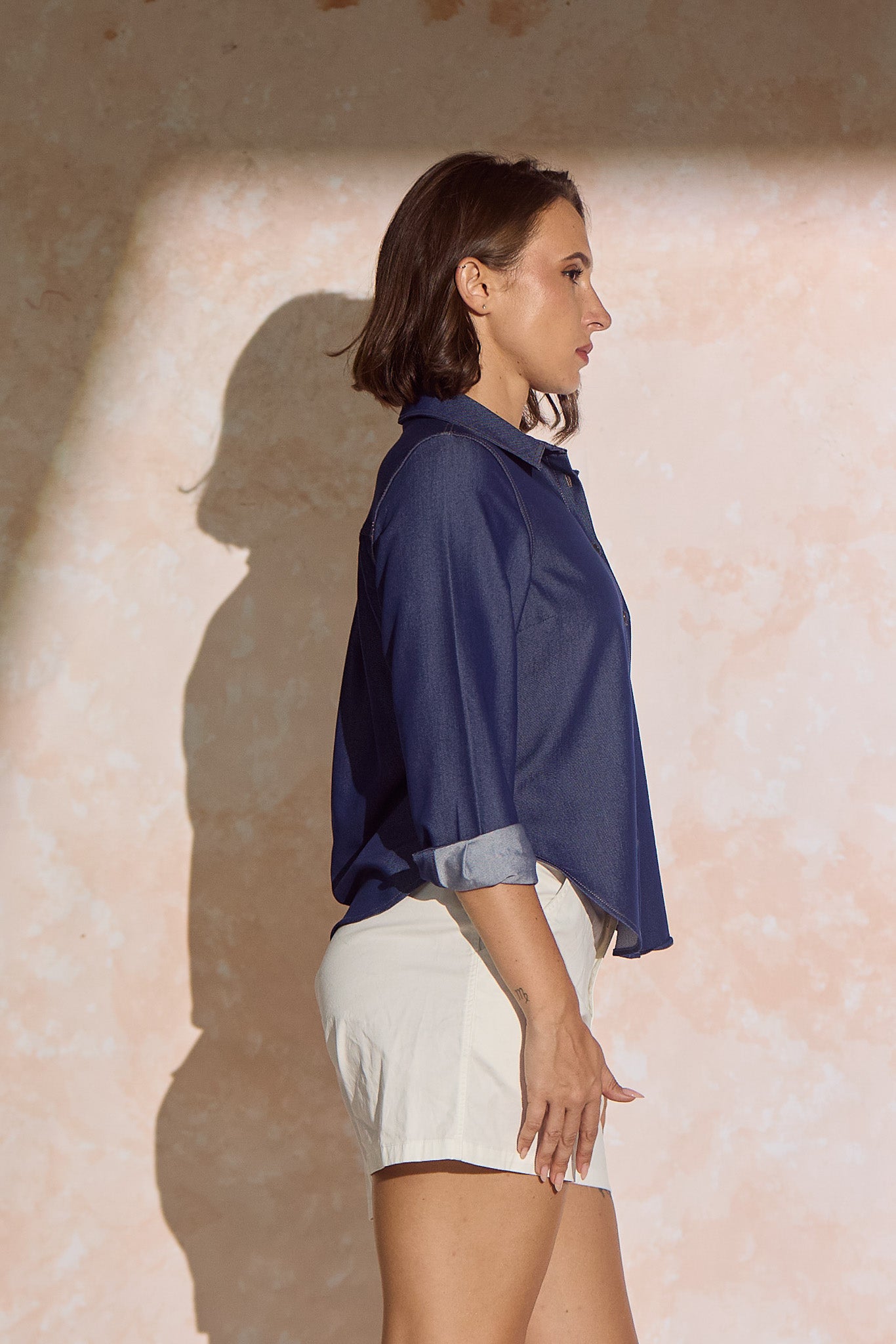 The most notable details are the contrast stitching and the antique brass buttons, which add a rustic and stylish touch to the shirt's simple design. The sleeves are long with buttoned cuffs, and the hemline is curved, giving it a soft, rounded shape that can be worn tucked in or out. The model is wearing the shirt with high-waisted, loose-fitting white trousers, creating a relaxed yet polished look.