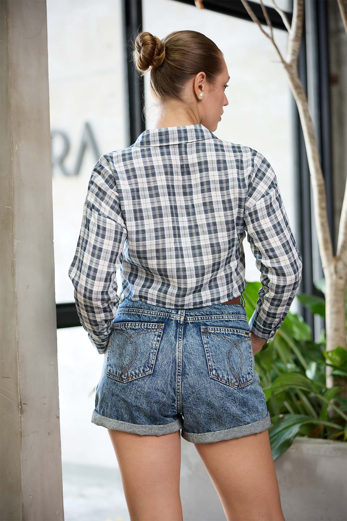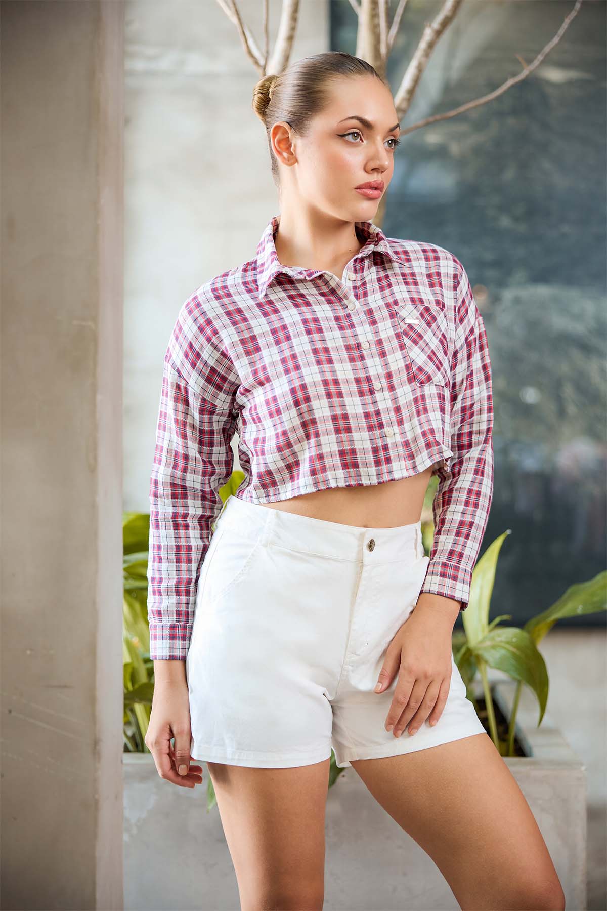 Add a touch of edge to your casual style with this cropped shirt, crafted in classic check fabric. Featuring a relaxed drop shoulder design and long sleeves, it’s finished with a single chest pocket accented by a sleek metal tab for a modern twist. Effortlessly cool and easy to style, this piece pairs perfectly with high-waisted jeans or skirts for an elevated off-duty look.