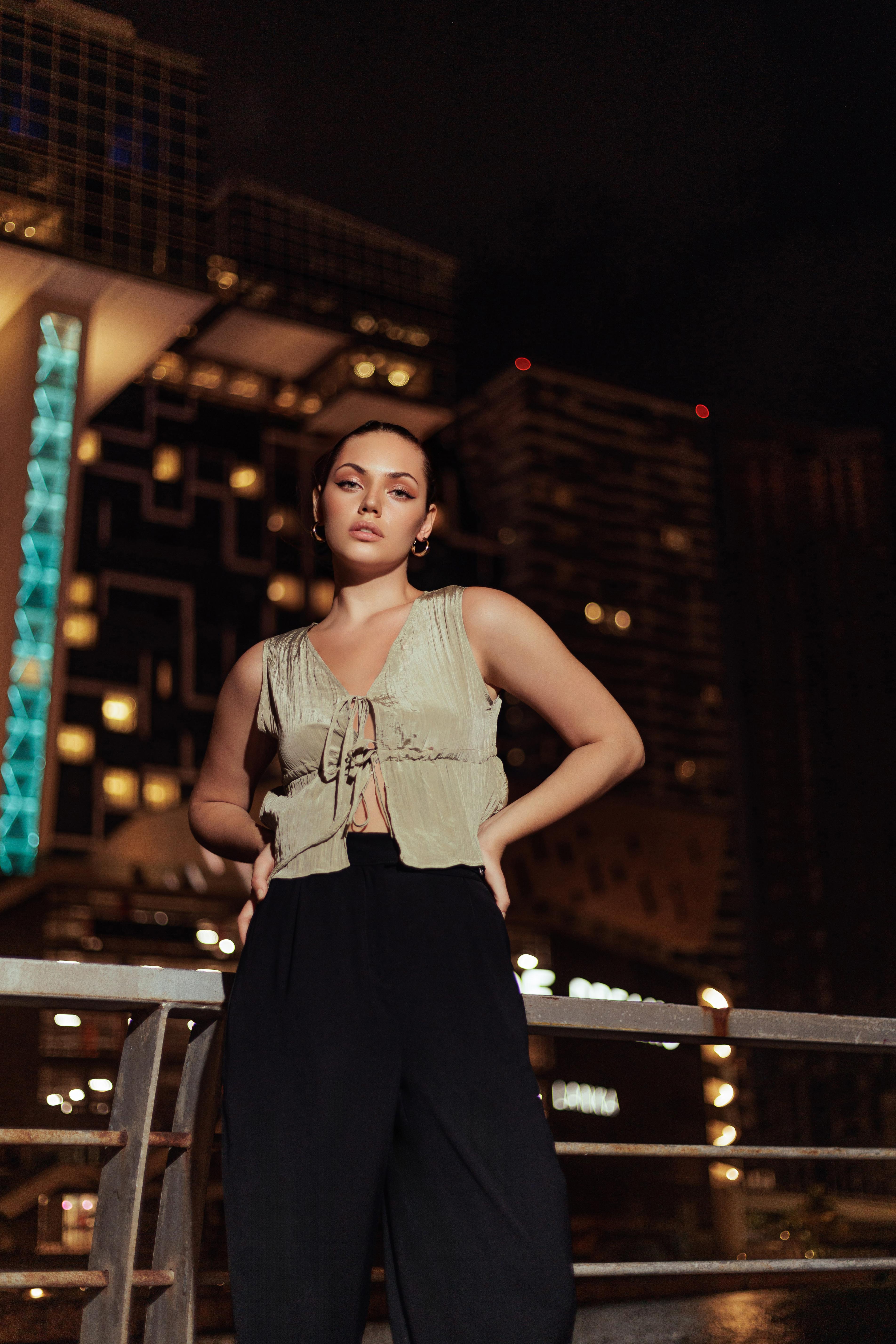 Elevate your evening look with the Cinch and Flounce Tie Top, a chic and versatile piece available in classic color shades with lace-up detail. This charming top features a plunging V-neckline with a tie-front detail that cinches the waist, creating a flattering, slightly cropped silhouette, while the sleeveless cut makes it ideal for layering or warm-weather events. Perfect for a sophisticated dinner, a cocktail gathering, or a stylish night out, this top pairs beautifully with high-waisted bottoms to balance its fit. Style the black-and-white print version with wide-leg white trousers and minimalist silver jewelry for a modern contrast, or pair the sage green top with black tailored pants and gold accents for an effortlessly elegant ensemble.