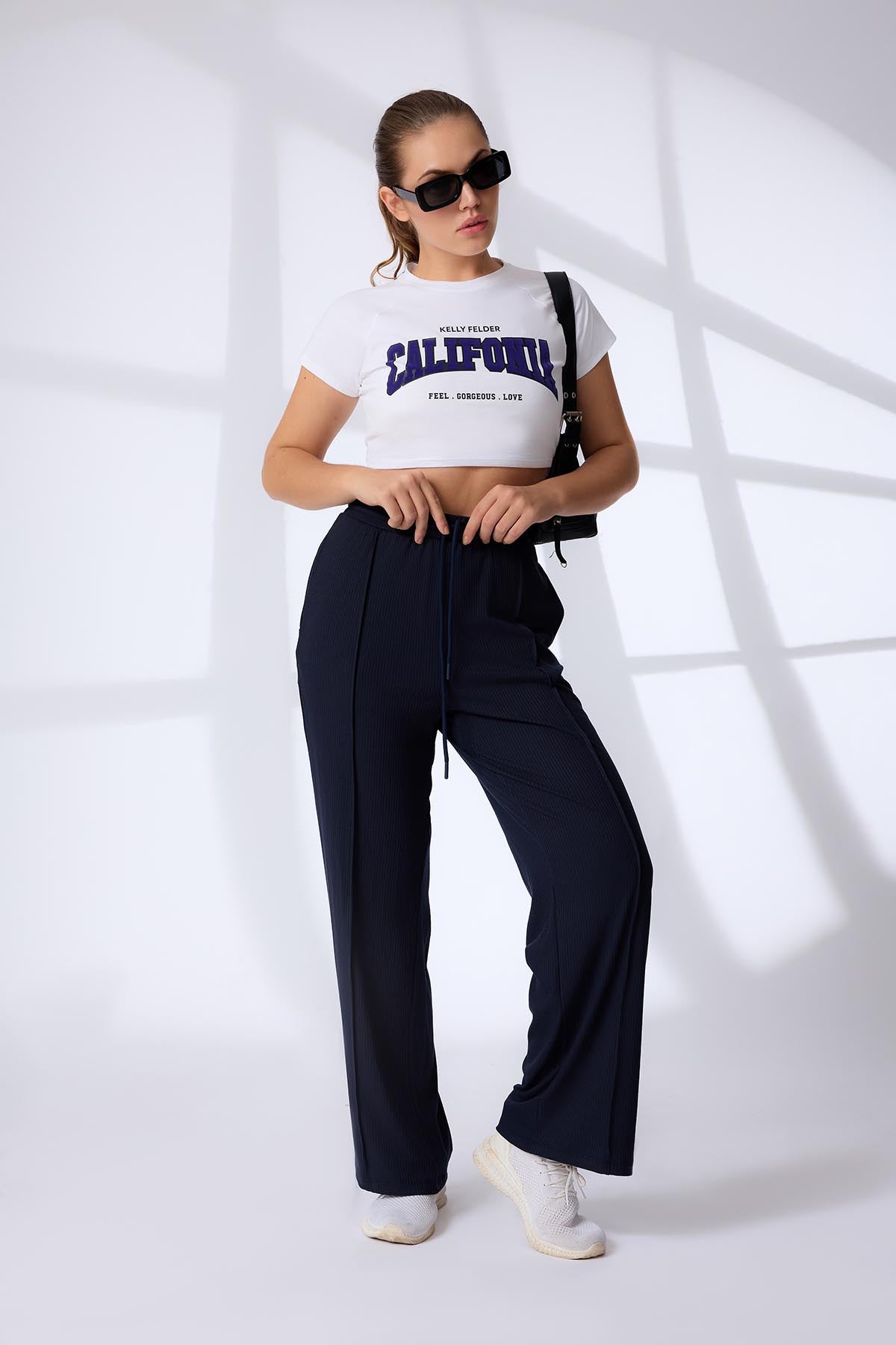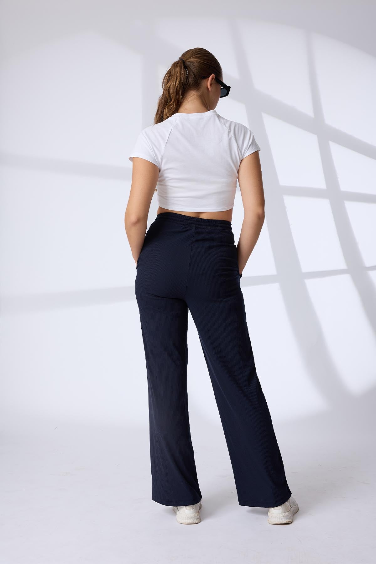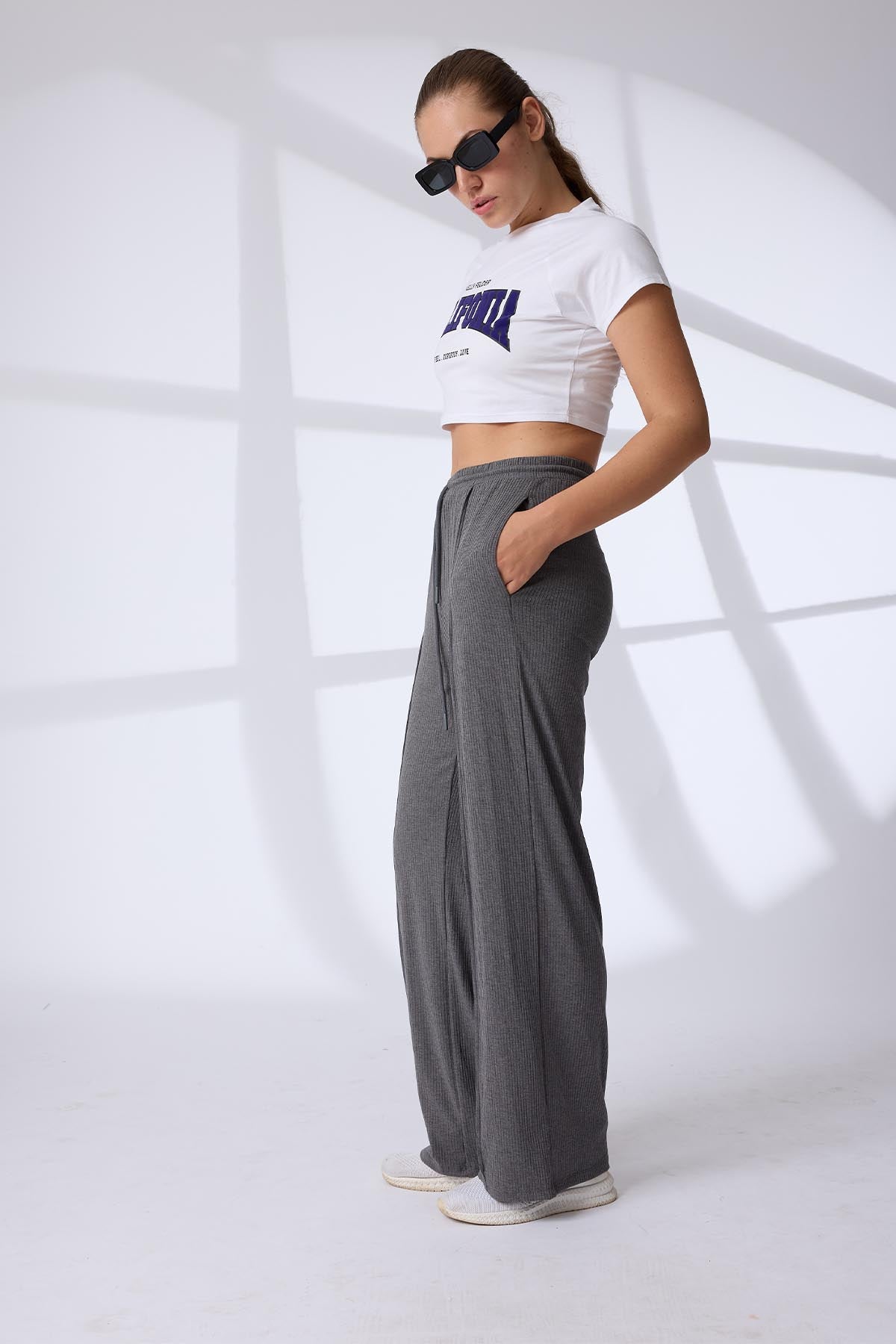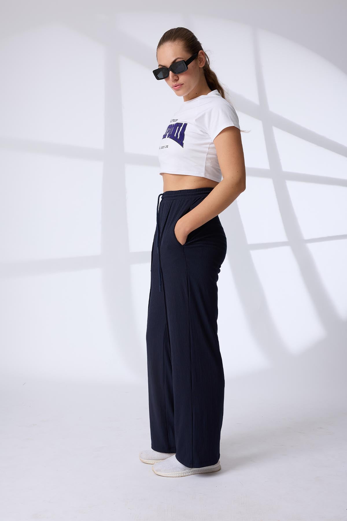 These lounge pants feature a relaxed fit with a soft ribbed fabric detail, offering both comfort and texture. An adjustable drawcord waistband ensures a customizable fit, while crisp pintuck detailing down the front adds a tailored, structured look. Perfect for relaxed days or refined loungewear styling, these pants balance ease with subtle sophistication.
