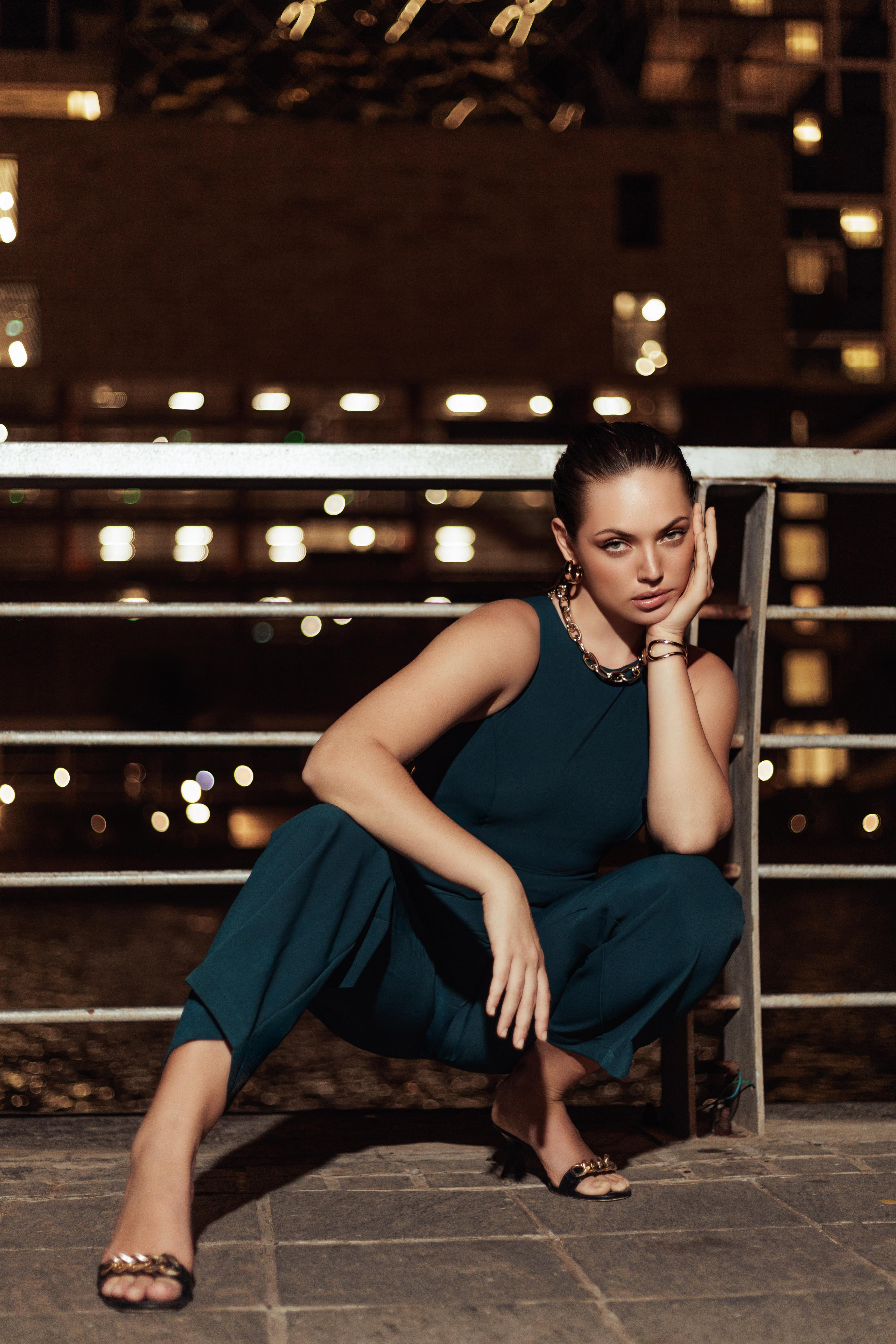 Turn heads in this sleek eveningwear jumpsuit, crafted from a shimmering fabric that catches the light with every move. Featuring a sleeveless silhouette and a flattering fit, it's the perfect statement piece for sophisticated nights out.