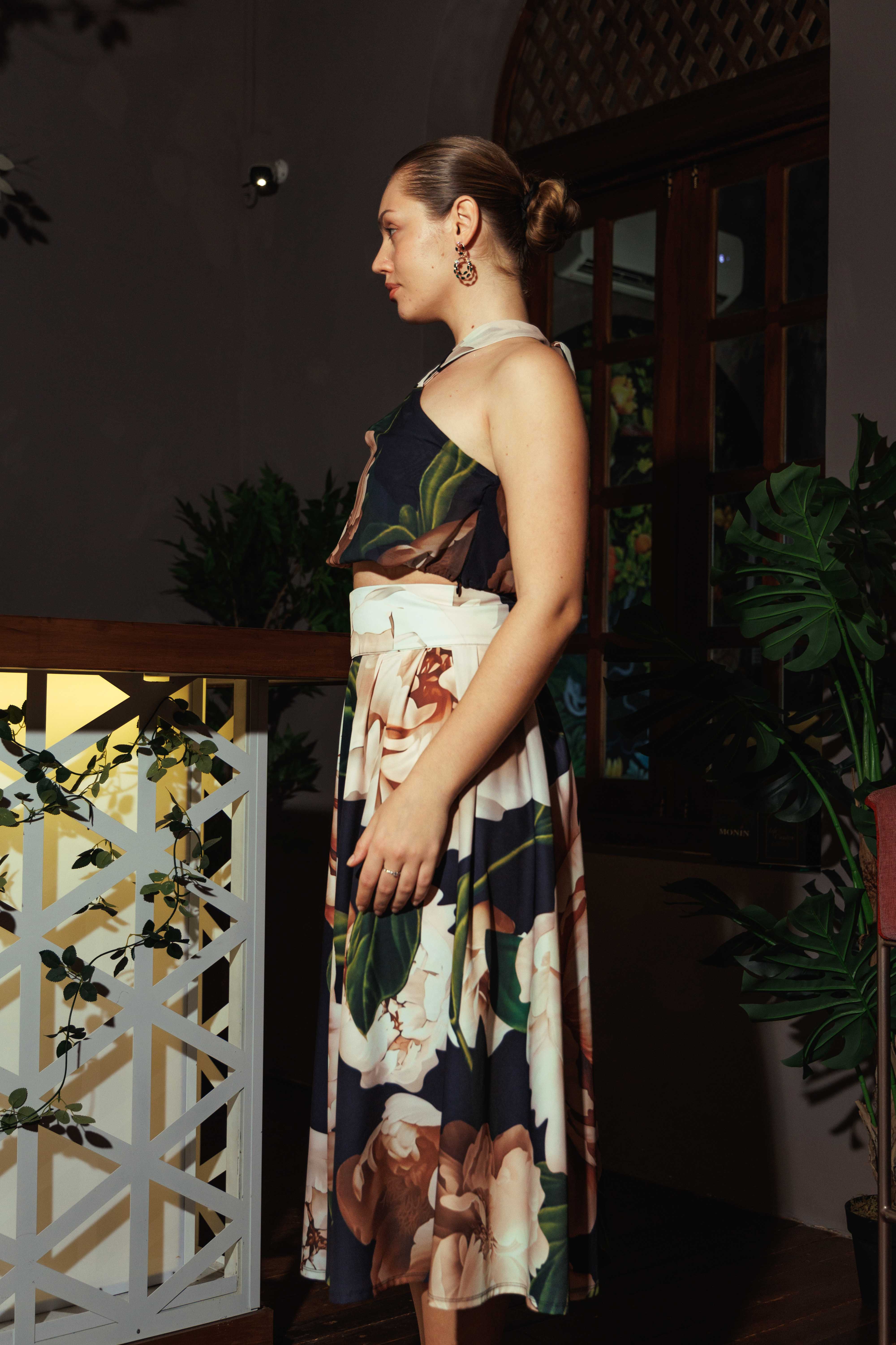 Elevate your evening look with this Floral printed Set of top & skirt - a stunning two-piece ensemble that exudes romantic elegance. This set features a charming cropped halter top and a voluminous A-line midi skirt, both adorned with a beautiful, bold rose print in shades of dusty pink,black and rich burgundy color hues. The luxurious fabric and graceful silhouette make this the perfect choice for an outdoor wedding, a garden party, or a formal dinner night-out. Pair this exquisite set with delicate heeled sandals or classic pumps, and accessorize with simple drop earrings and a small clutch to allow the stunning floral pattern to take center stage. This ensemble is designed to make a memorable and sophisticated statement at any special occasion.