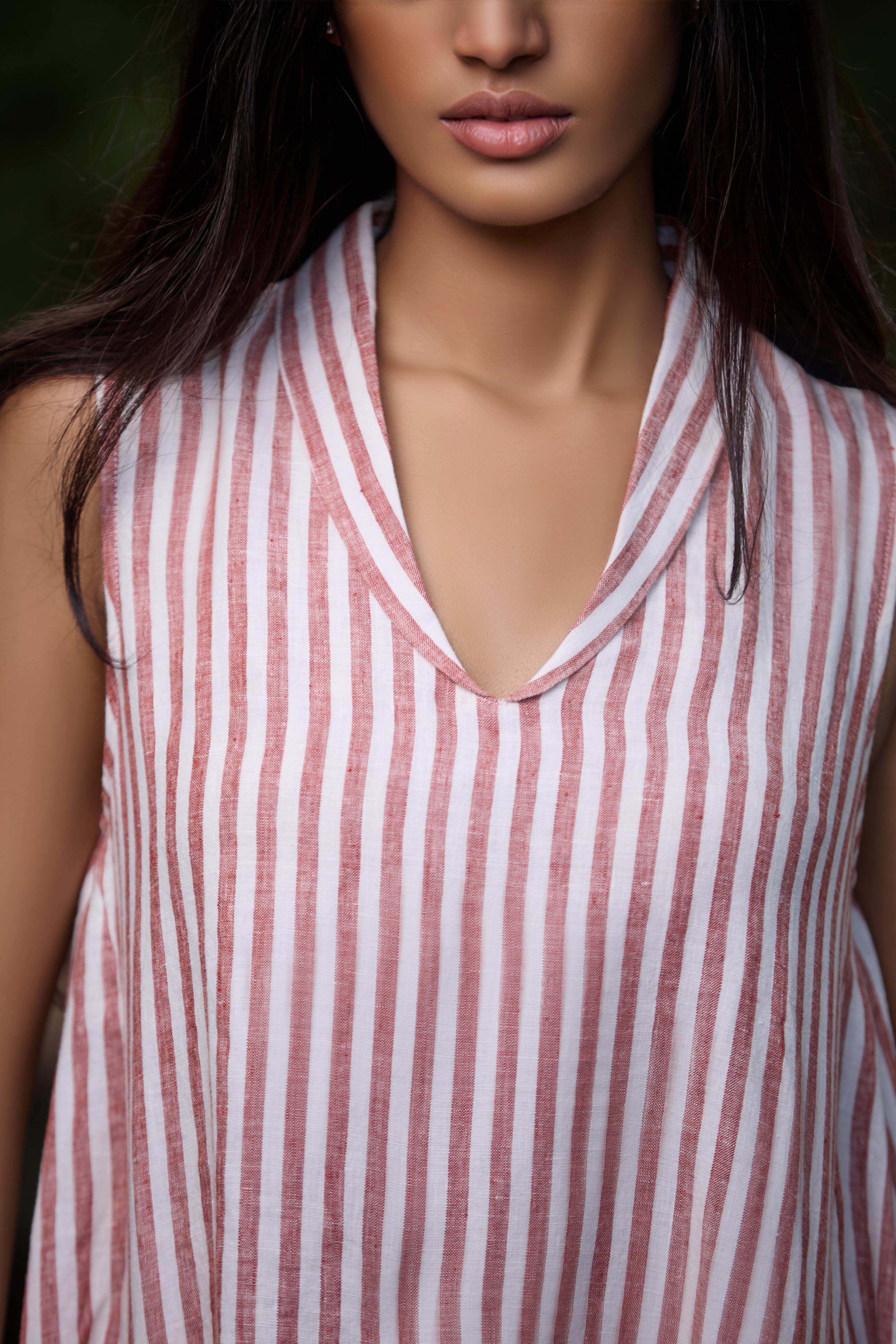 Stay effortlessly stylish in this sleeveless knee-length dress, crafted from 100% linen stripe fabric for a naturally breathable feel. Designed with a relaxed, baggy silhouette, it offers both comfort and ease. The dress features a unique collar detail and functional pockets, adding charm and practicality to the look. Perfect for warm days, it’s a timeless blend of simplicity, texture, and modern design.