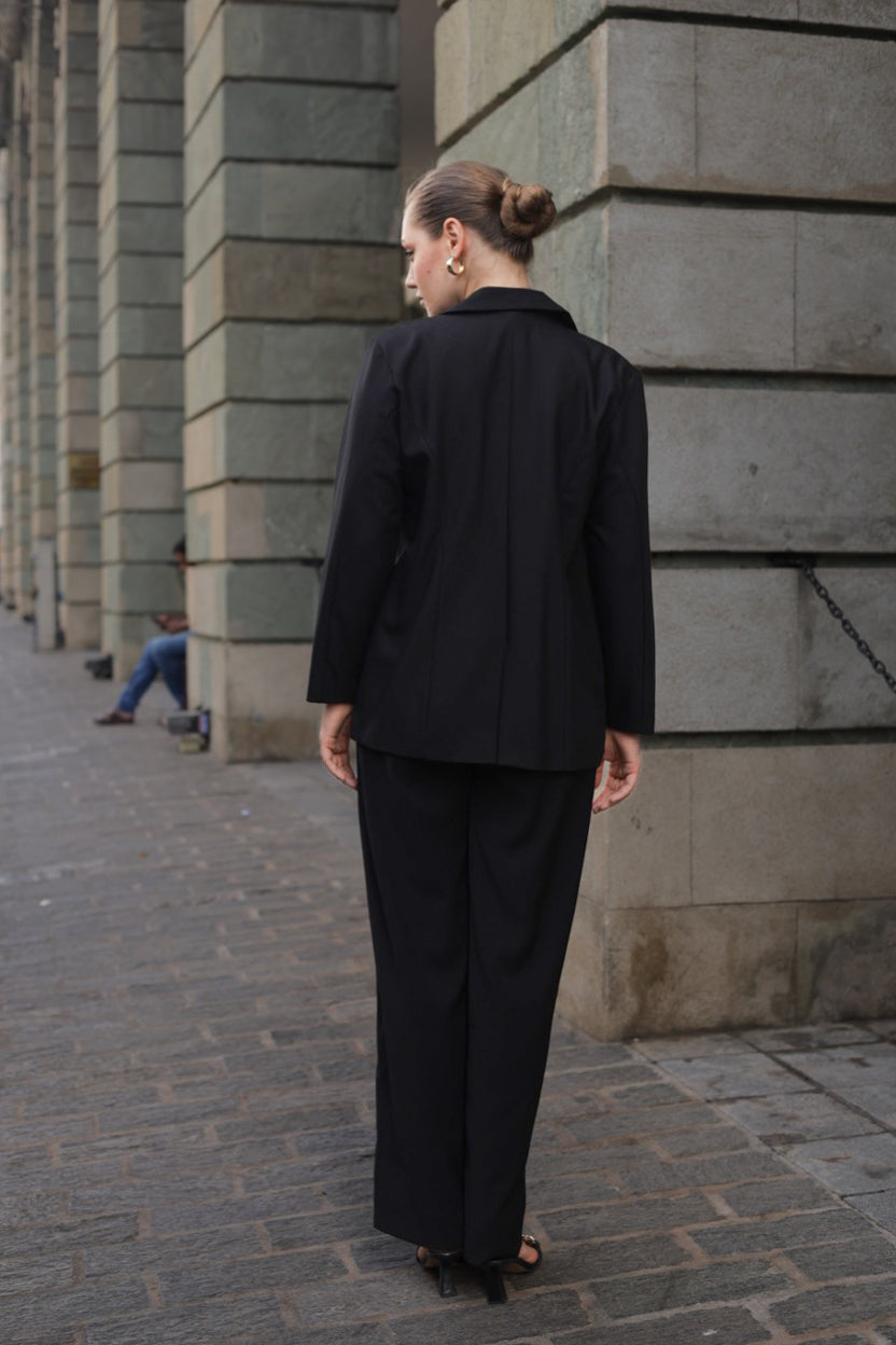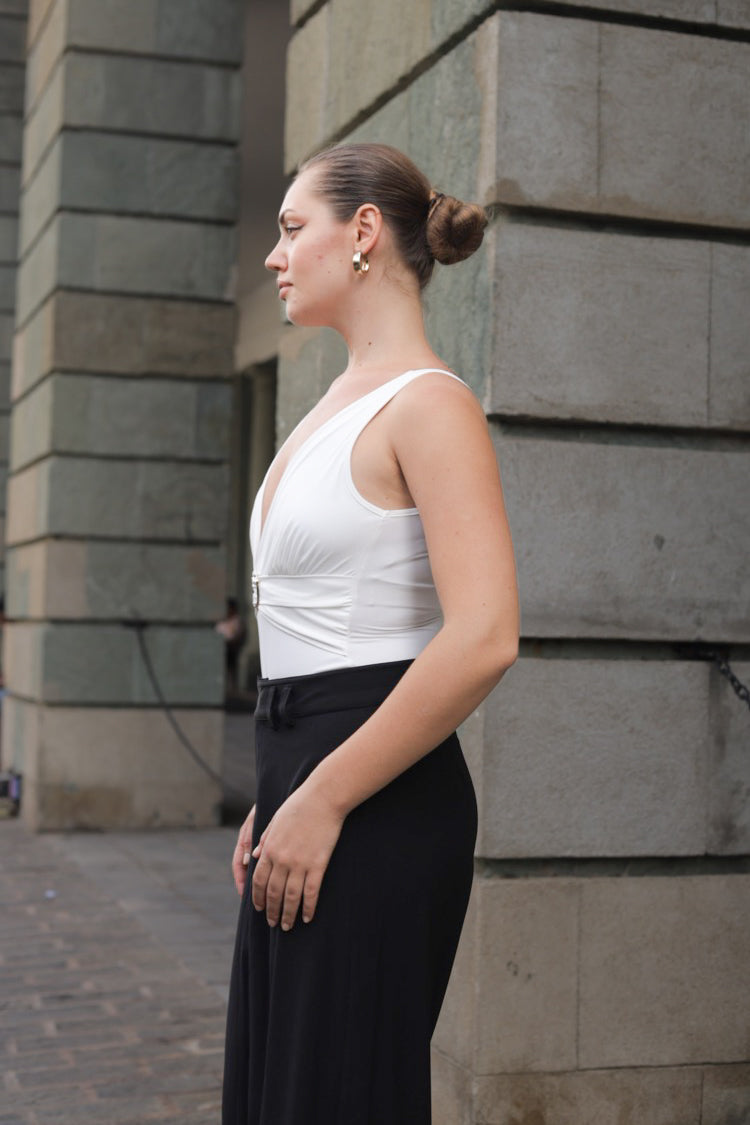 This is a chic, form-fitting bodysuit designed to create a sleek and modern silhouette. It features a deep V-neckline with soft gathers that enhance the bust and a metallic ring detail at the waist, adding a touch of elegance. The sleeveless cut and smooth, stretch fabric ensure a comfortable yet sculpted fit, perfect for layering under tailored jackets or pairing with high-waisted trousers. This piece blends sophistication with versatility, making it ideal for both polished workwear and refined evening looks