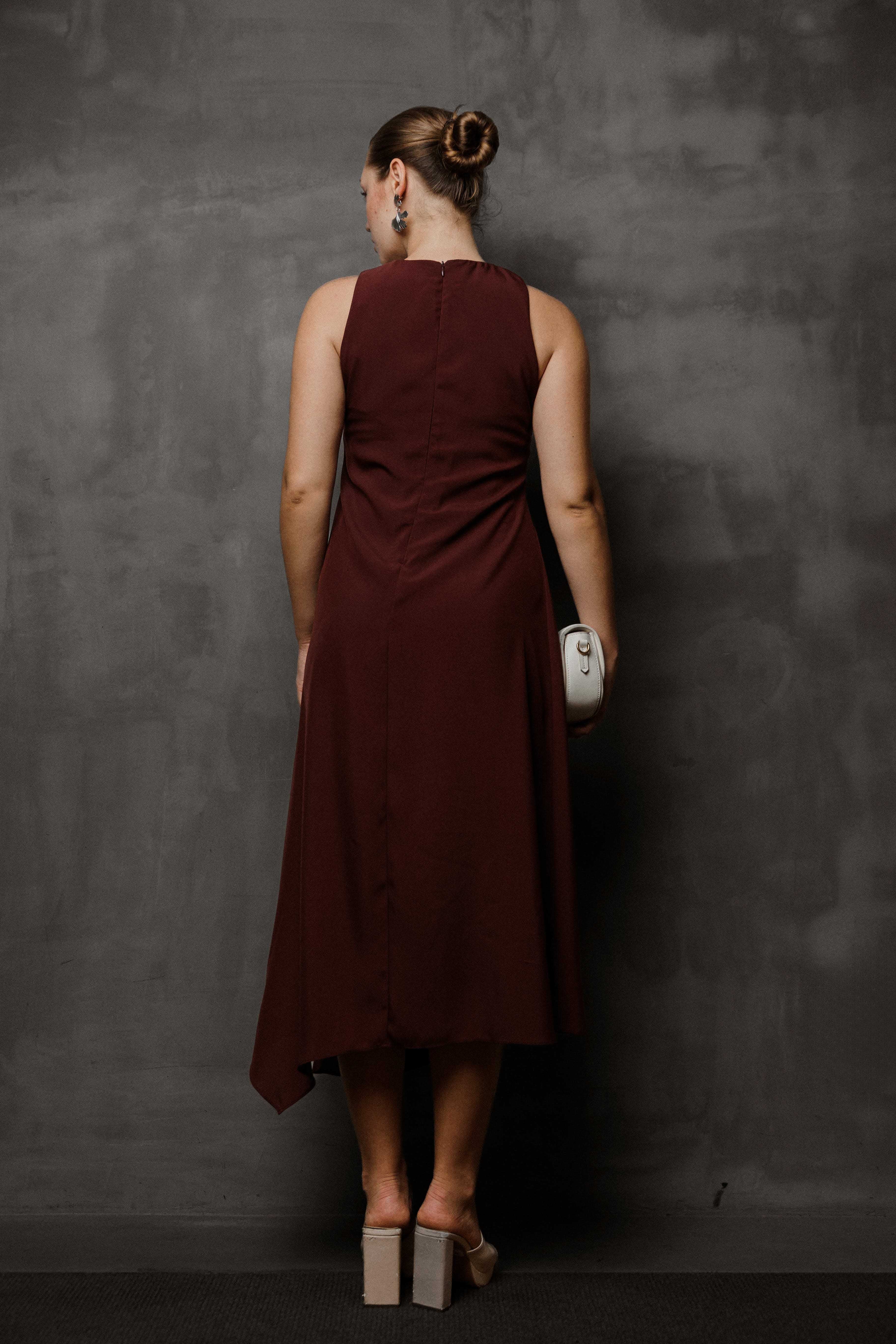 Make a striking entrance, a vibrant evening gown that expertly blends in rich seasonal colors, with a combination a flowy panel which creates a dramatic effect. This elegant midi dress features slender shoulder straps and a semi-fitted bodice, from which the skirt flows out into a beautiful A-line silhouette. The luxurious, flowing fabric makes this a magnificent choice for a black-tie event, a sophisticated wedding reception, or a formal holiday party, offering a modern yet timeless look. To style, keep accessories simple to let the dress's design shine, opting for clear or nude heeled sandals and subtle gold jewelry, like thin hoop earrings, for an ensemble that is bold, refined, and utterly memorable.