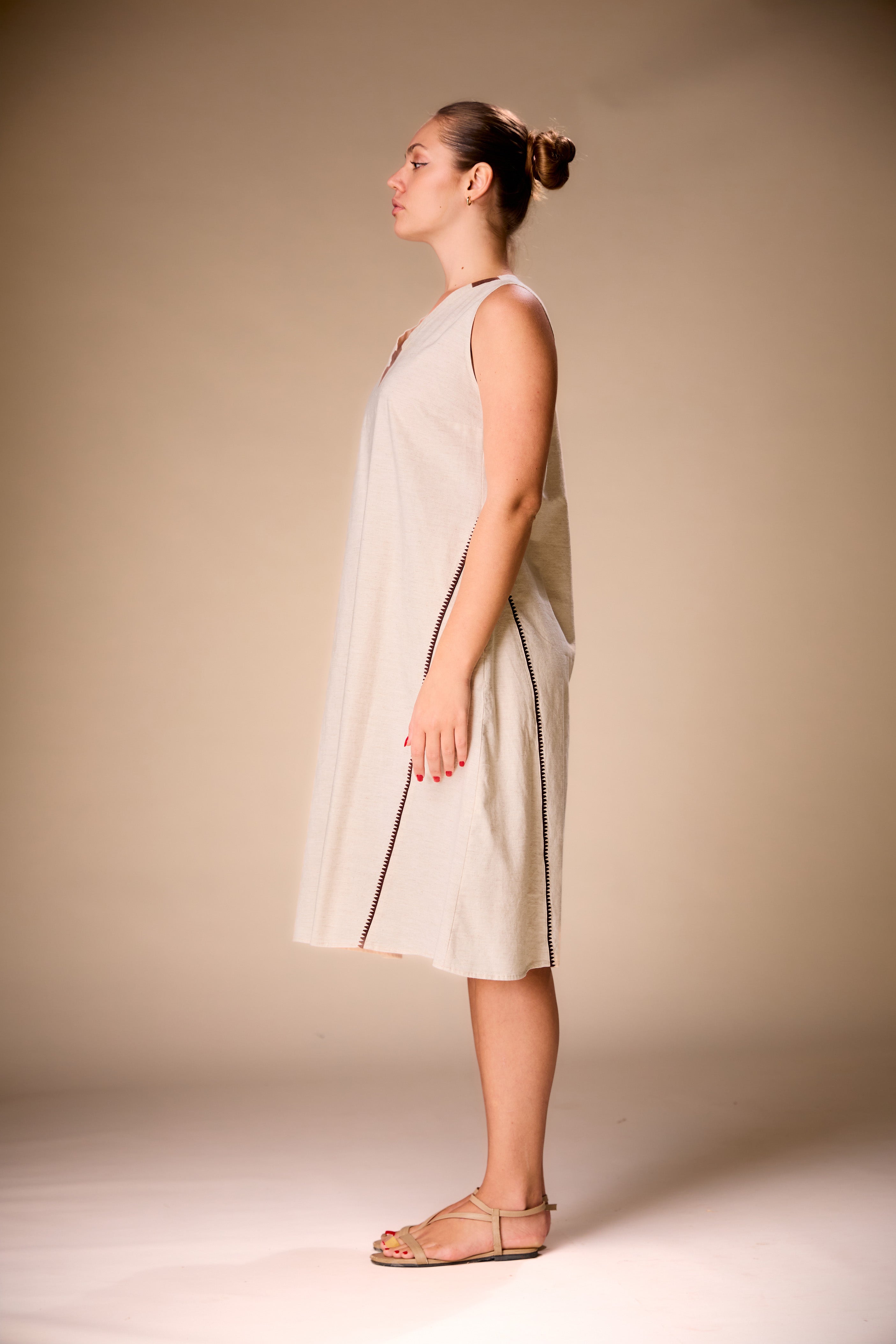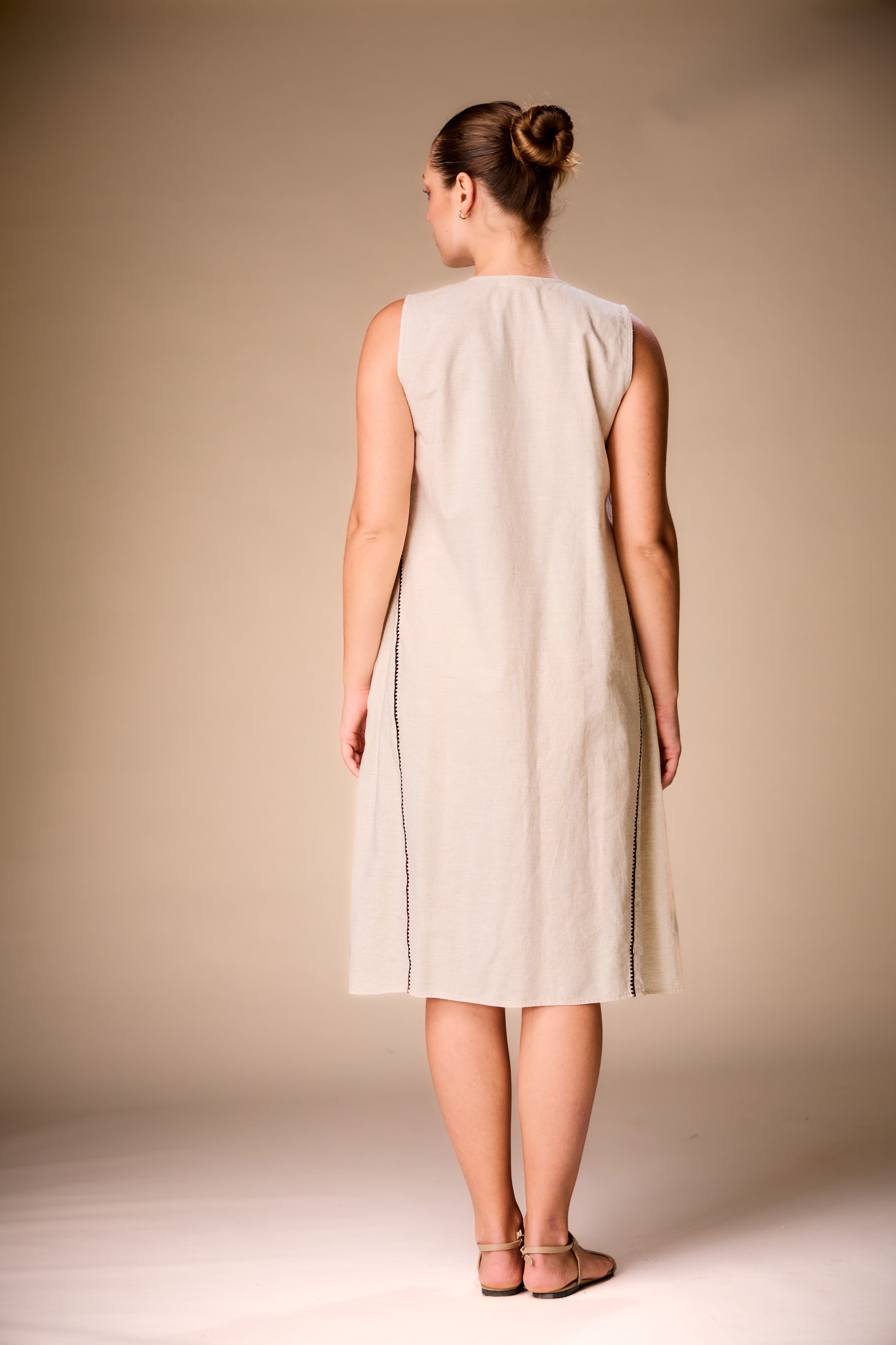 This sleeveless midi dress features a flattering V-neckline accented with contrast detailing for a refined, modern look. Delicate embroidery along the side adds a subtle handcrafted touch, elevating the clean silhouette. Designed for effortless elegance, the relaxed fit allows easy movement while maintaining a graceful shape. Versatile and timeless, this dress is perfect for warm days, casual gatherings, or understated evening wear with a touch of artisanal charm.