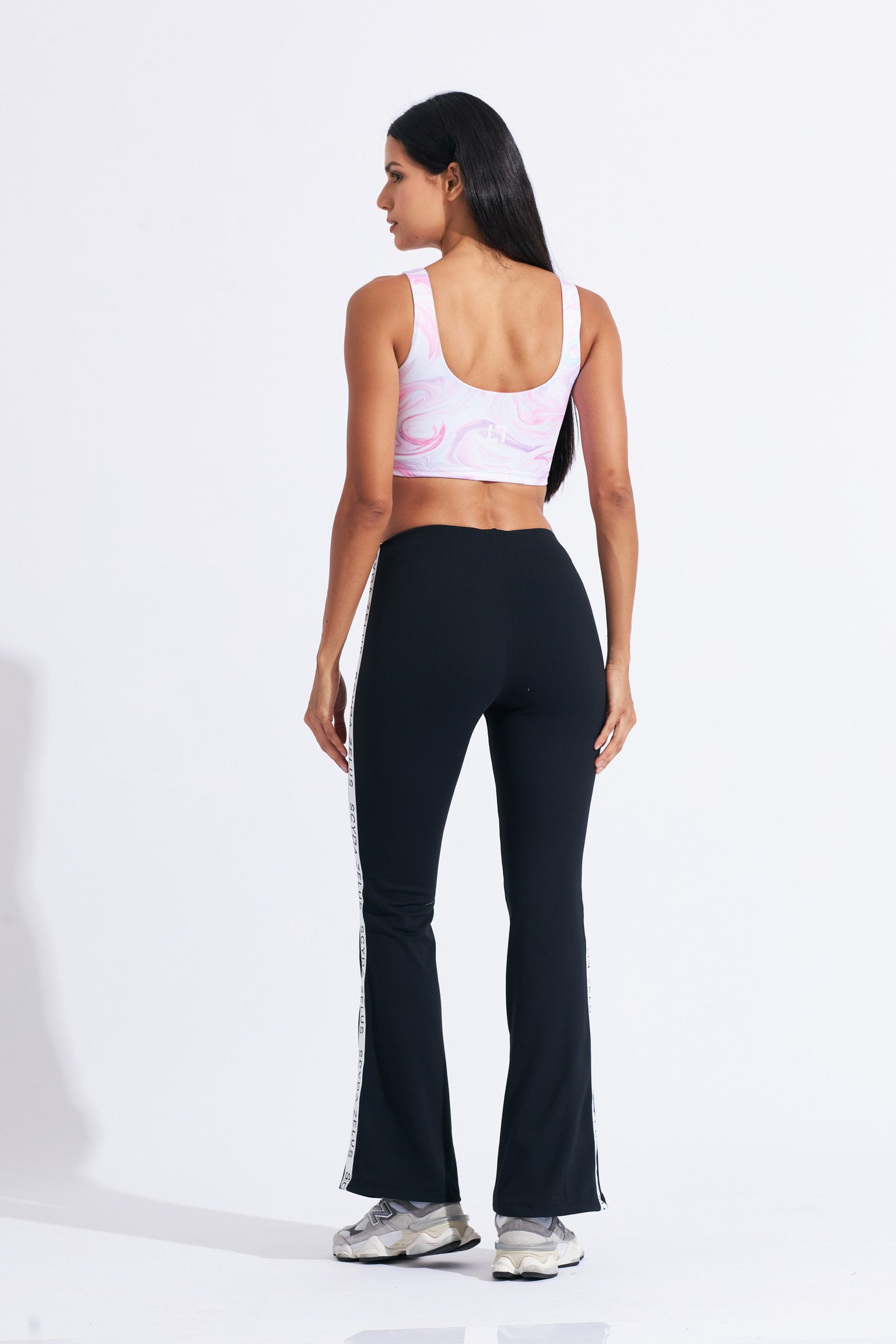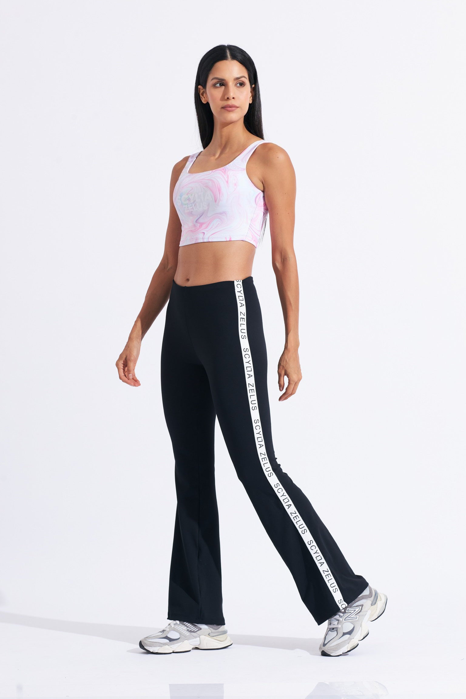 Elevate your athleisure game with these high-rise flare pants featuring a bold SZ elastic side strap. Made from a soft, stretchable nylon-spandex blend, they offer a snug fit through the thighs and a relaxed flare at the hem. Perfect for workouts or everyday wear, with a second-skin feel and all-day comfort.