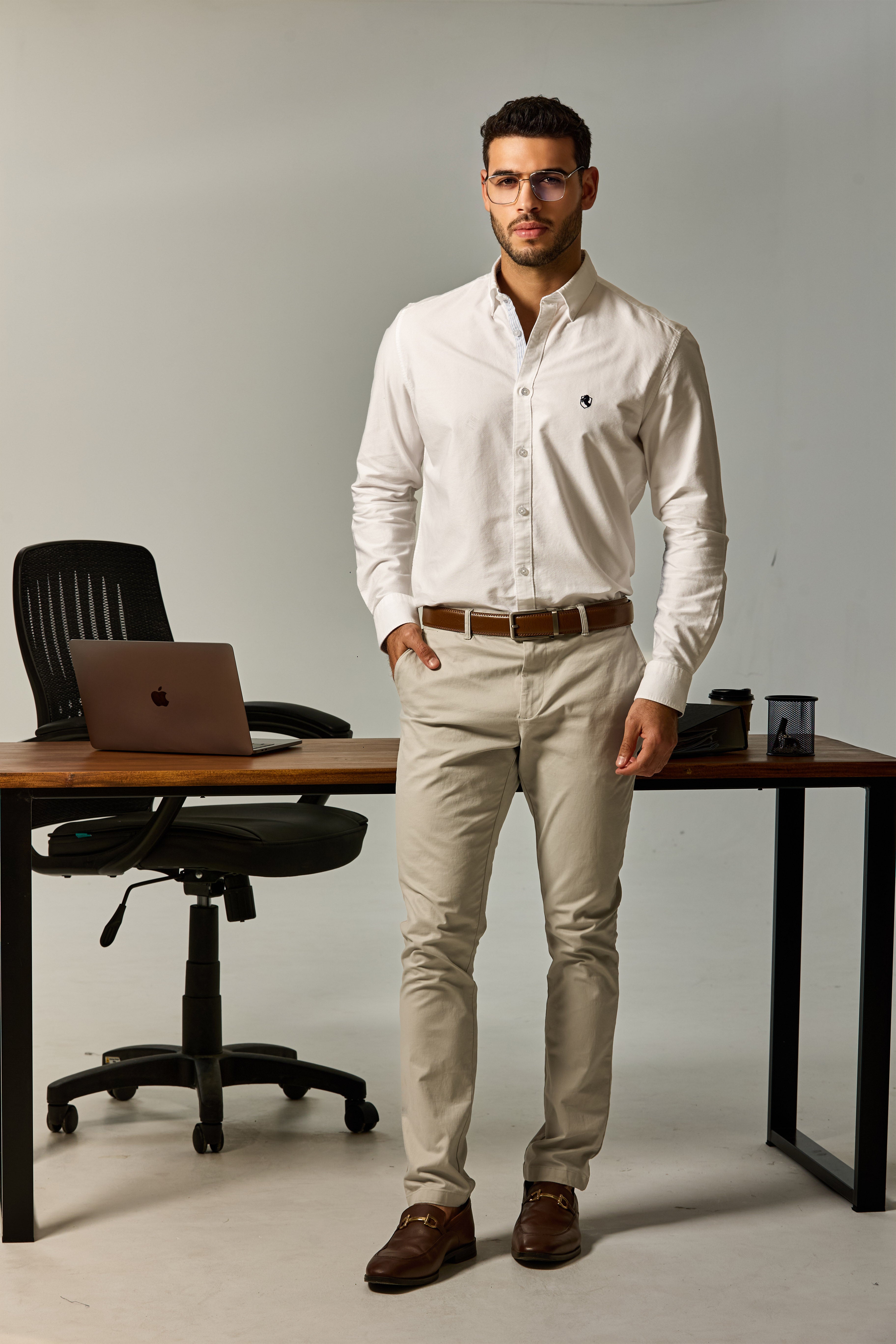 A button-down collar gives the shirt a clean, classic finish, helping it hold its shape throughout the day. The button placket and subtle embroidered chest detail enhance its tailored appearance without overwhelming the design.