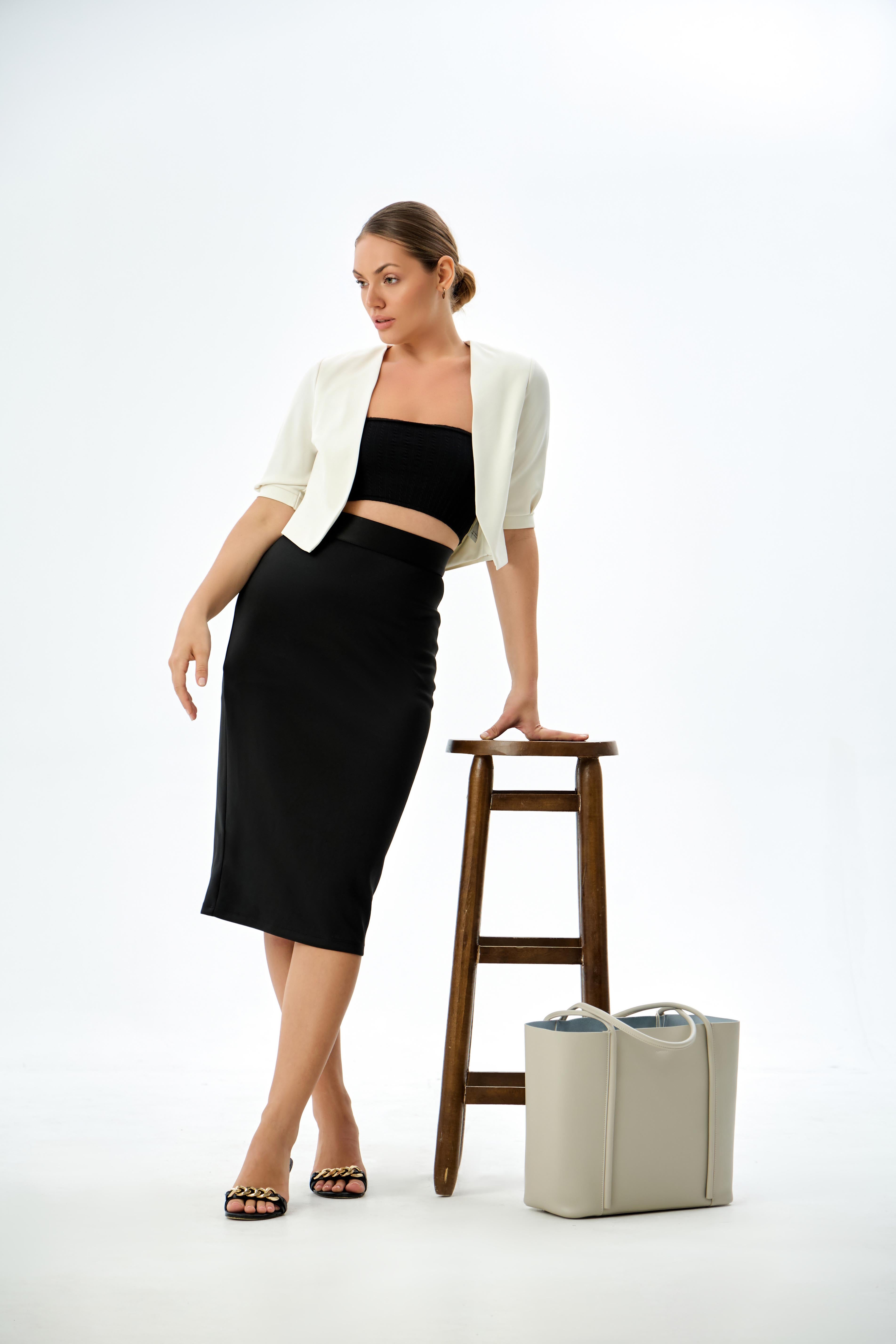 This piece functions as an elegant, minimalist cropped jacket or bolero, designed to provide sophisticated structure and coverage while highlighting the waistline.The fabric appears to be a structured knit, suggesting a comfortable stretch while maintaining a clean, substantial finish.This intentional short length serves to define the waist and perfectly complement high-waisted bottoms.The structured fit in the shoulders contributes to the jacket's polished, professional feel.