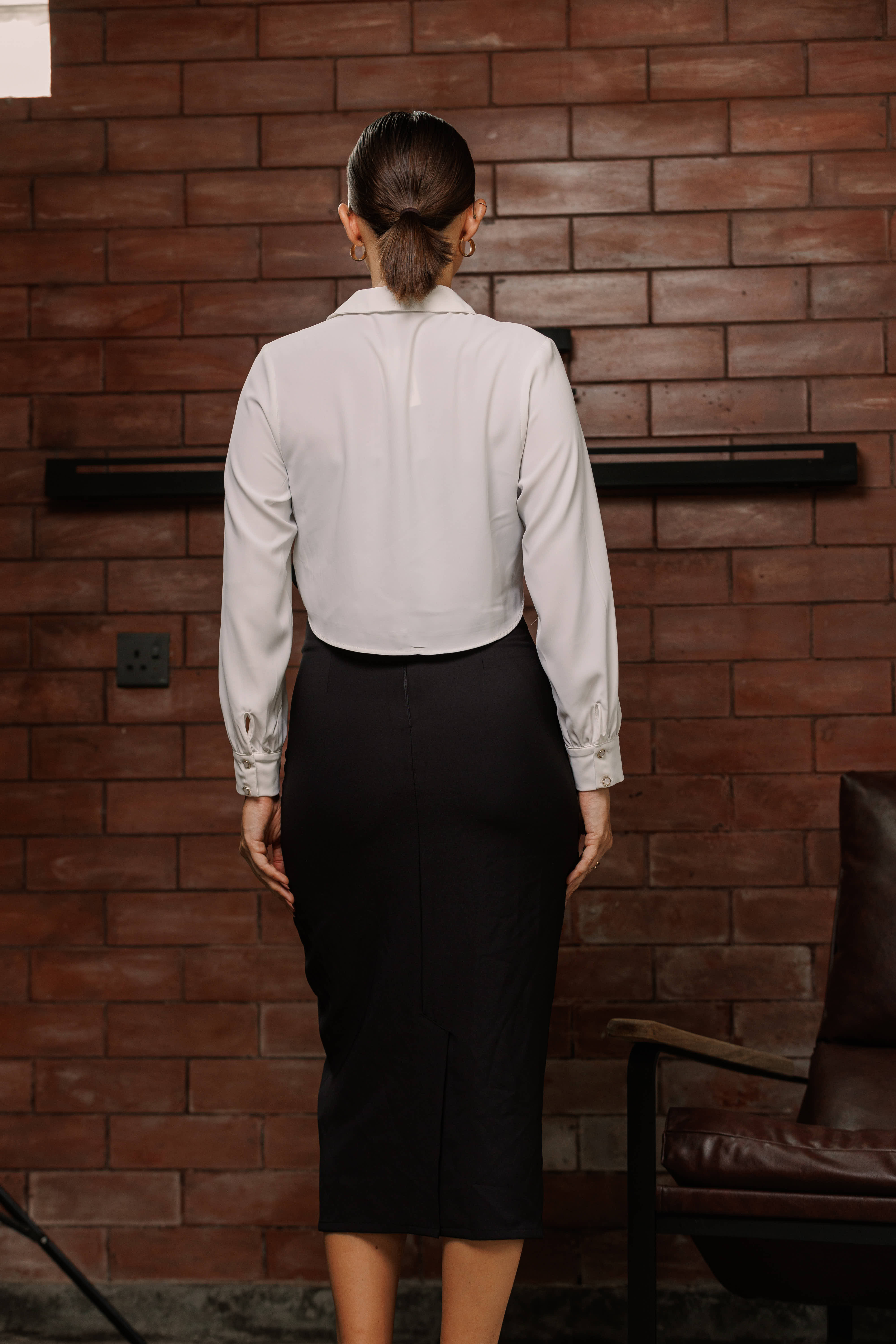 A sleek elbow-length sleeve formal top featuring a solid color design and a hidden placket for a clean, sophisticated finish. Perfect for professional settings, it blends minimal elegance with everyday comfort.”