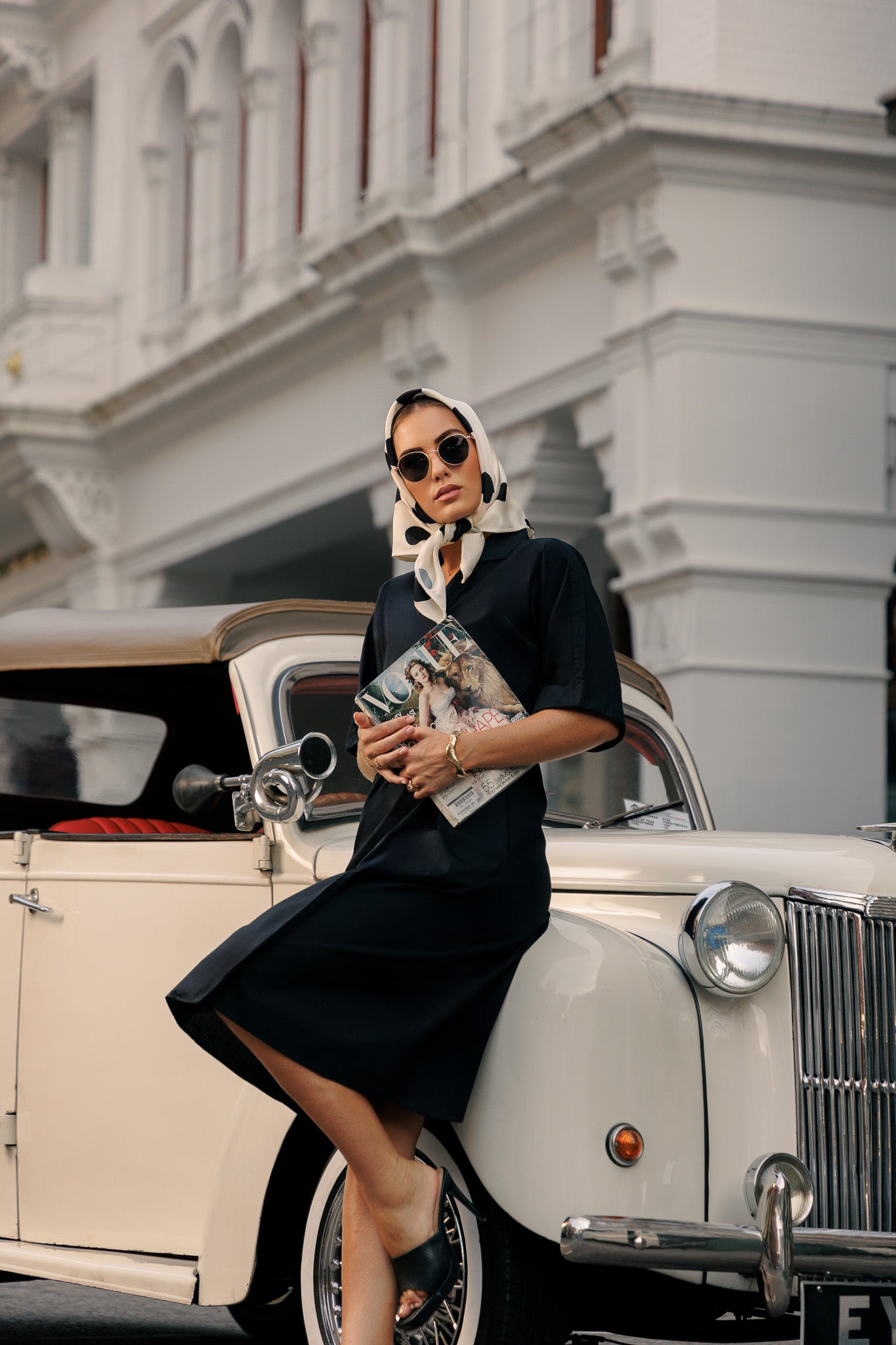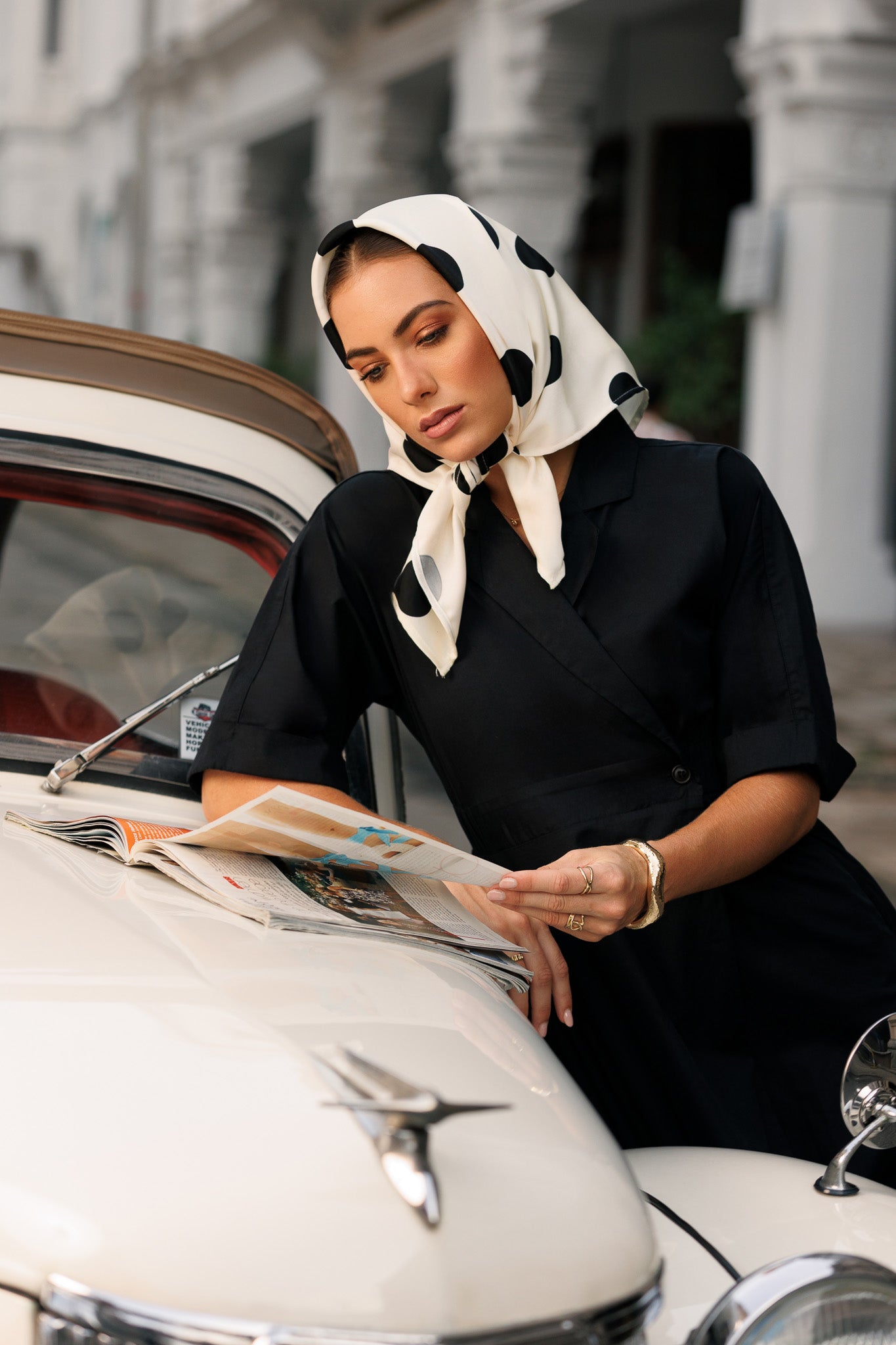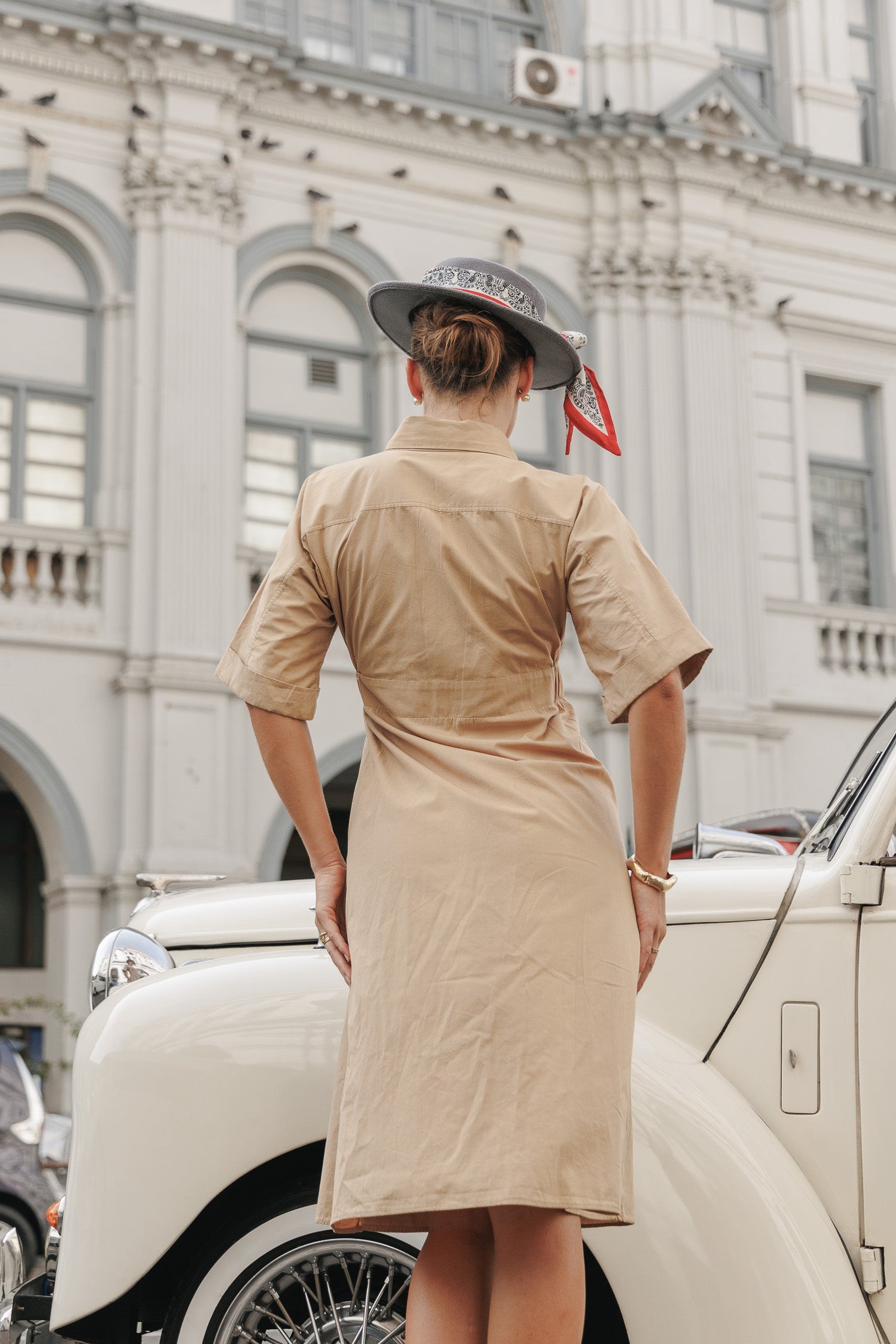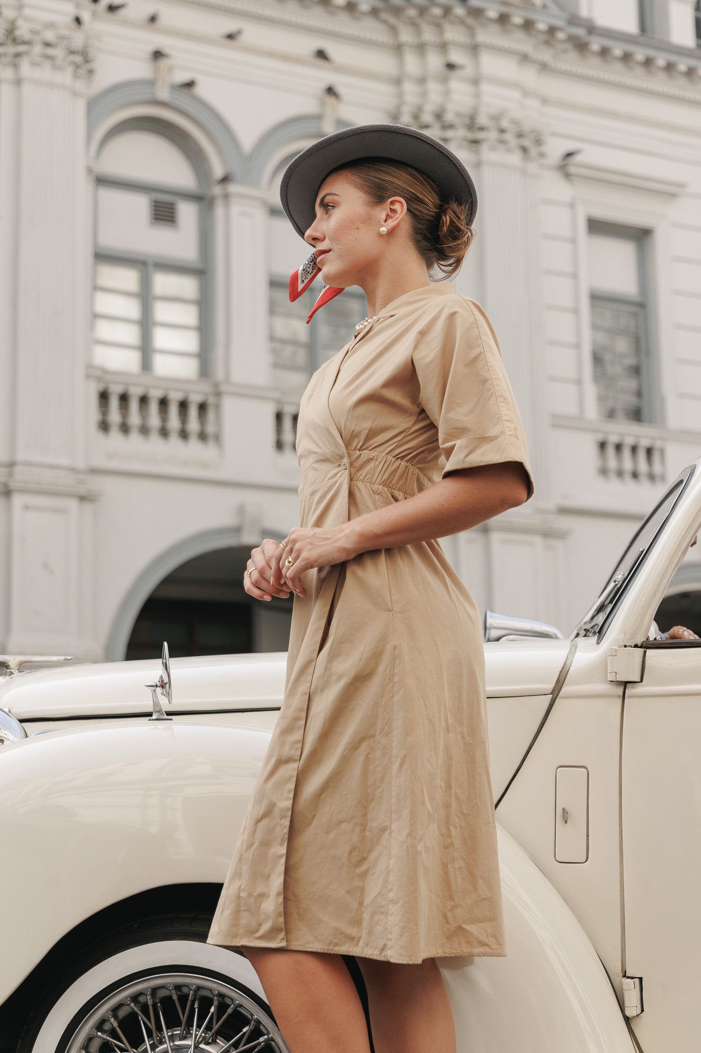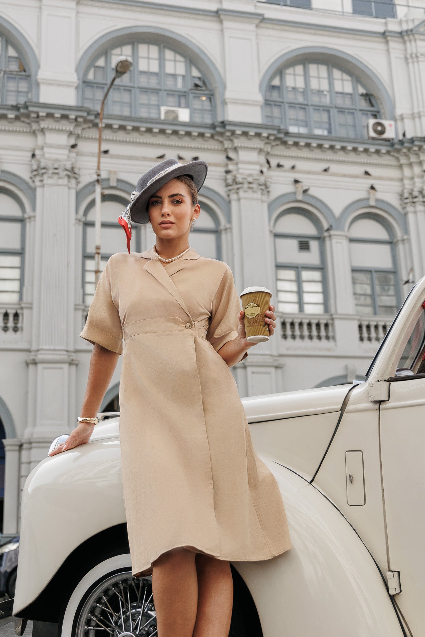 This is a classic midi wrap dress, a versatile and timeless piece. It features a deep V-neckline and short, flowing sleeves. The dress cinches at the waist with a wrap tie, creating a flattering and elegant silhouette with a gently flared, A-line skirt. This outfit is a perfect example of how to use simple, high-quality pieces and carefully chosen accessories to create a look that is both understated and powerfully stylish. The styling methods here emphasize a polished and refined approach, prioritizing clean lines and timeless elegance.The simple yet refined design in a solid, sophisticated color makes it a perfect example of understated luxury and "old money" style.