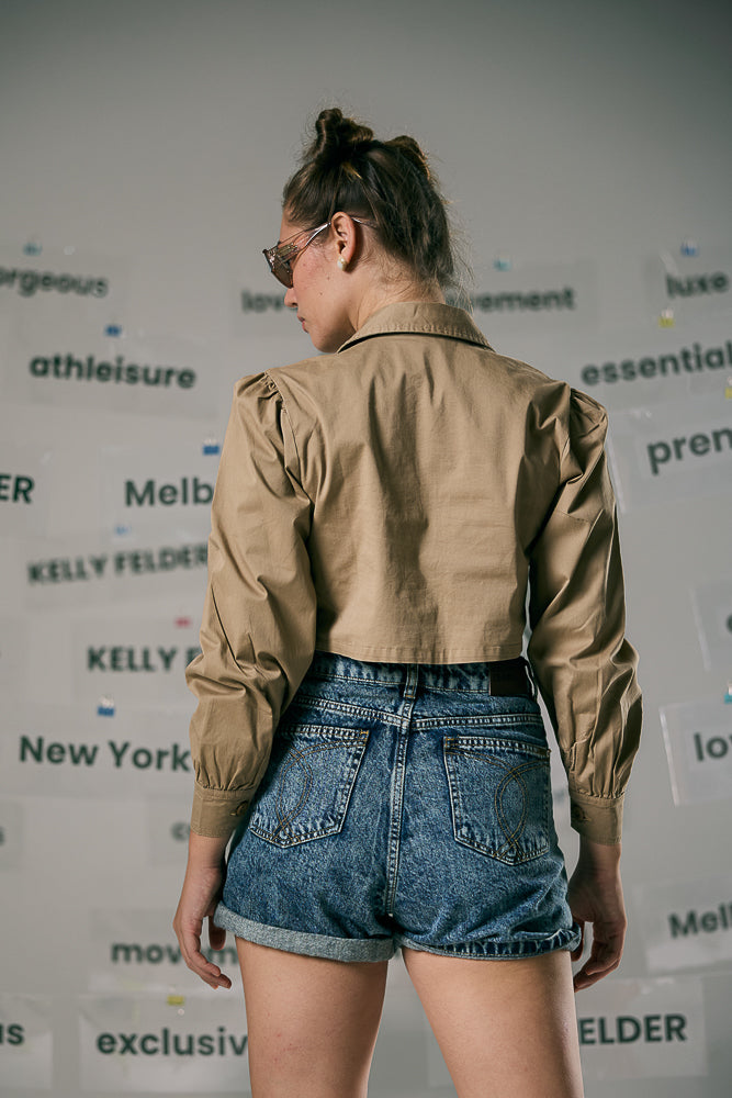 This cropped jacket brings a structured feel with clean, functional details. It features long sleeves with buttoned cuffs, a classic collar, and flap details at the bottom pockets for a utility-inspired touch. The front button closure adds a polished finish, making it easy to wear open or closed. Designed with a sharp silhouette, it offers a versatile layer that works across season