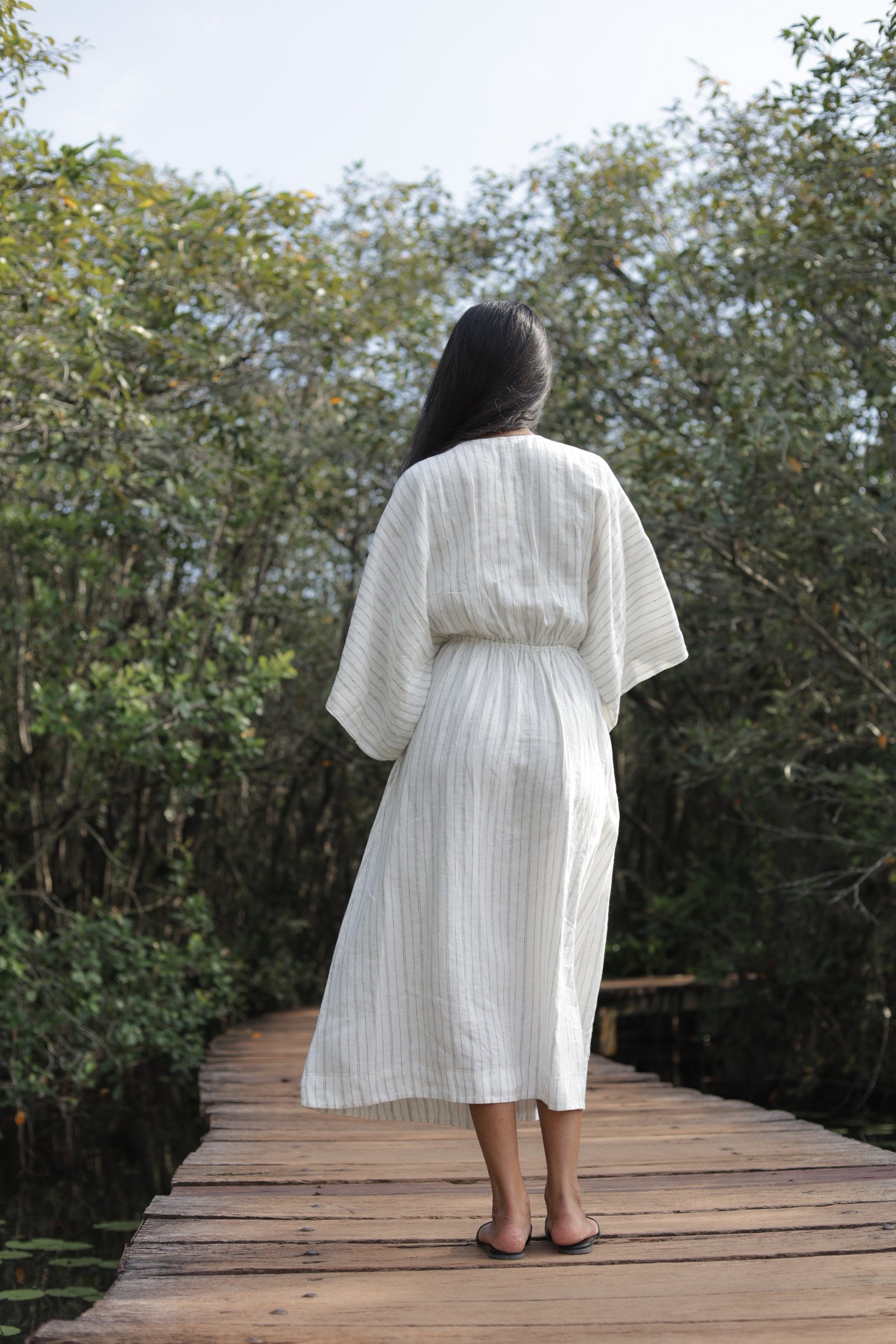 Crafted from 100% linen, this striped midi kaftan dress offers breathable comfort and effortless elegance. The relaxed silhouette is cinched at the waist with soft elastic, creating a flattering shape while maintaining ease of movement. Lightweight and airy, it’s perfect for warm-weather days, beach outings, or casual gatherings. With its timeless stripes and natural texture, this dress brings together laid-back charm and refined simplicity for an effortlessly stylish look.