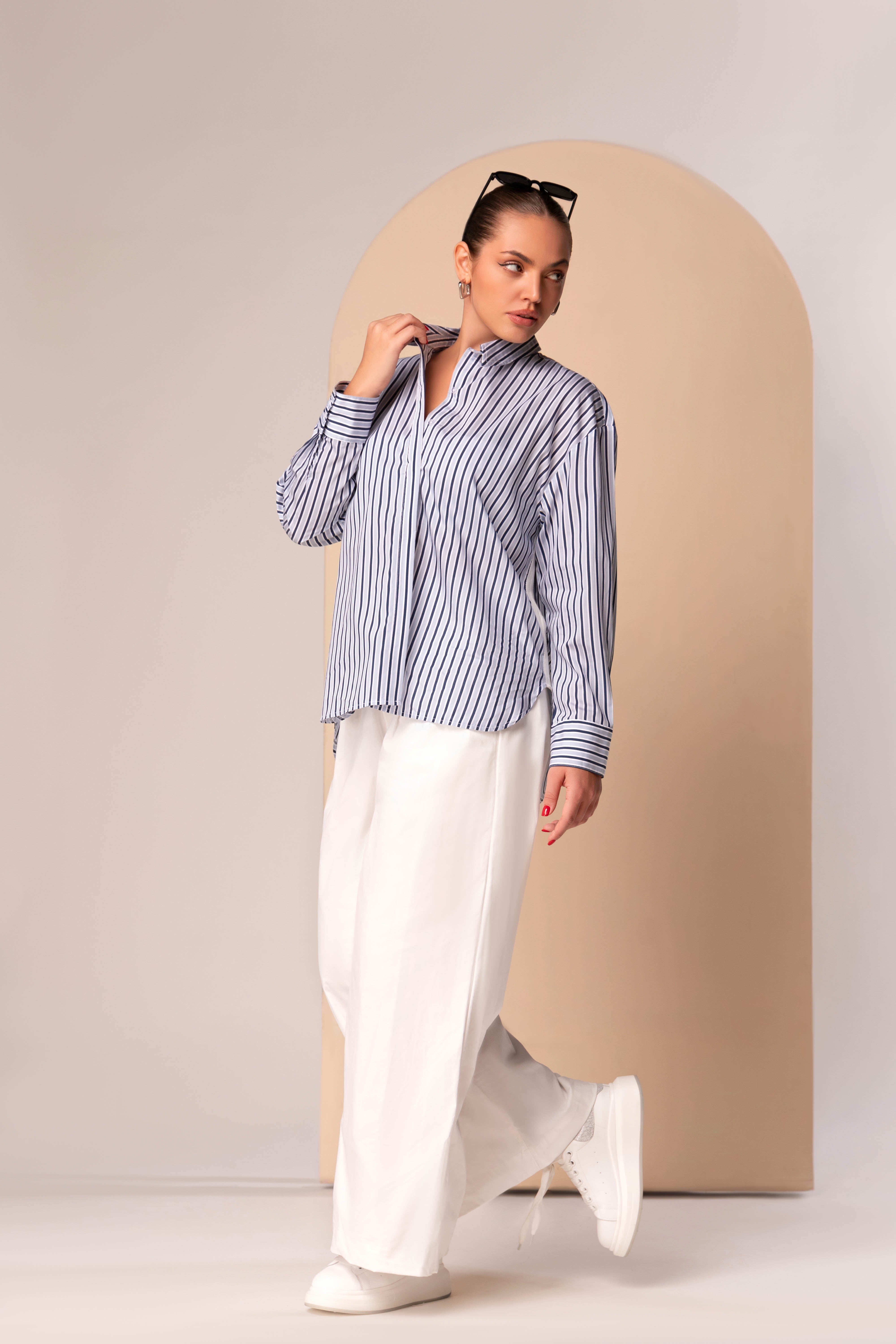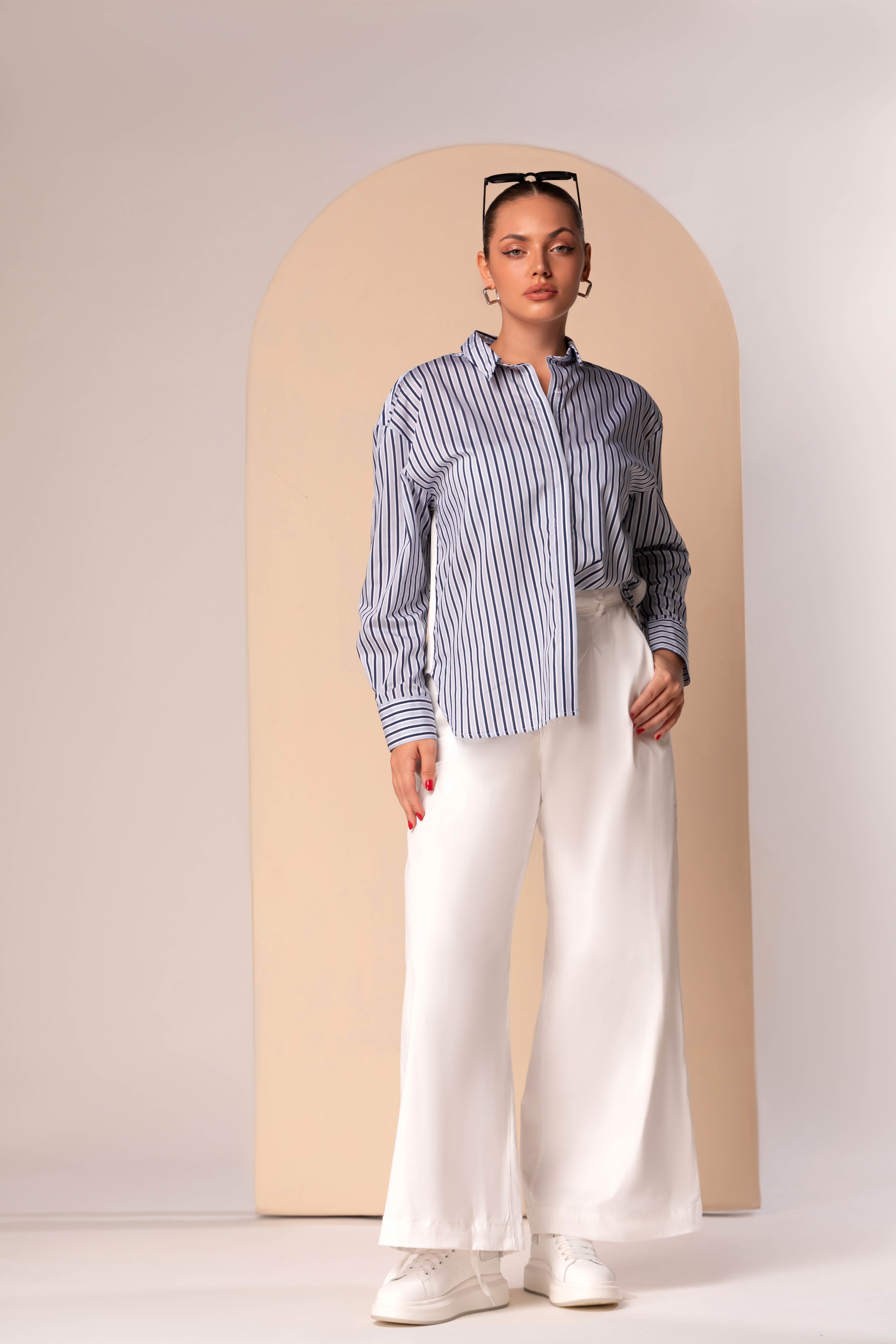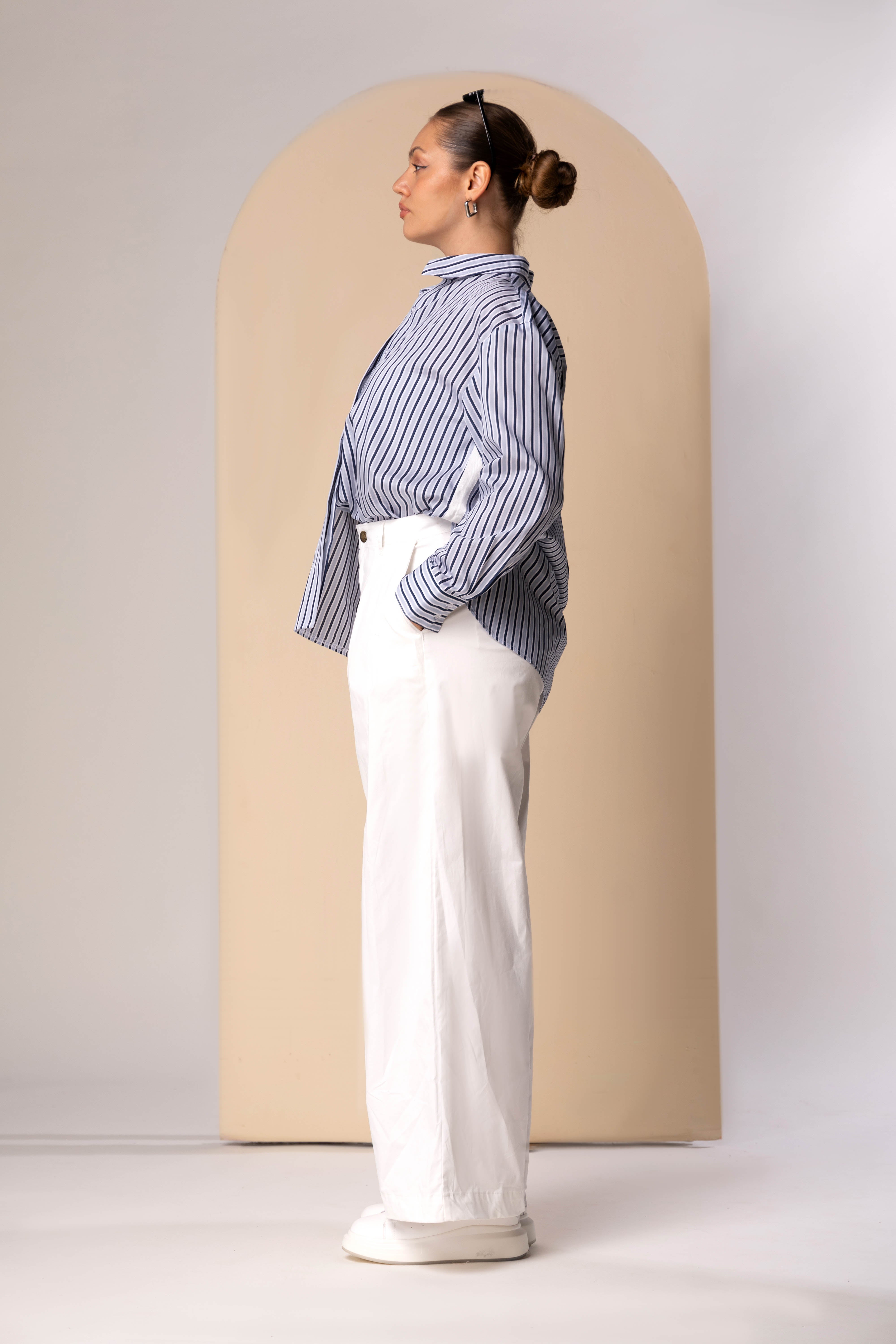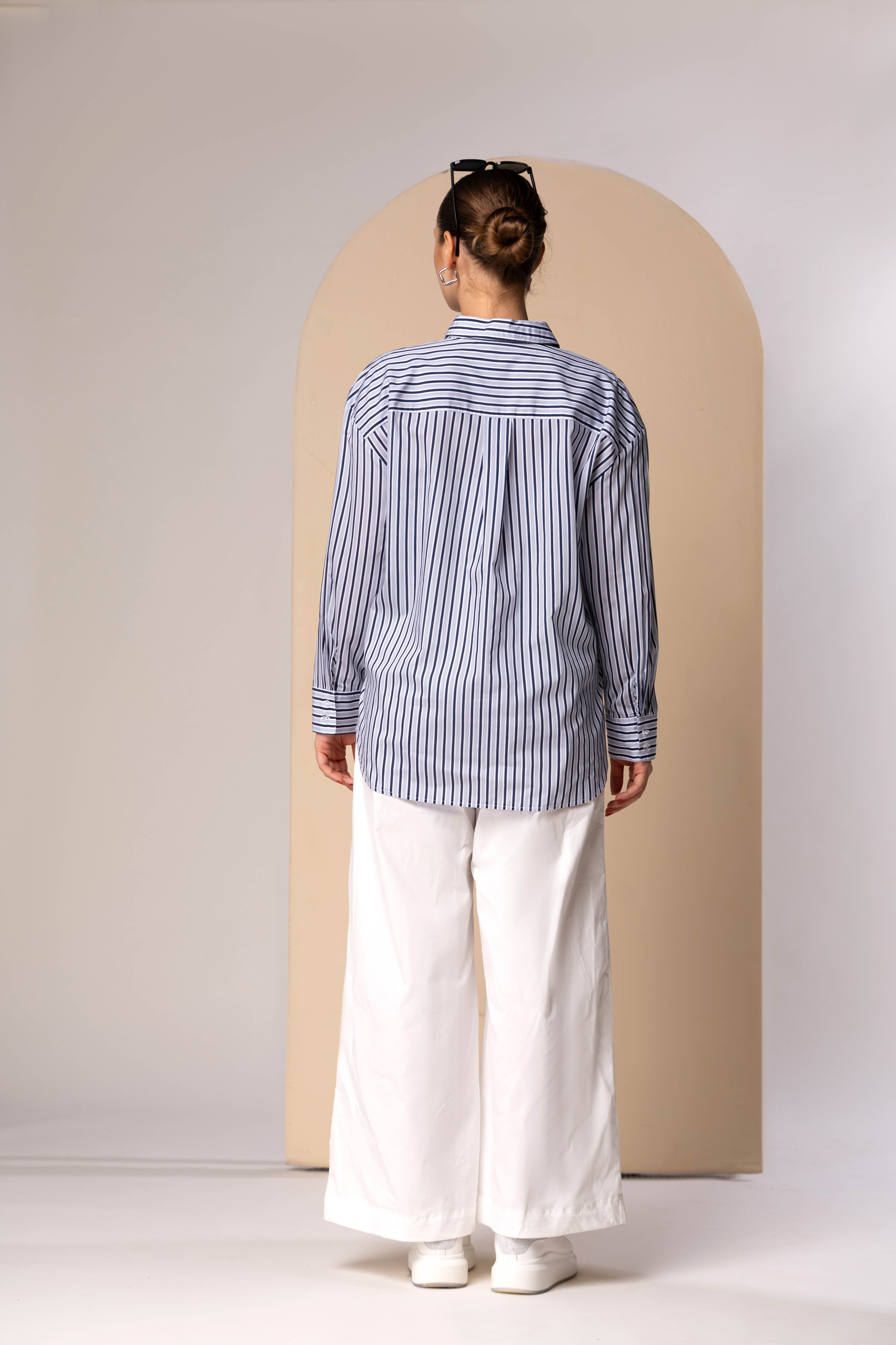 This ensemble centers on an oversized multi-stripe button-down, which reimagines the classic corporate pinstripe with a bolder, more energetic color palette. The top is styled with an intentional "off-duty" ease, featuring a relaxed drop-shoulder and an unbuttoned collar that leans into a contemporary, fluid aesthetic. By pairing this voluminous, structured top with a sleek, form-fitting black mini skirt, the outfit creates a balanced silhouette that is both authoritative and agile. The look is grounded with pristine white platform sneakers and minimalist tech-inspired eyewear, reinforcing a "commuter-chic" narrative for the modern professional who values high-speed mobility without sacrificing tailored polish.