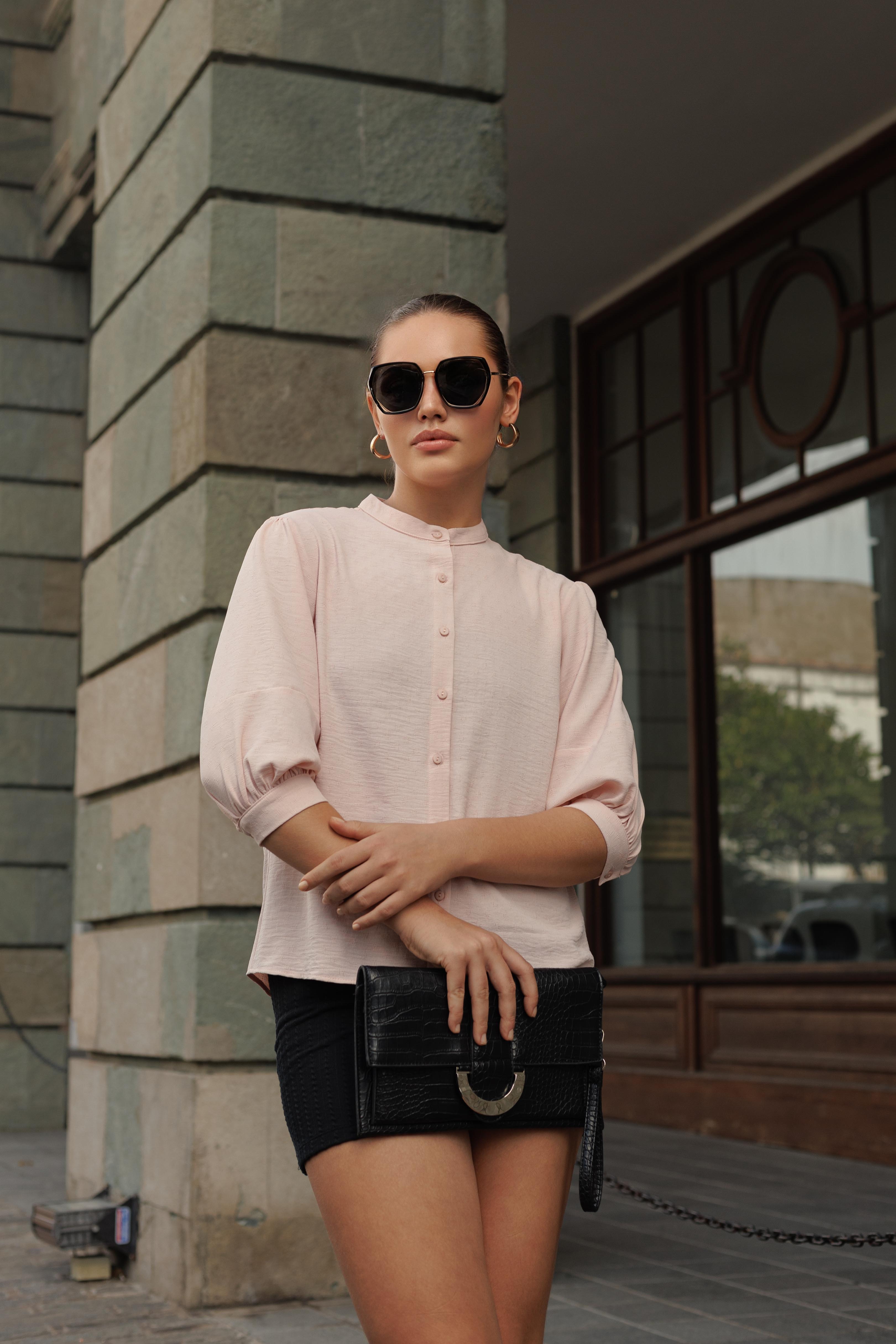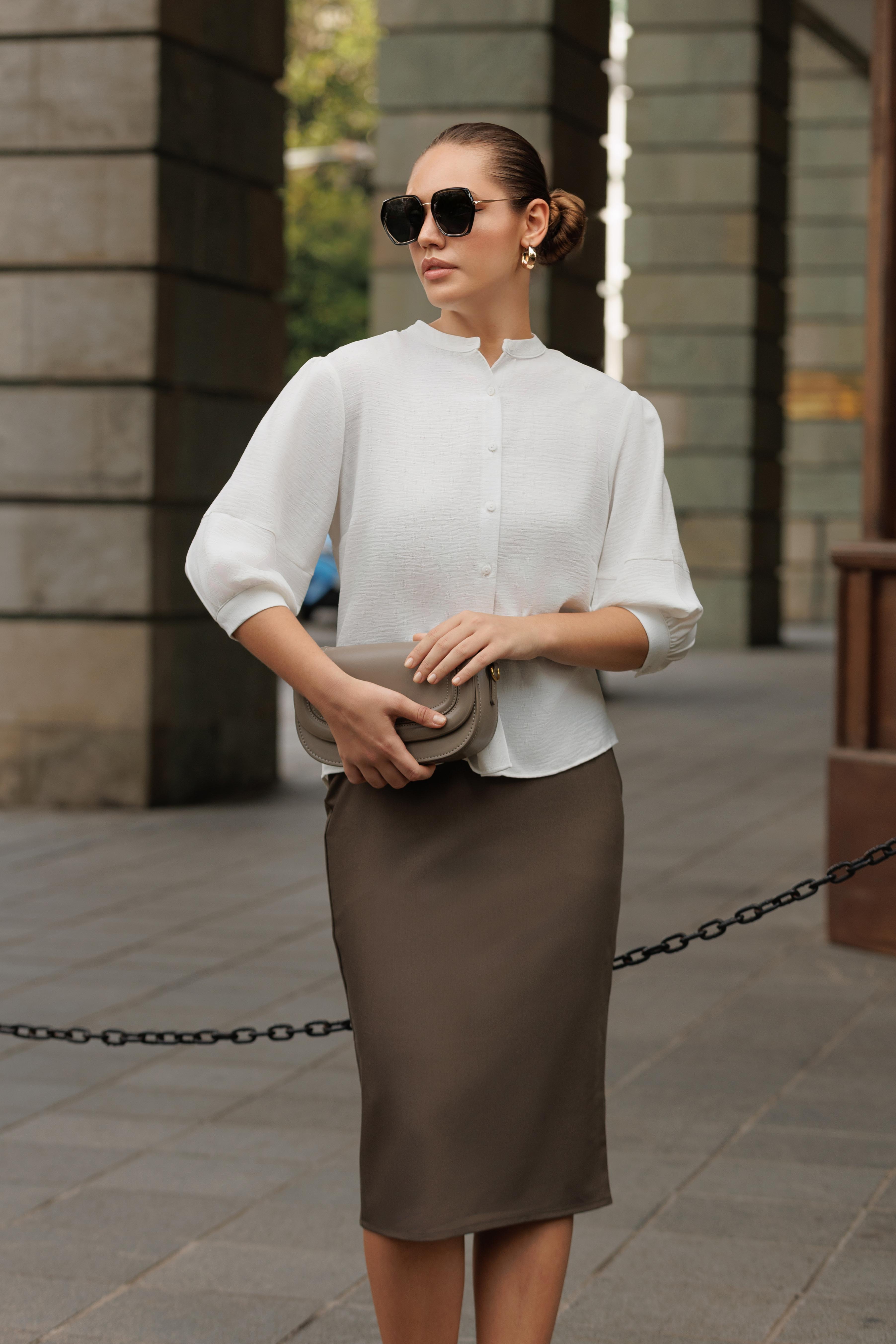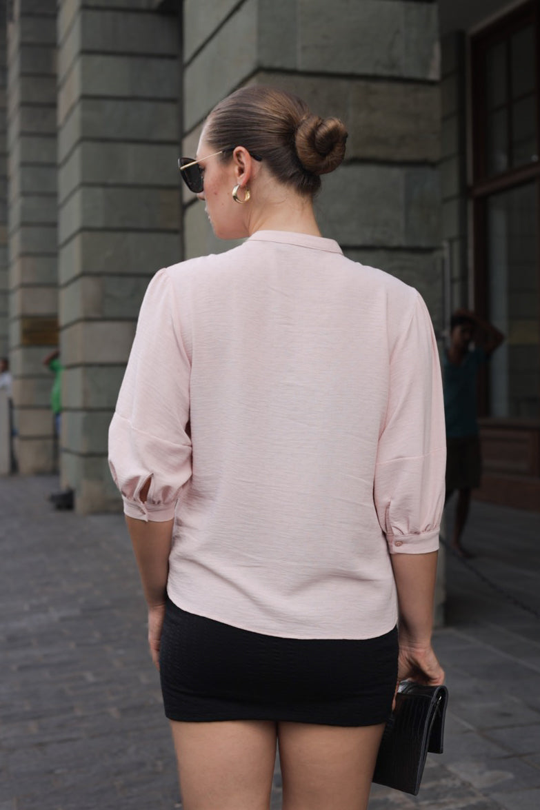 The most distinctive elements are the sleeves, which are 3/4 length and have a slight billow or puff effect, cinched at the elbow with gentle gathering. The overall fit is loose and breezy, creating a feminine and elegant look that contrasts nicely with the black mini-skirt.