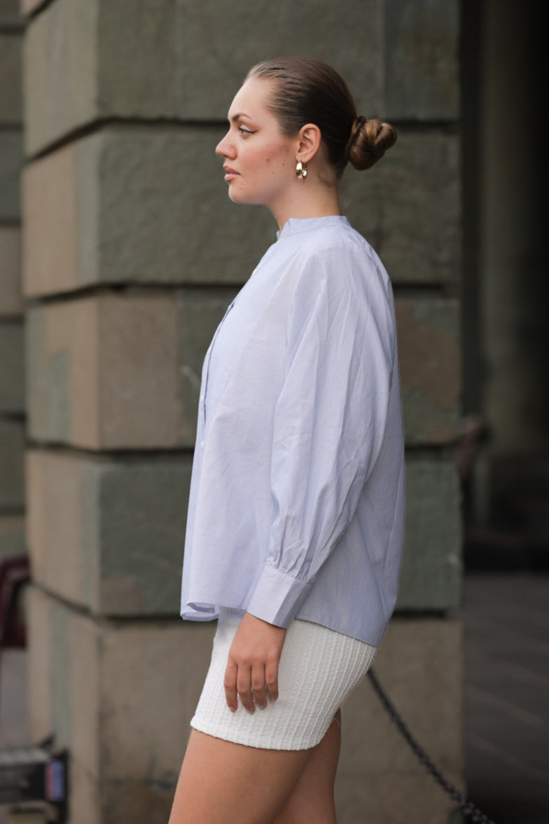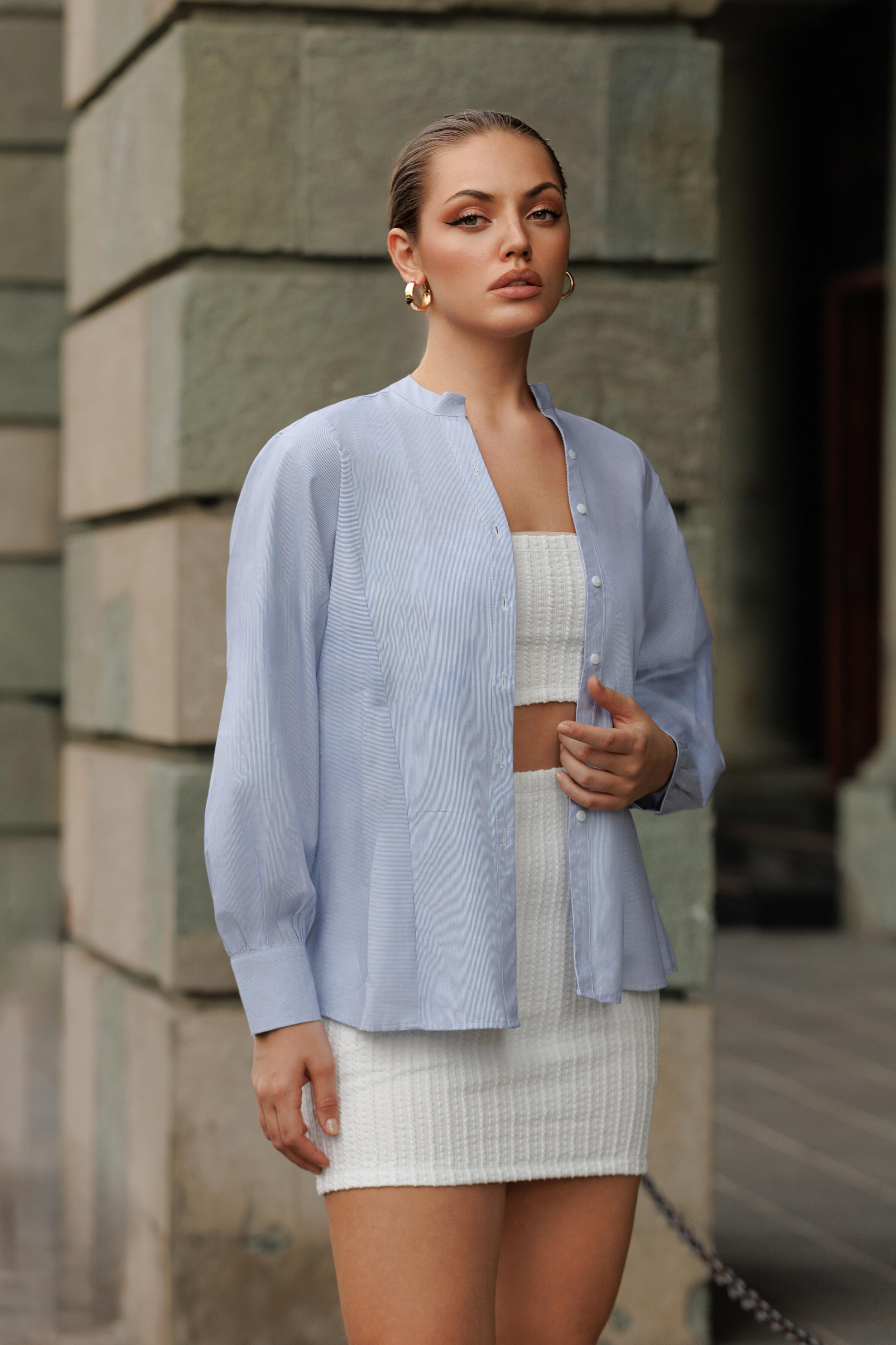 This elegant top blends classic refinement with a modern touch. It features a narrow V-split neckline that flows into a button-down front, offering a clean and structured look. The full sleeves are gathered at the cuffs for soft volume, balancing professionalism with ease. Crafted from a lightweight, breathable fabric, it drapes gracefully while maintaining a refined silhouette, ideal for polished office wear or effortless everyday sophistication.